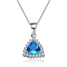 A crystal blue cubic zirconia stone surrounded by clear cubic zirconias are the main attraction of this sterling silver necklace. A nice piece for formal events.