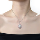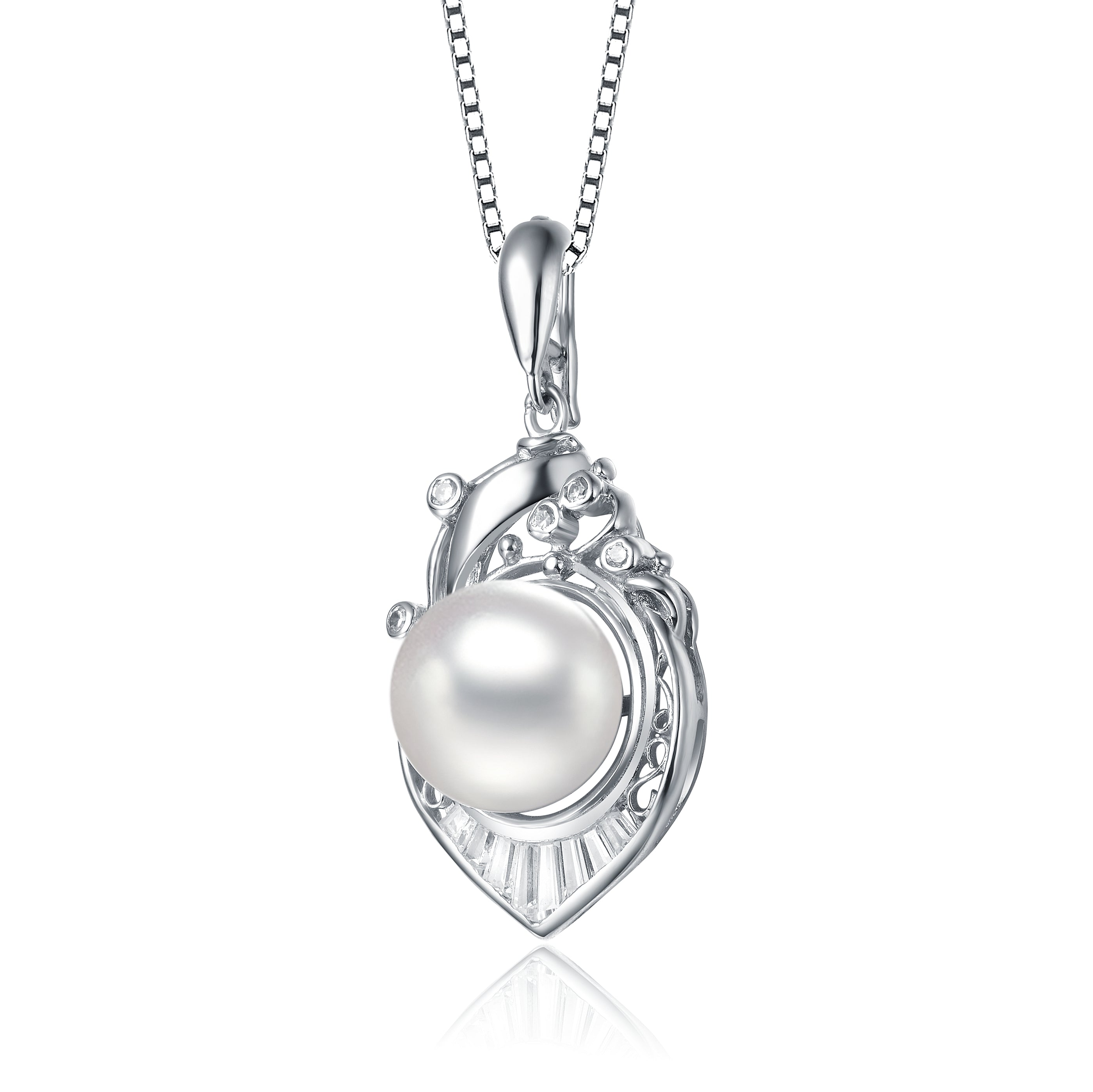 This sophisticated pendant features a lustrous pearl set in the center of an intricately designed sterling silver frame. The frame is adorned with sparkling cubic zirconia stones that accentuate the pearl’s natural beauty. The pendant hangs gracefully from a delicate sterling silver chain, making it an exquisite piece of jewelry suitable for any elegant occasion.