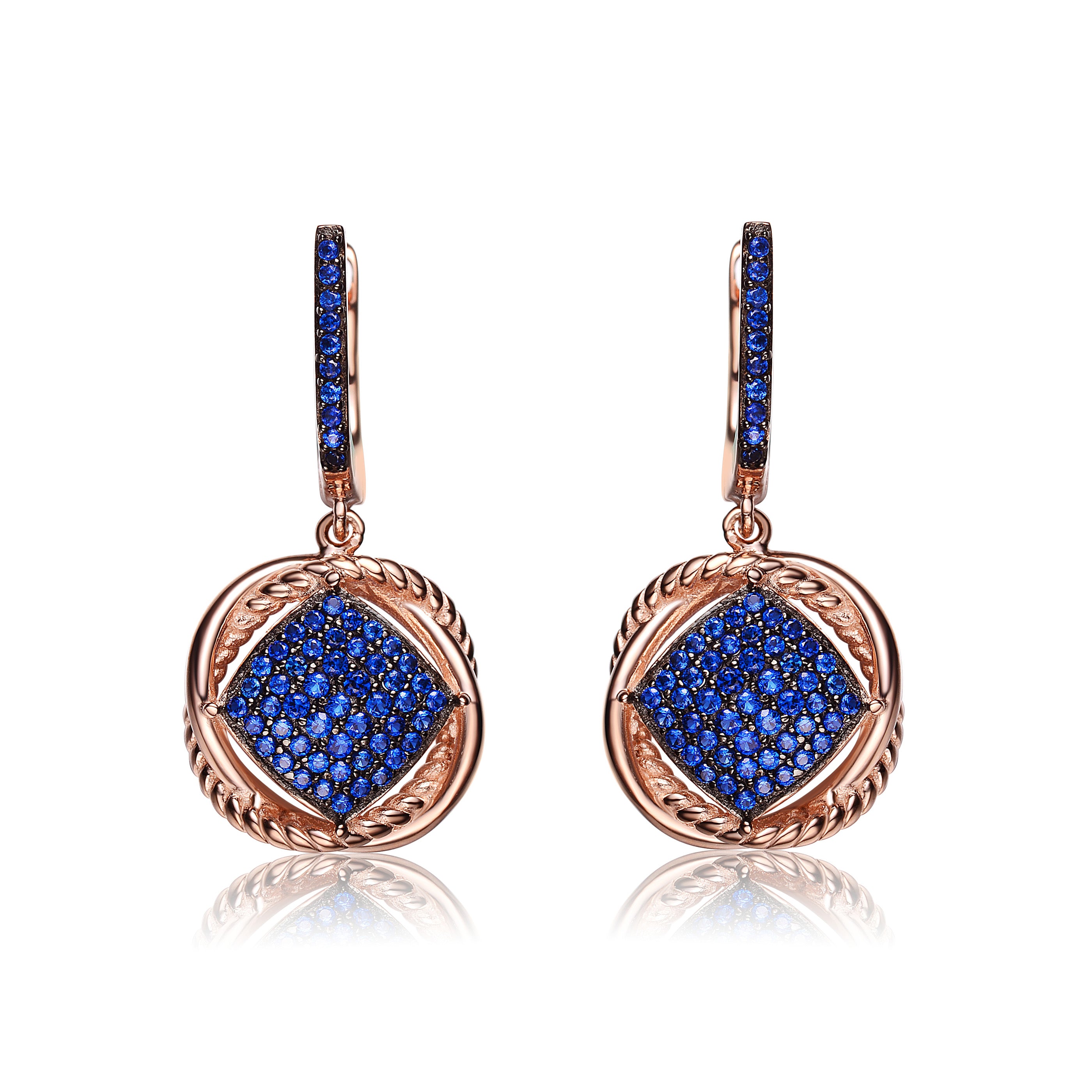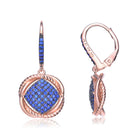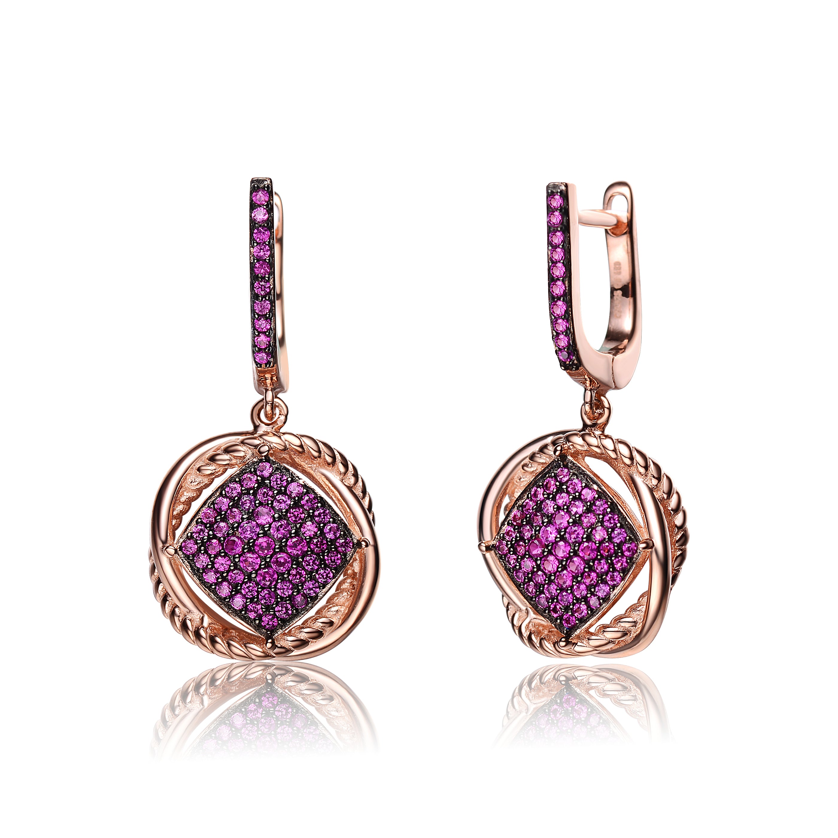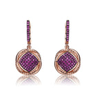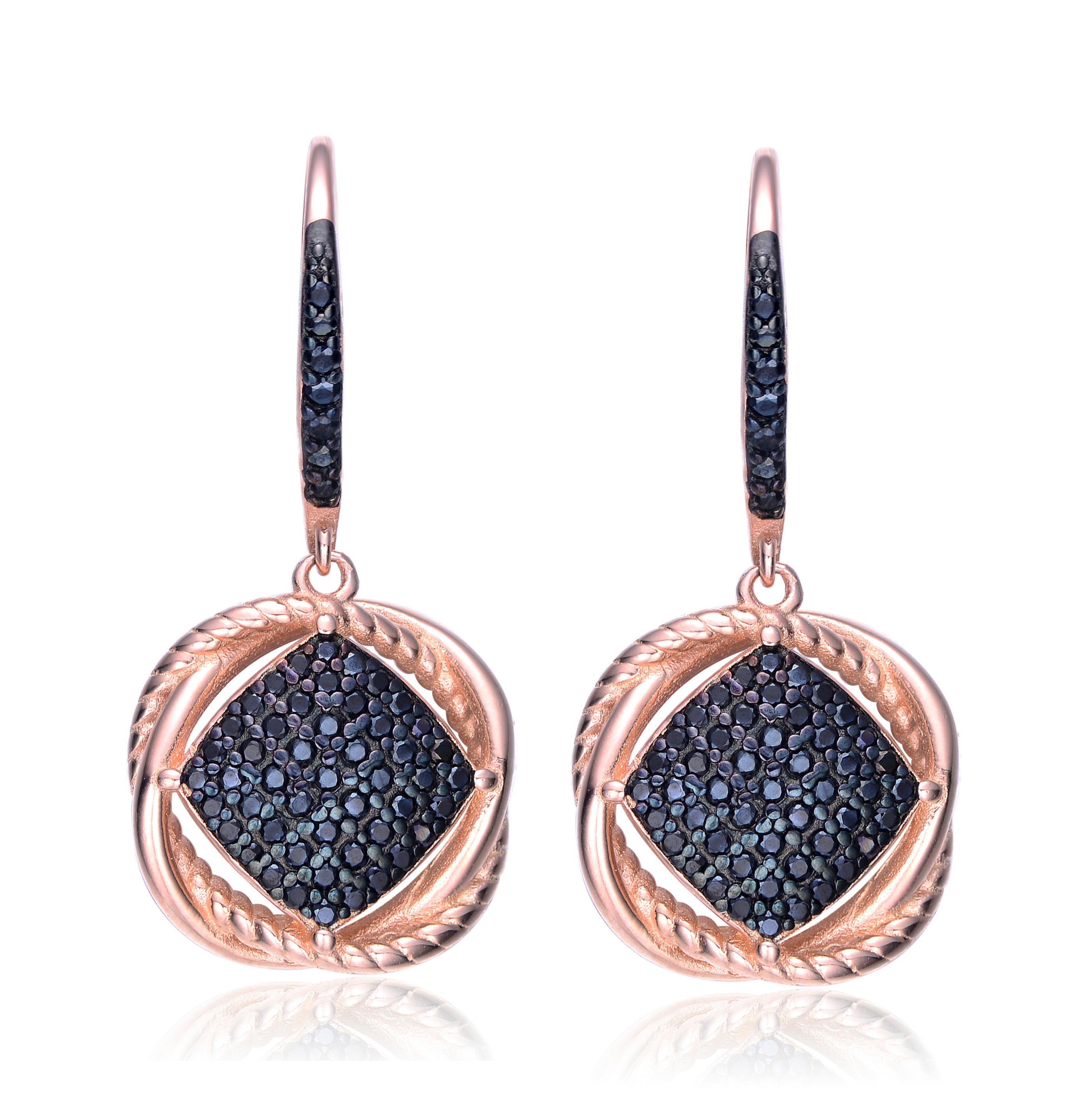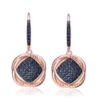Sterling Silver 18K Rose Gold Overlay and Black Plated. These dainty round dangling earrings are decorated with dazzling black round-cut cubic zirconia stones. Crafted of .925 sterling silver, with rose and black plating, the earrings secure with clip-in clasps. Also available in different stone colors.