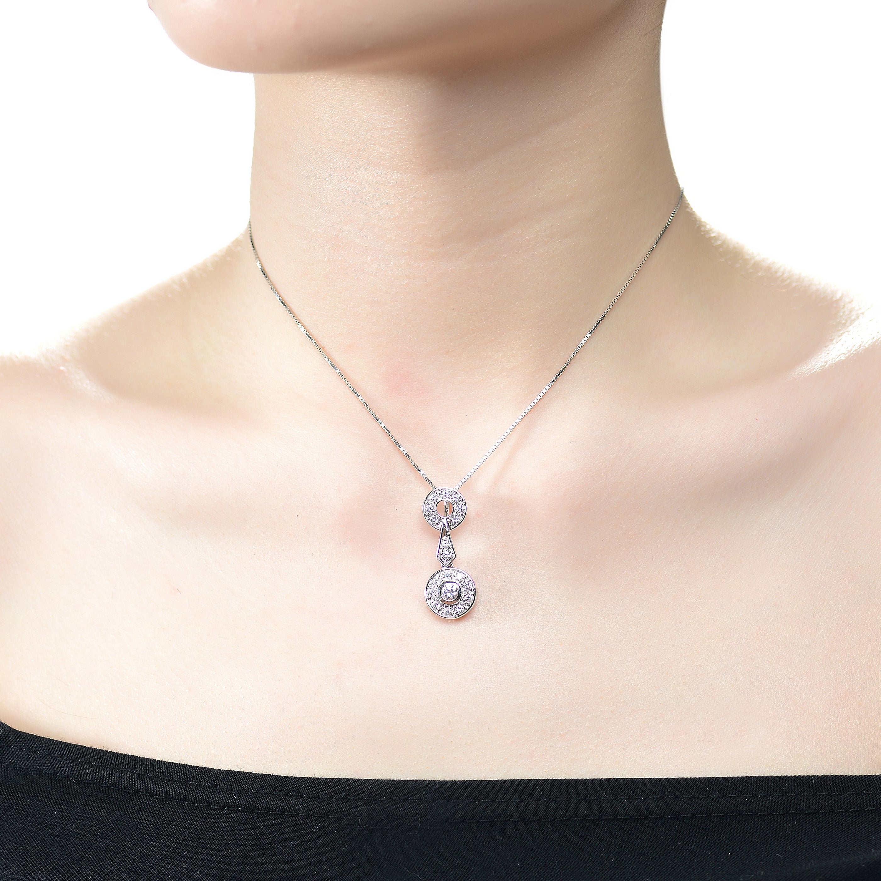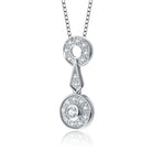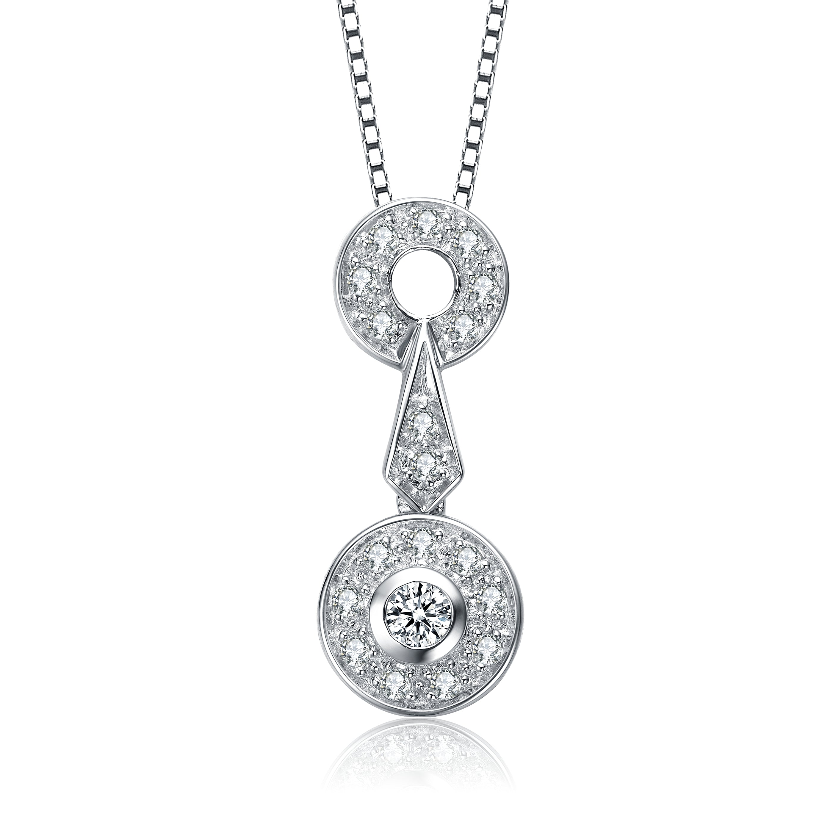 This sophisticated pendant features two concentric circles made of sterling silver, each adorned with sparkling cubic zirconia stones. The upper circle is smaller and serves as the anchor point for the pendant, while the larger lower circle encases a prominent cubic zirconia at its center, creating a dazzling focal point. The pendant hangs gracefully from a classic sterling silver chain, making it an exquisite piece of jewelry suitable for various occasions. Its design offers a blend of timeless elegance and modern charm, perfect for adding a touch of luxury to any outfit.