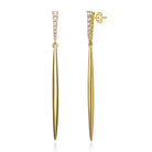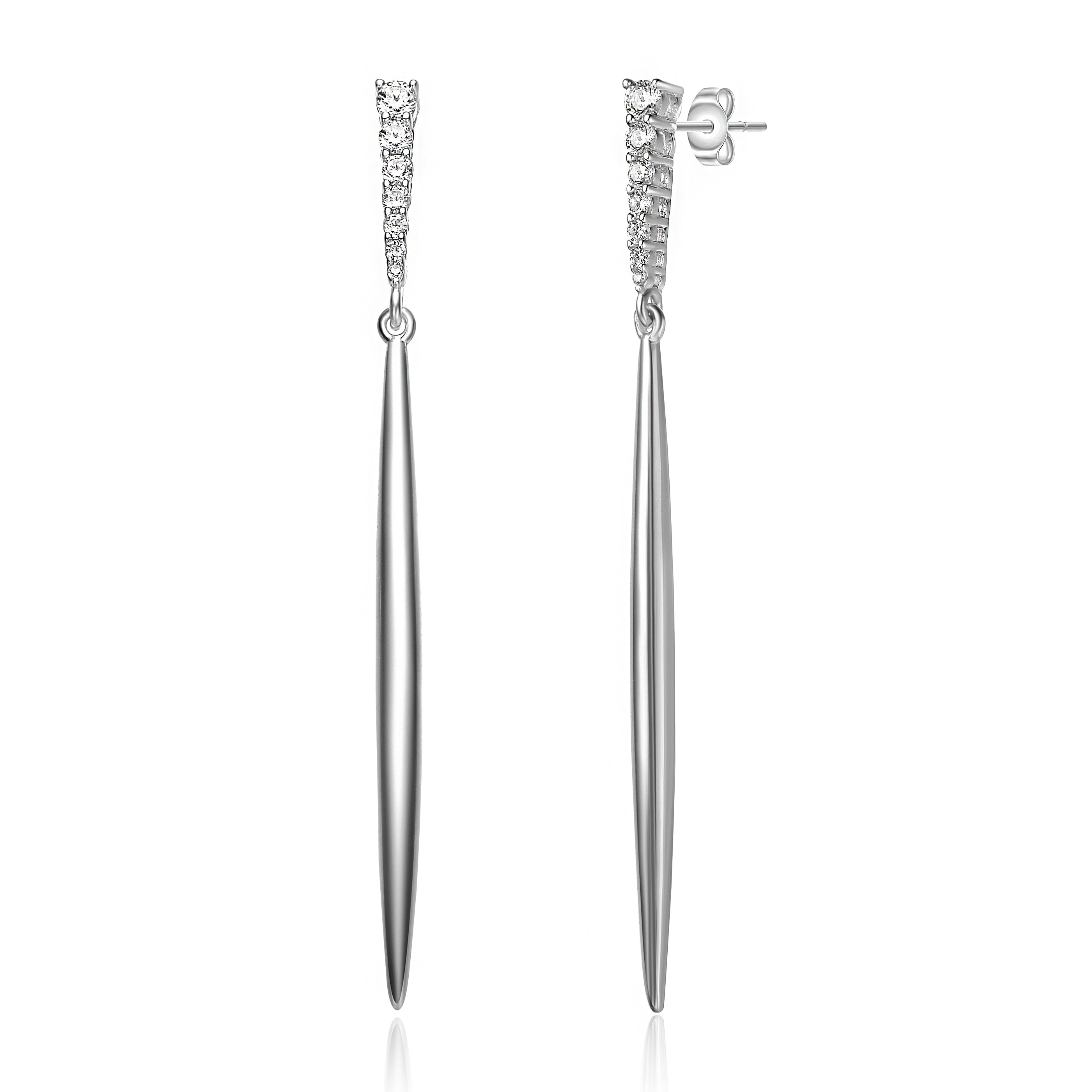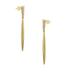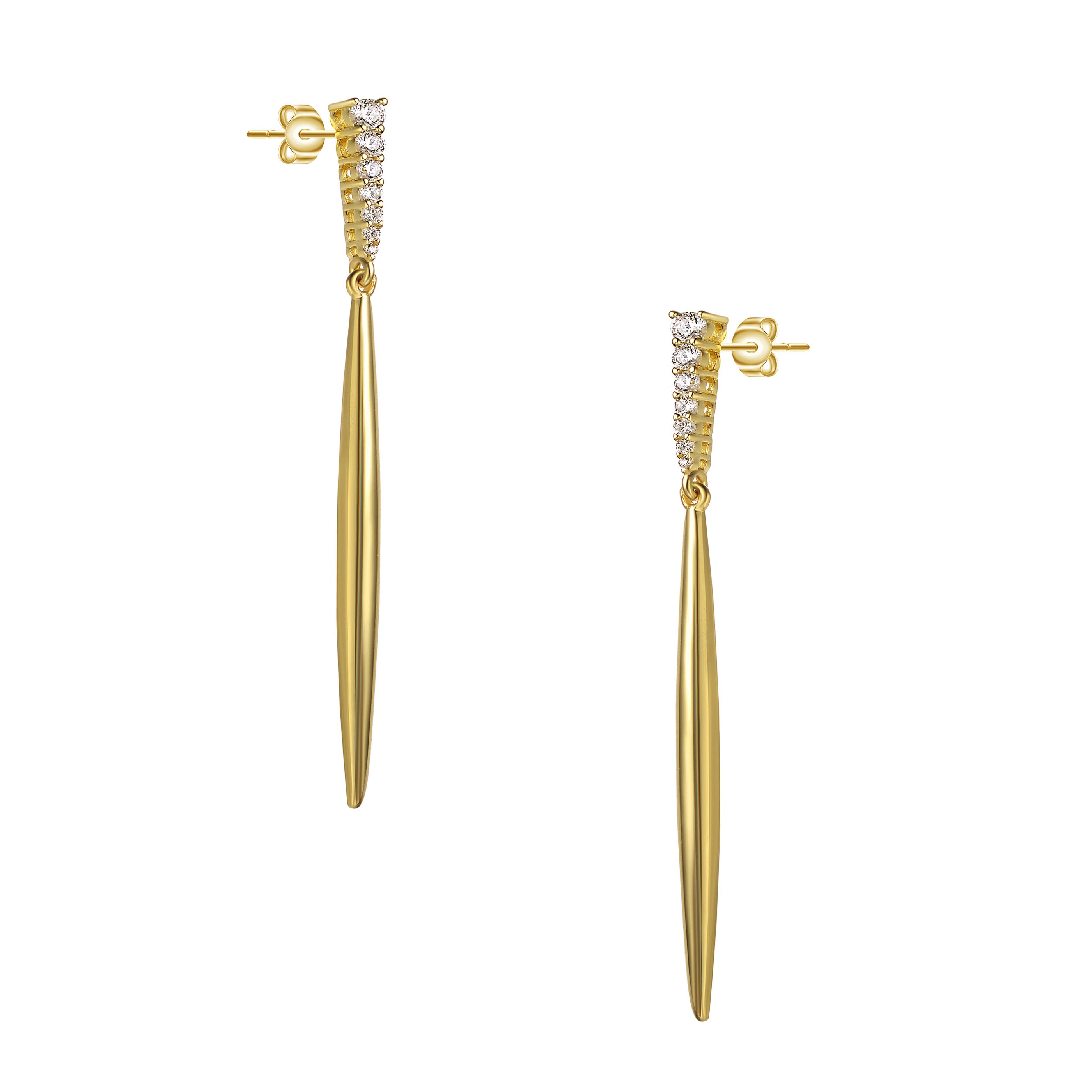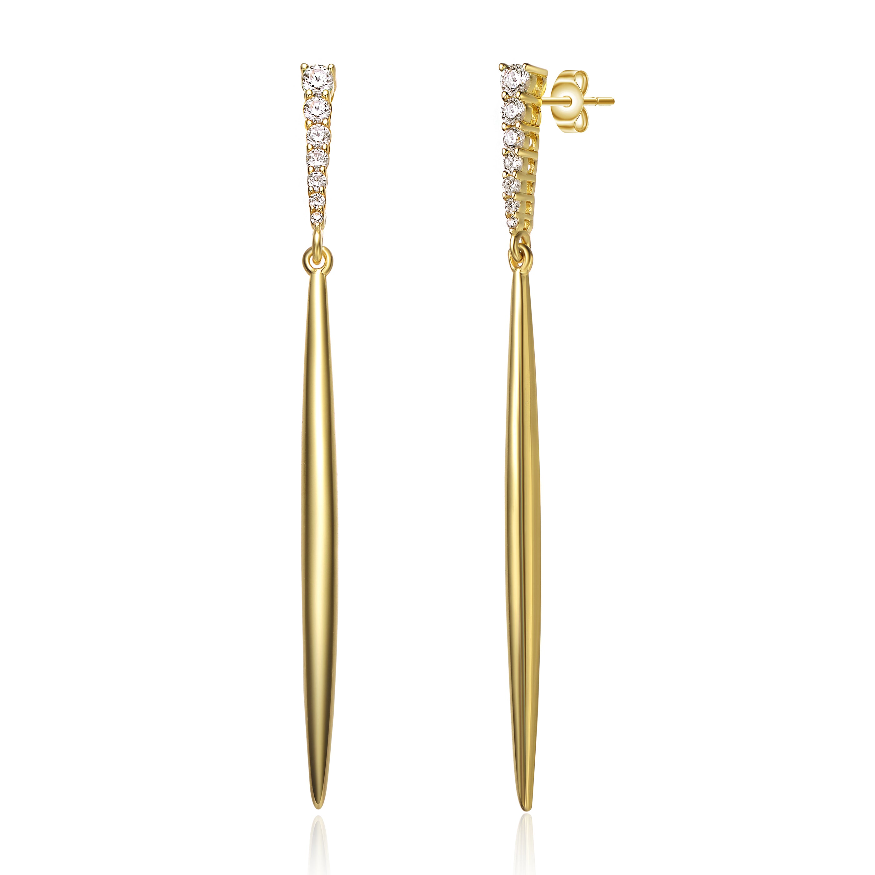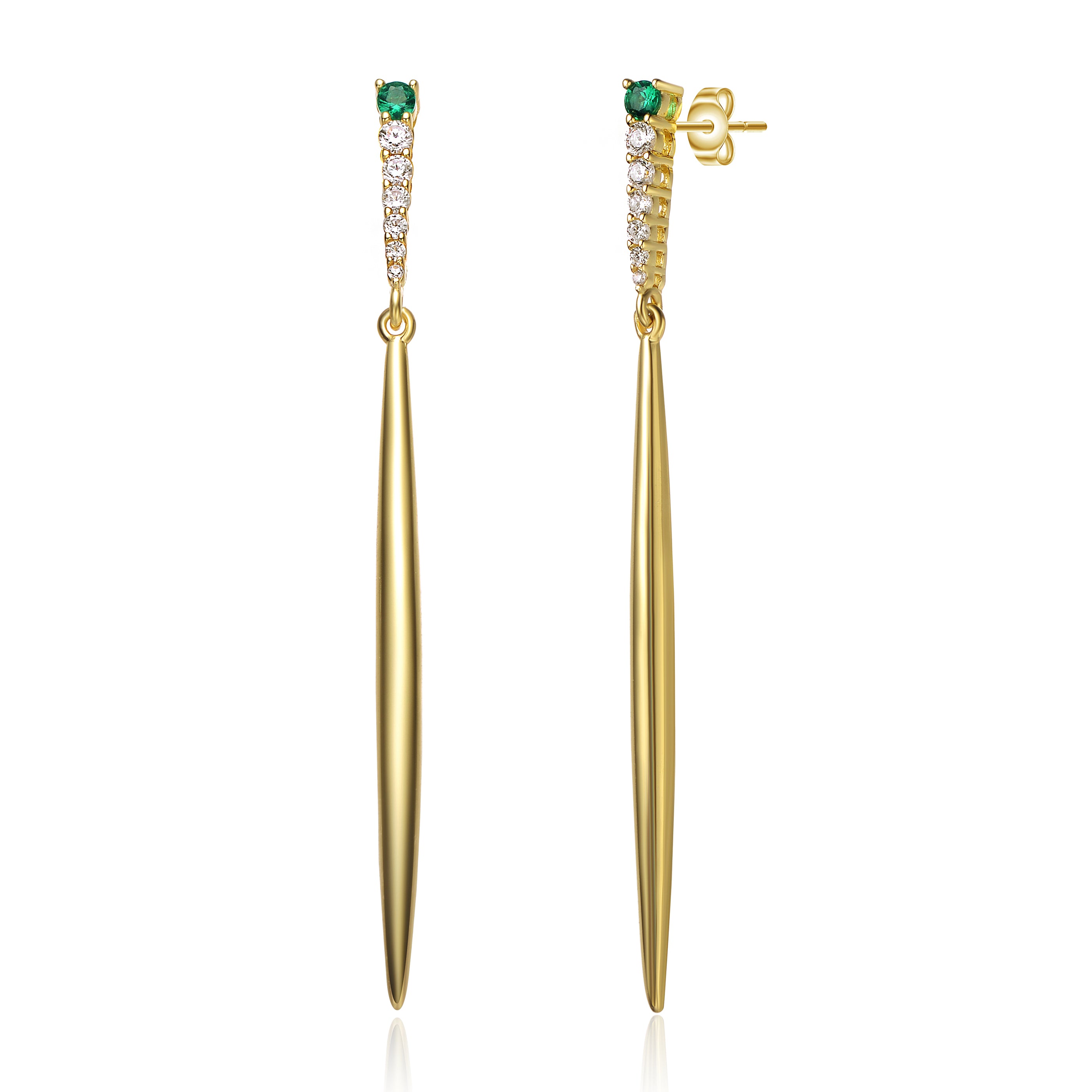 Vibrant emerald-like and round brilliant cut cubic zirconias adorn the top of these modern dangle earrings, glistening in cluster icicles. Ultra-shiny spikes on the bottom lend a contemporary appeal. Butterfly backs secure these glam drops finely crafted in 14k yellow gold plated or Rhodium platted sterling silver. Available in different stone color options.