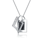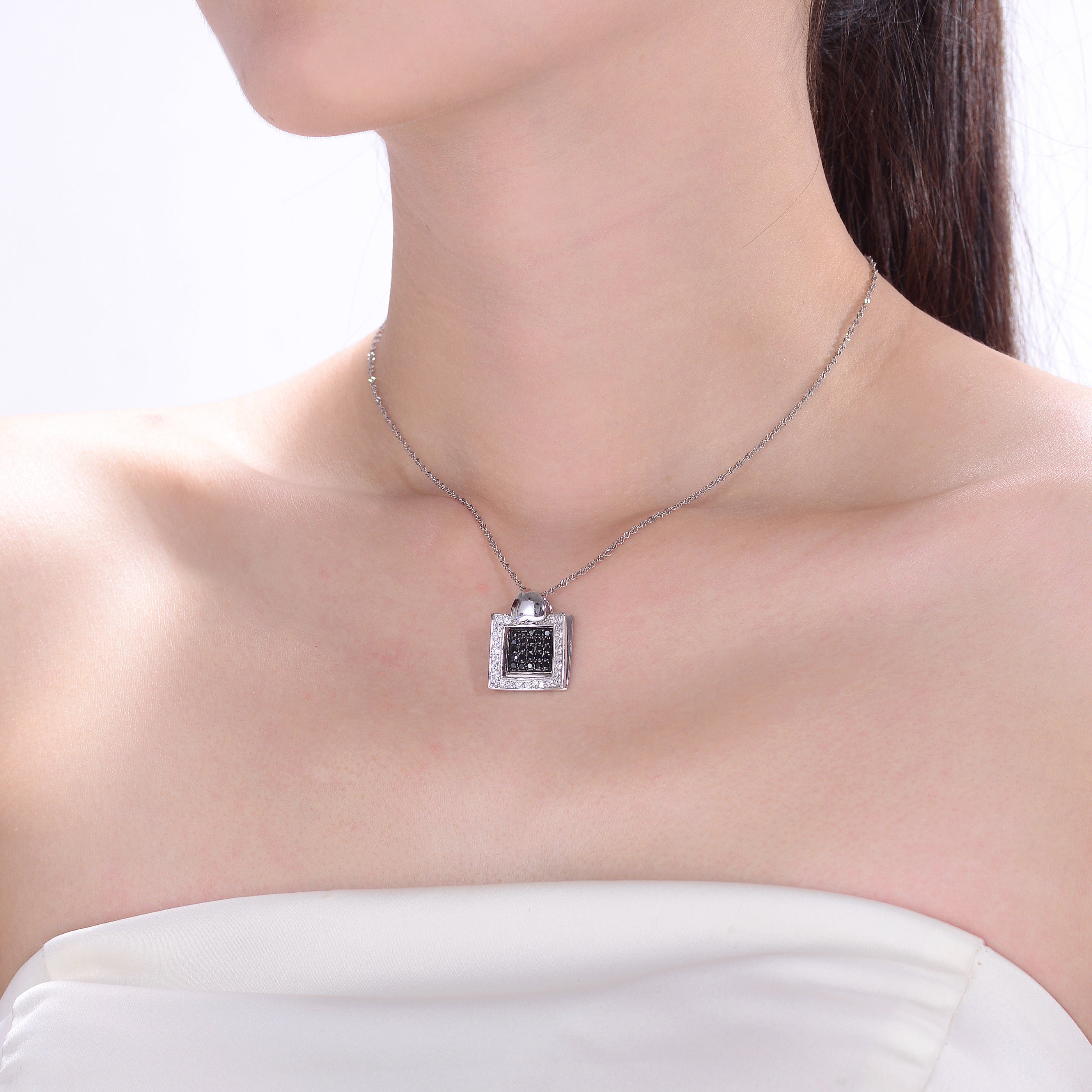 Square frames of sterling silver and clear cubic zirconia stones surround a square of black pave cubic zirconias. This necklace is great for spicing up an everyday outfit.