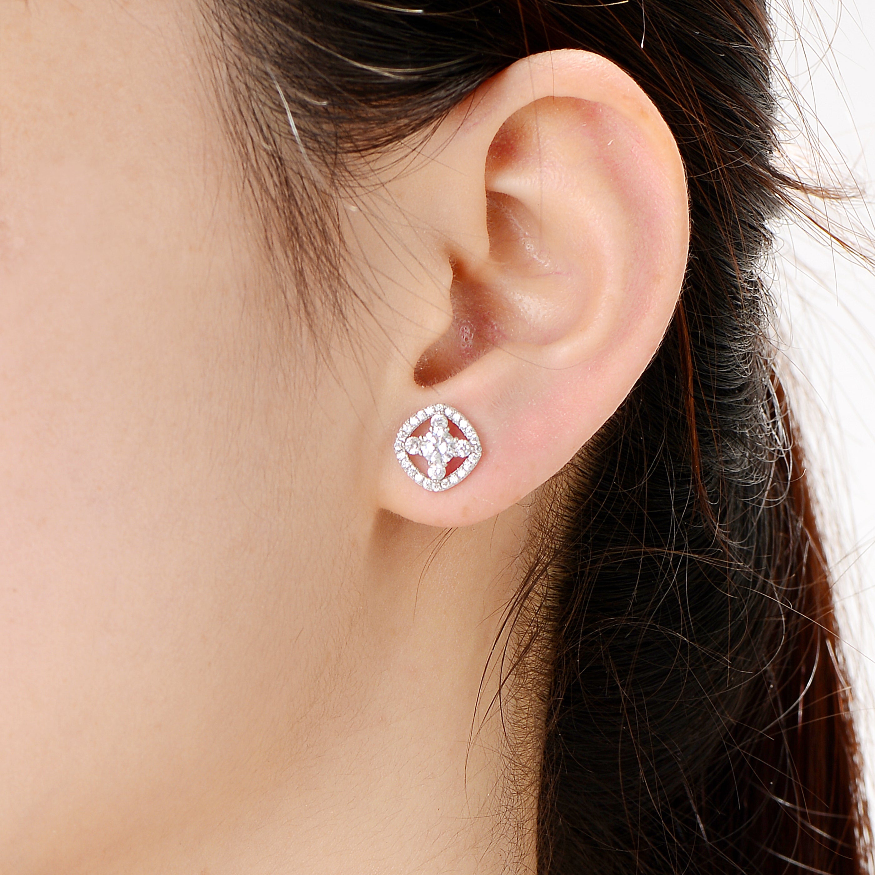 These knob earrings use an open shape of clear cubic zirconias as a frame for a cross f cubic zirconias. They make a delightful gift item.