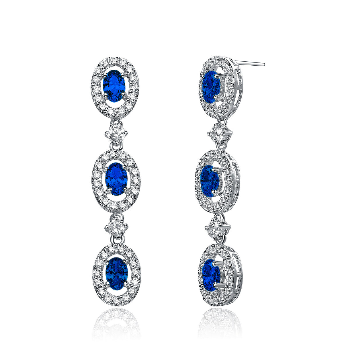 These geometric drop earrings feature three oval shimmering cubic zirconia stones decorateds with smaller round stones. Crafted of .925 sterling silver, the earrings secure with butterfly clasps.Available in clear and Sapphire color stones.