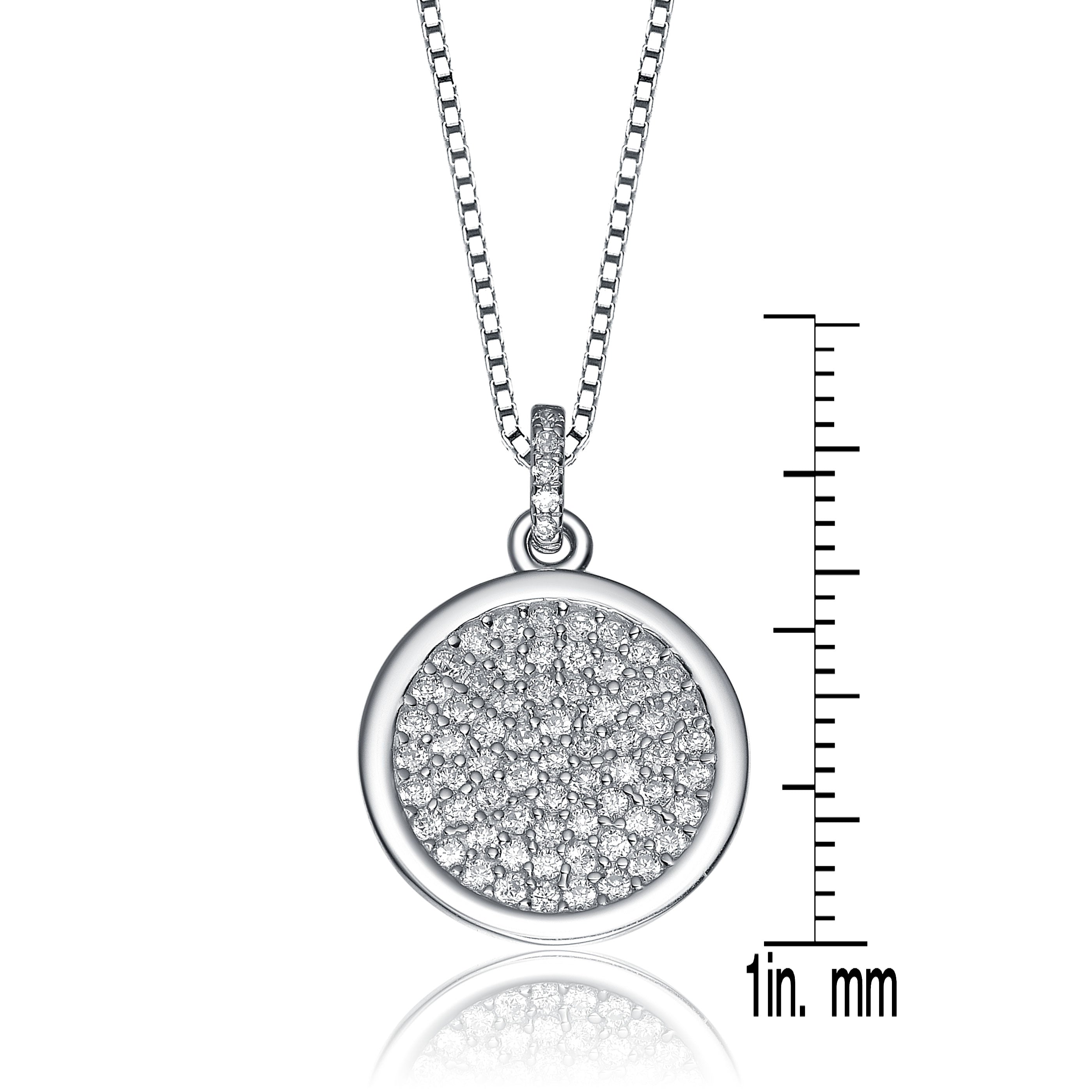 A sterling silver circle pendant infused with pave clear cubic zirconia stones is the focal point of this necklace. Wear it at your place of employment or to nighttime events.