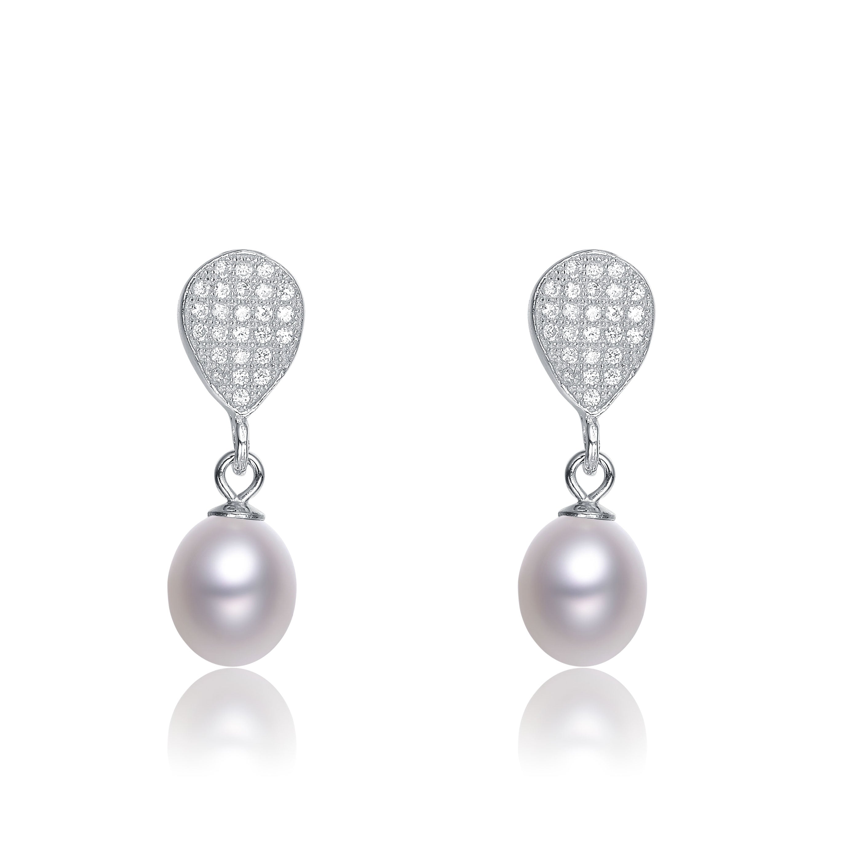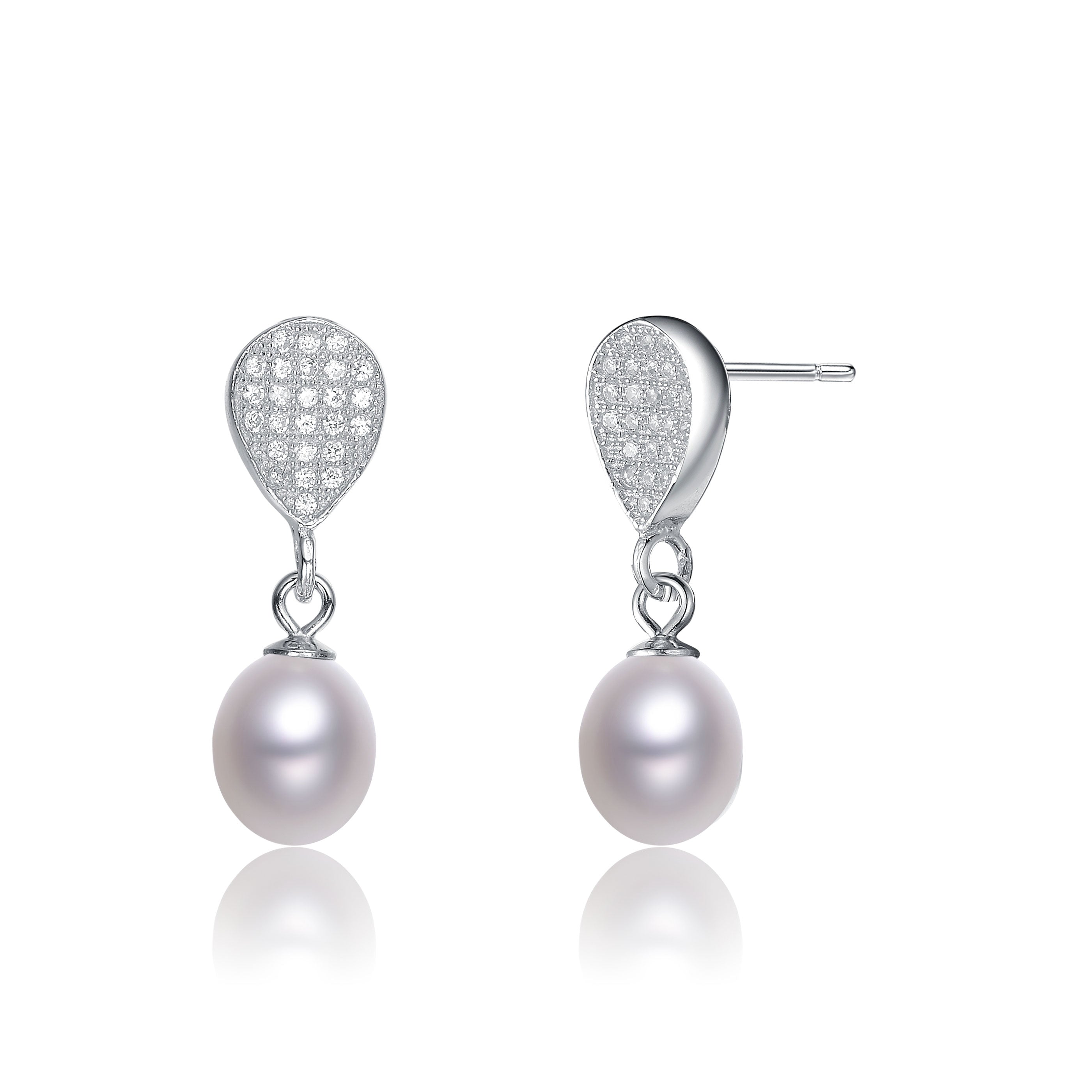 Clear pave cubic zirconias are at the post of these sterling silver earrings. A beautiful pearl creates the dangle effect, making it a quintessential piece.