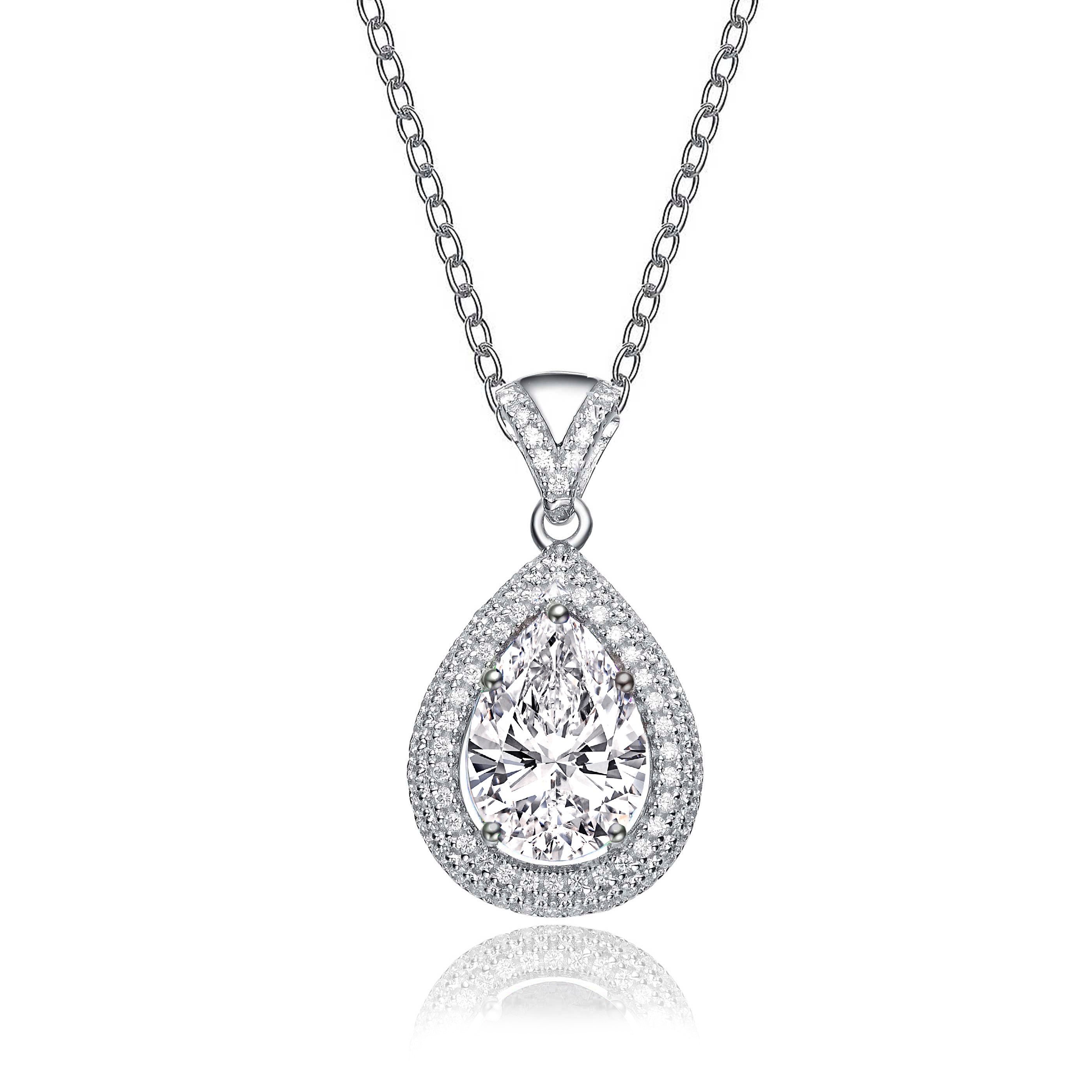 This sophisticated pendant features a pear-shaped cubic zirconia stone at its center, exquisitely framed by smaller round cubic zirconia stones that enhance its sparkle. The central stone is meticulously cut to maximize brilliance, resembling the appearance of a high-quality diamond. The pendant is suspended from a classic sterling silver chain through an elegant triangular bail adorned with additional cubic zirconia, adding to the overall luxurious feel of the piece. This pendant’s design combines timeless elegance with modern craftsmanship, making it an alluring accessory for any occasion.