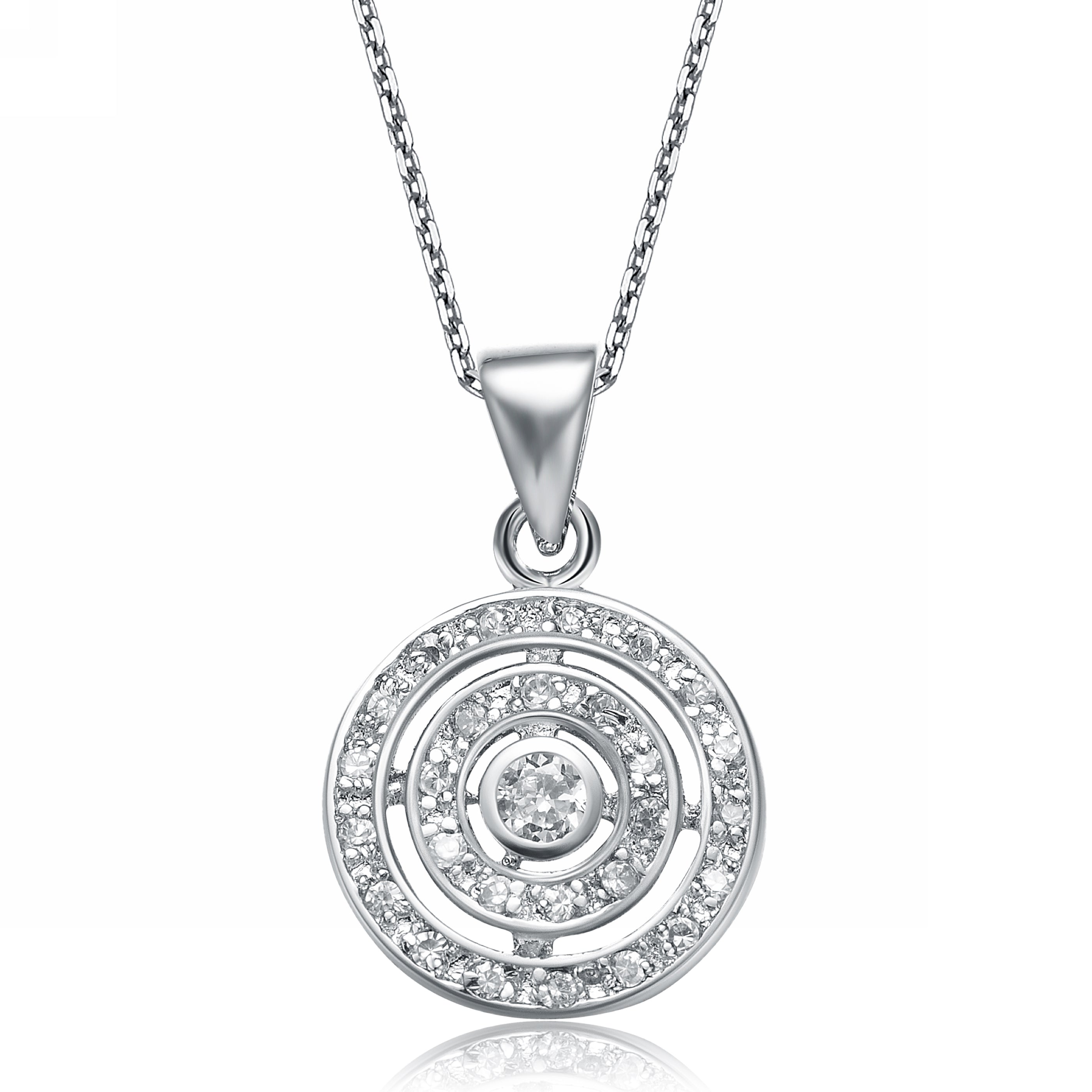 This sophisticated pendant features a spiral design, meticulously crafted from sterling silver. The pendant is adorned with multiple round-cut cubic zirconia stones that are precisely set to enhance the sparkle and provide an eye-catching allure. The central stone is prominently placed at the core of the spiral, drawing attention to its brilliance. This piece hangs gracefully from a matching sterling silver chain, making it an ideal accessory for adding a touch of elegance to any outfit. Its timeless design and radiant finish make this pendant a captivating choice for jewelry enthusiasts.