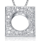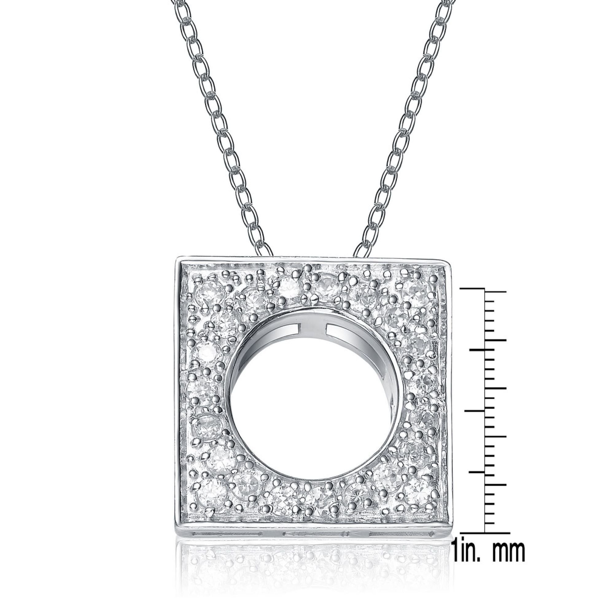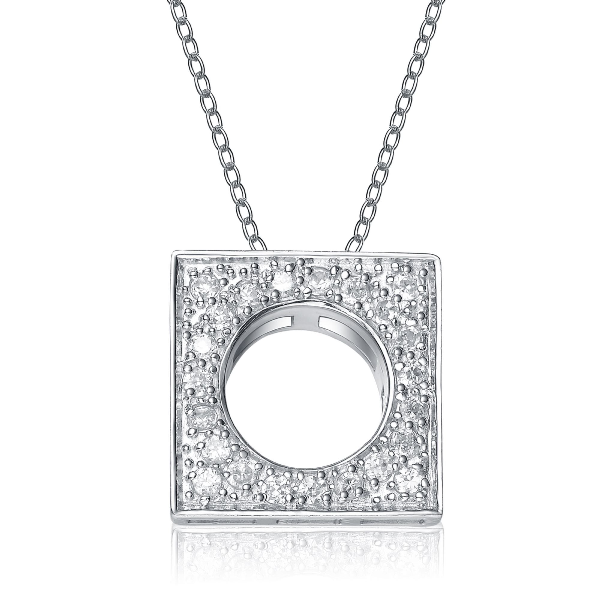 This sterling silver necklace offers two different shapes for an interesting style. It uses clear cubic zirconia stones to create a square that has circular cut out at the center.