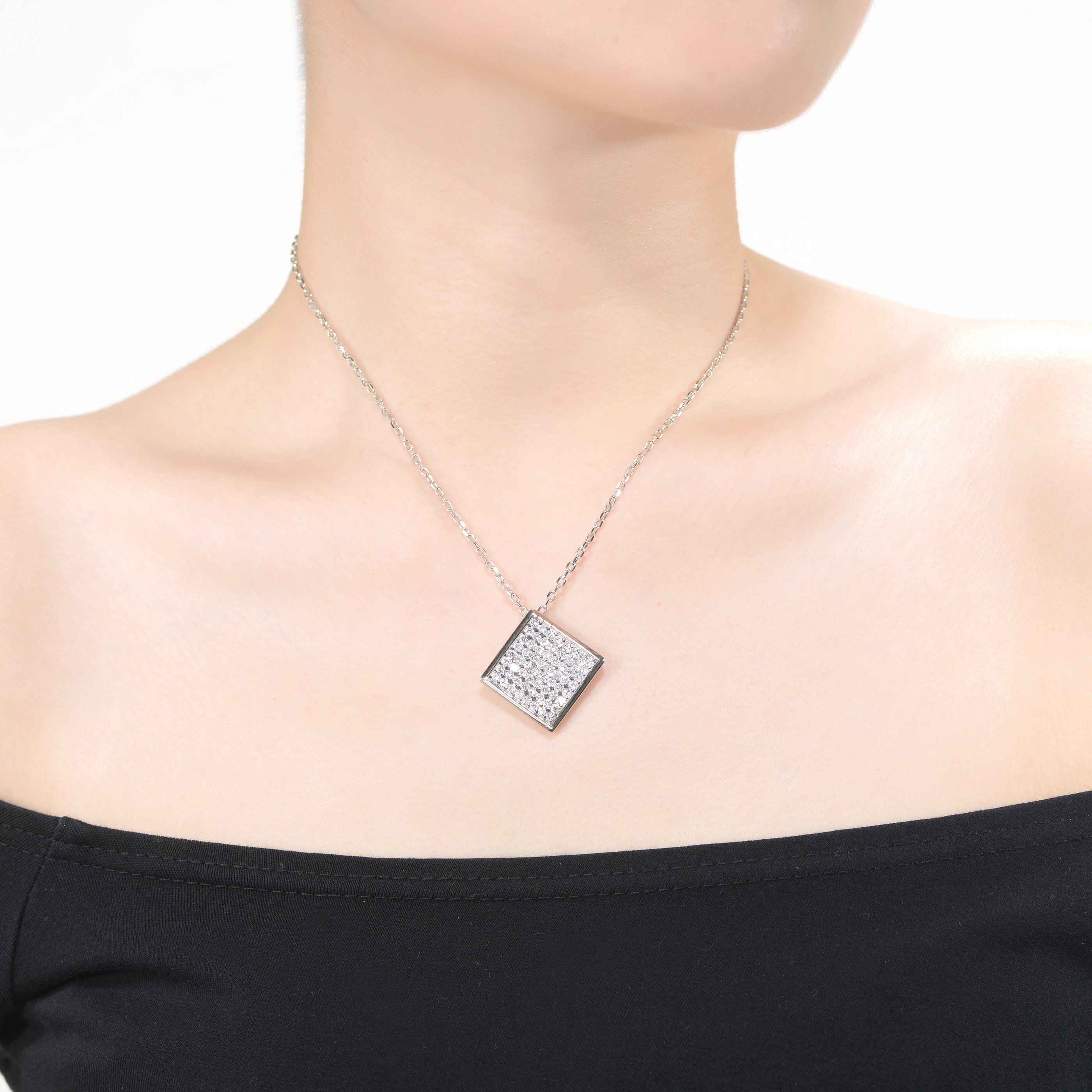 This sophisticated pendant necklace features a square-shaped sterling silver setting. The pendant is adorned with multiple small, round-cut cubic zirconia stones that are meticulously arranged to cover the entire visible surface, providing a dazzling and luxurious appearance. The pendant is attached to a delicate sterling silver chain, which complements the sparkle of the cubic zirconias. This piece of jewelry exudes elegance and is suitable for both formal occasions and everyday wear. Add a touch of glamour to your collection with this stunning necklace.