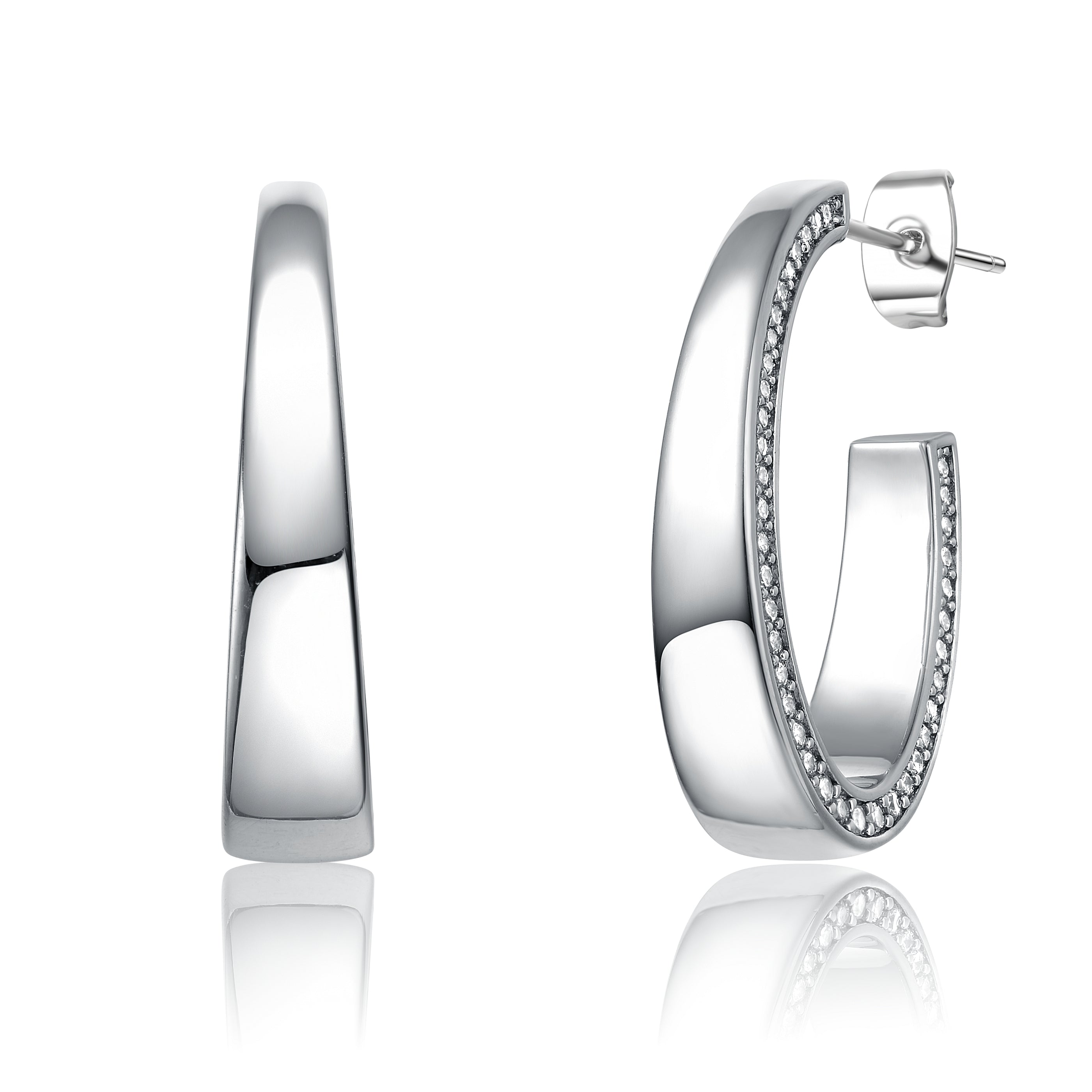 Elevate your look with this pair of beautiful ¾ C -hoop earrings, beautifully crafted in a rich, luscious shine with a tapered shape. Round brilliant cut cubic zirconias trim the exterior of each hoop, giving them modernity. Post butterfly backs keep them secure, all finely crafted in brightly polished White Gold plated sterling silver. Available in 14K Gold Plated as well.