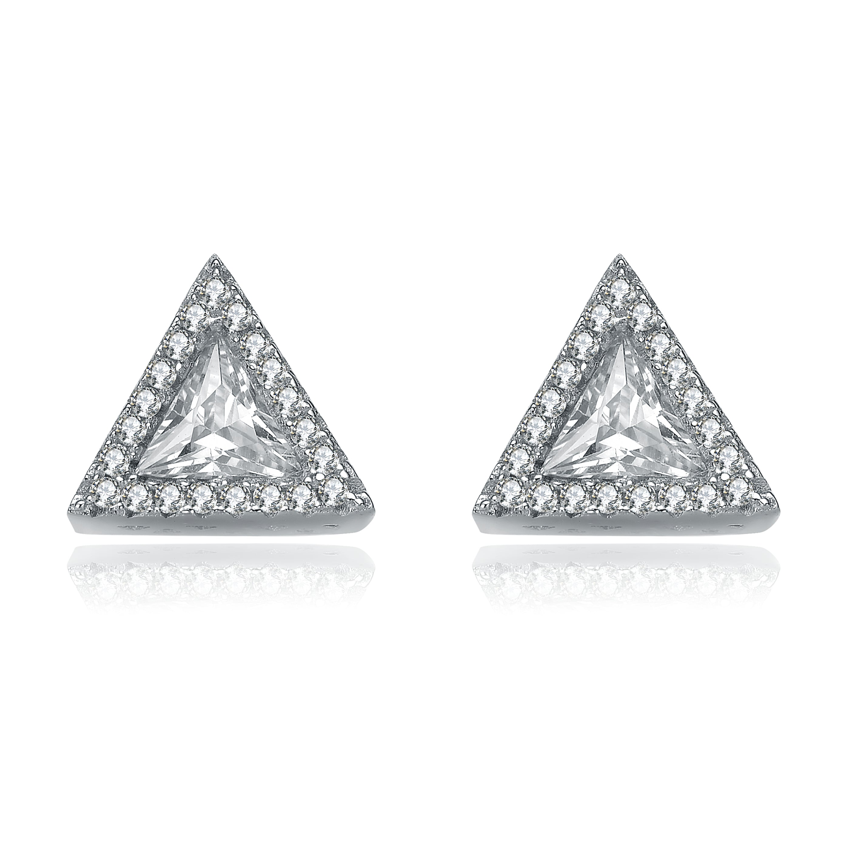 These sterling silver earrings offer a nice change to the traditional cuts. It features a clear triangular cubic zirconia solitaire surrounded by even more cubic zirconias.