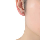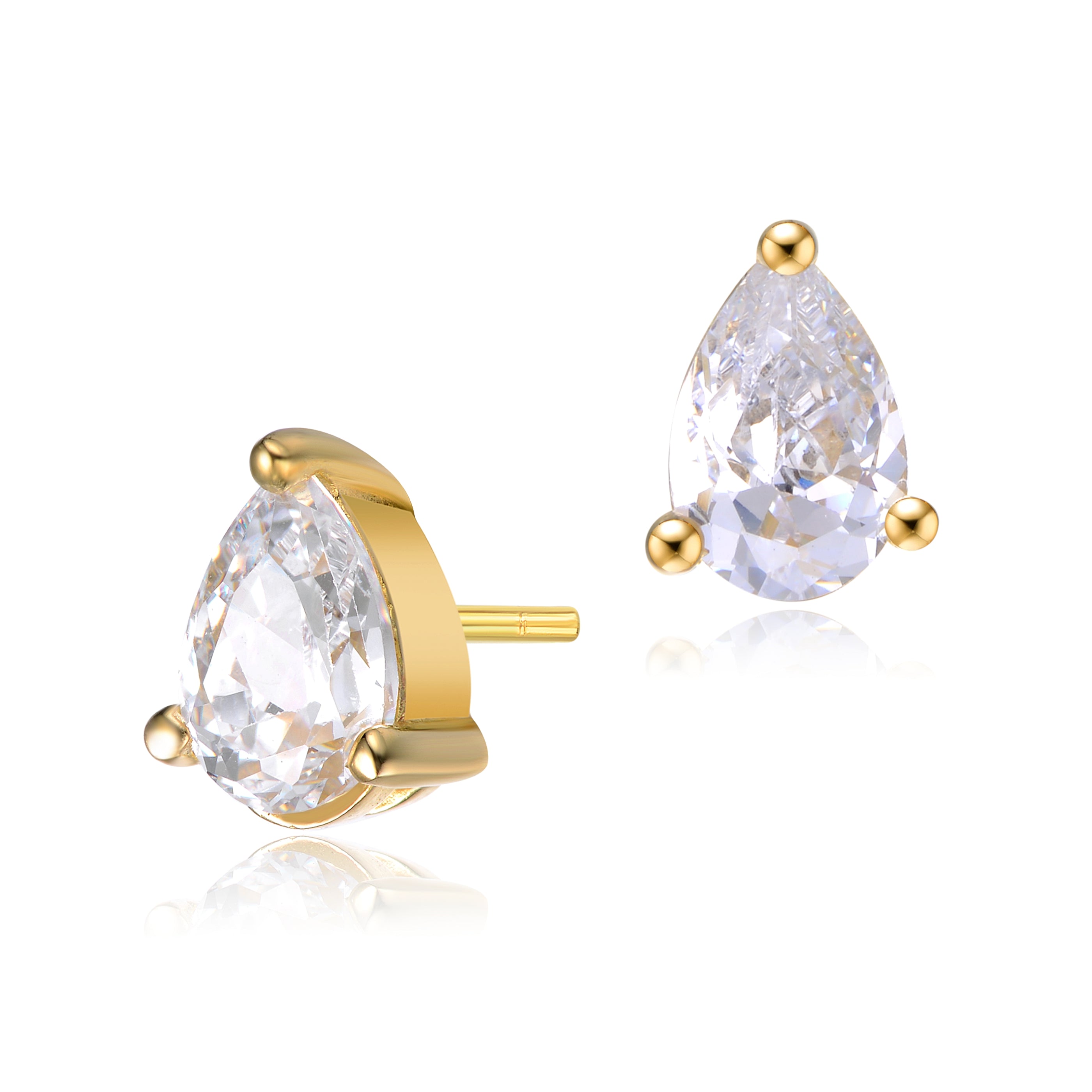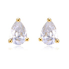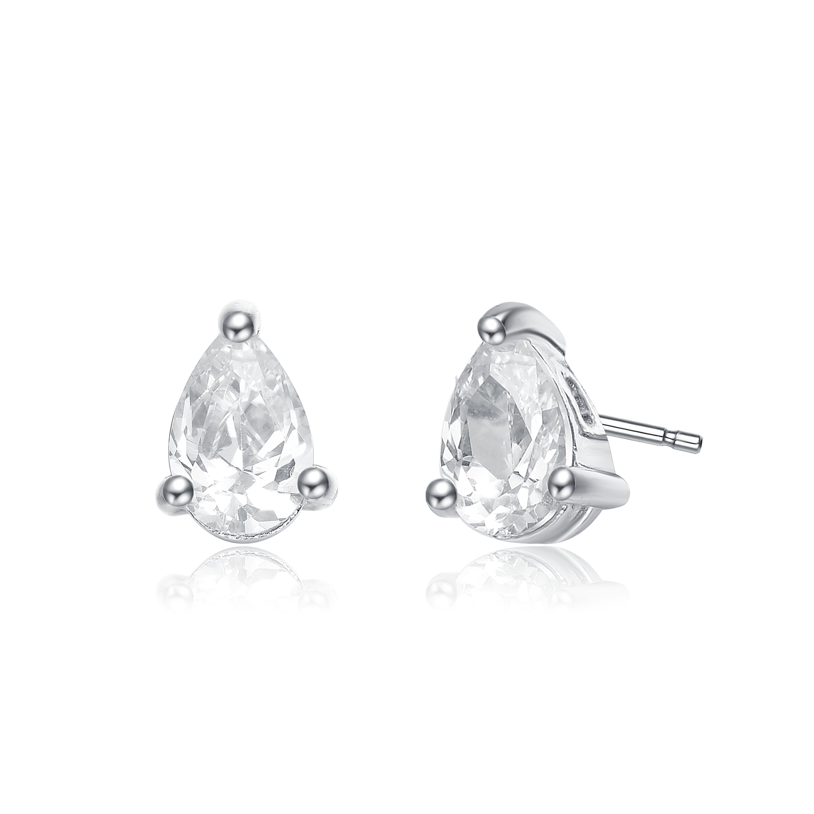 These earrings are a pair of elegant, rhodium-plated stud earrings made of .925 sterling silver. They feature a single, pear-shaped cubic zirconia stone on each earring that sparkles like a diamond. The stones are prong-set in a minimalist setting that allows maximum light exposure. The earrings have a standard post and back closure for a comfortable and secure fit. These earrings are simple and chic, perfect for any occasion.