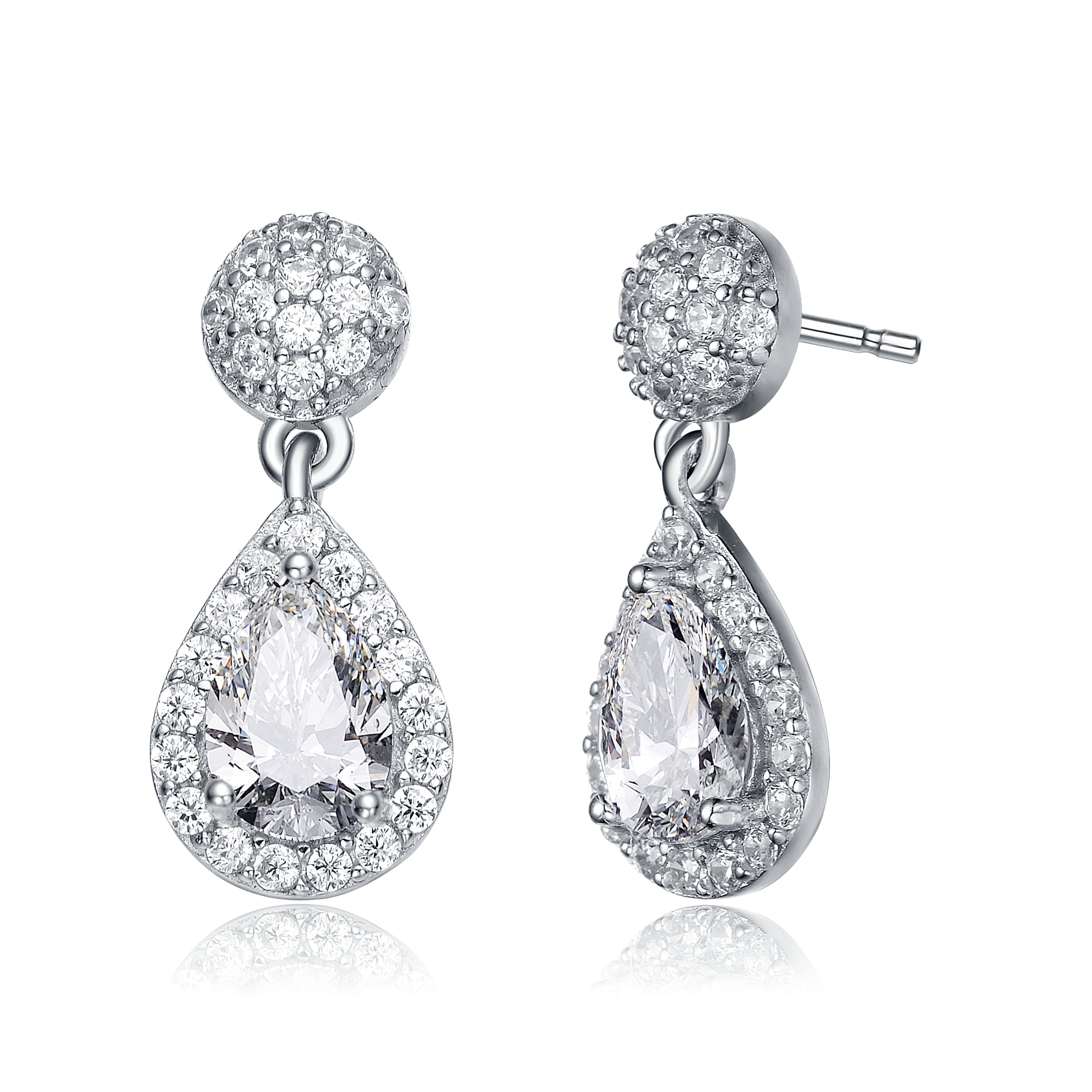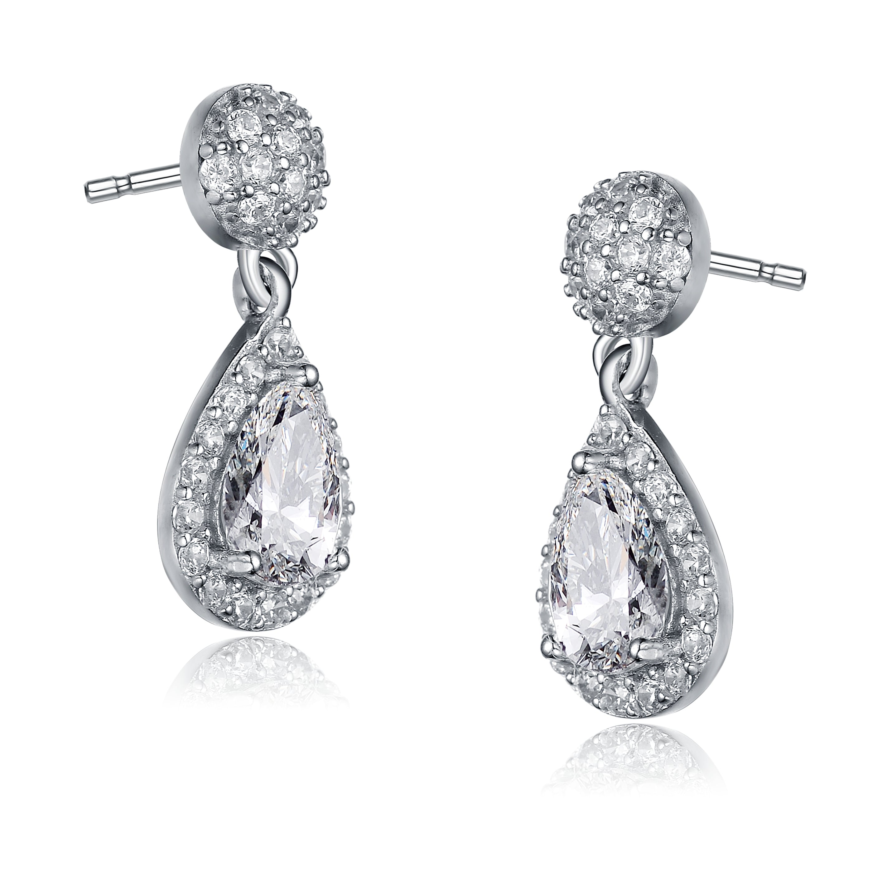 A vintage feel is provided by these sterling silver earrings. They use clear pave cubic zirconia stones at the post and create a drop effect with a pear shaped cubic zirconia solitaire and halo. Z Sterling Silver Pear Shaped and Pave Post Cubic Zirconia Earrings