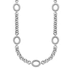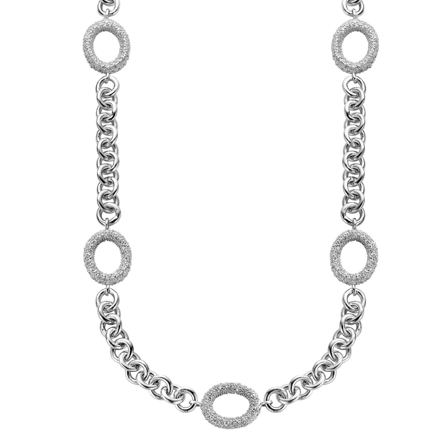 Features donut shaped trinkets paved with clear cubic zirconia beautifully connected by cable chain. This necklace is made from .925 sterling silver that compliments its unique design.
