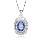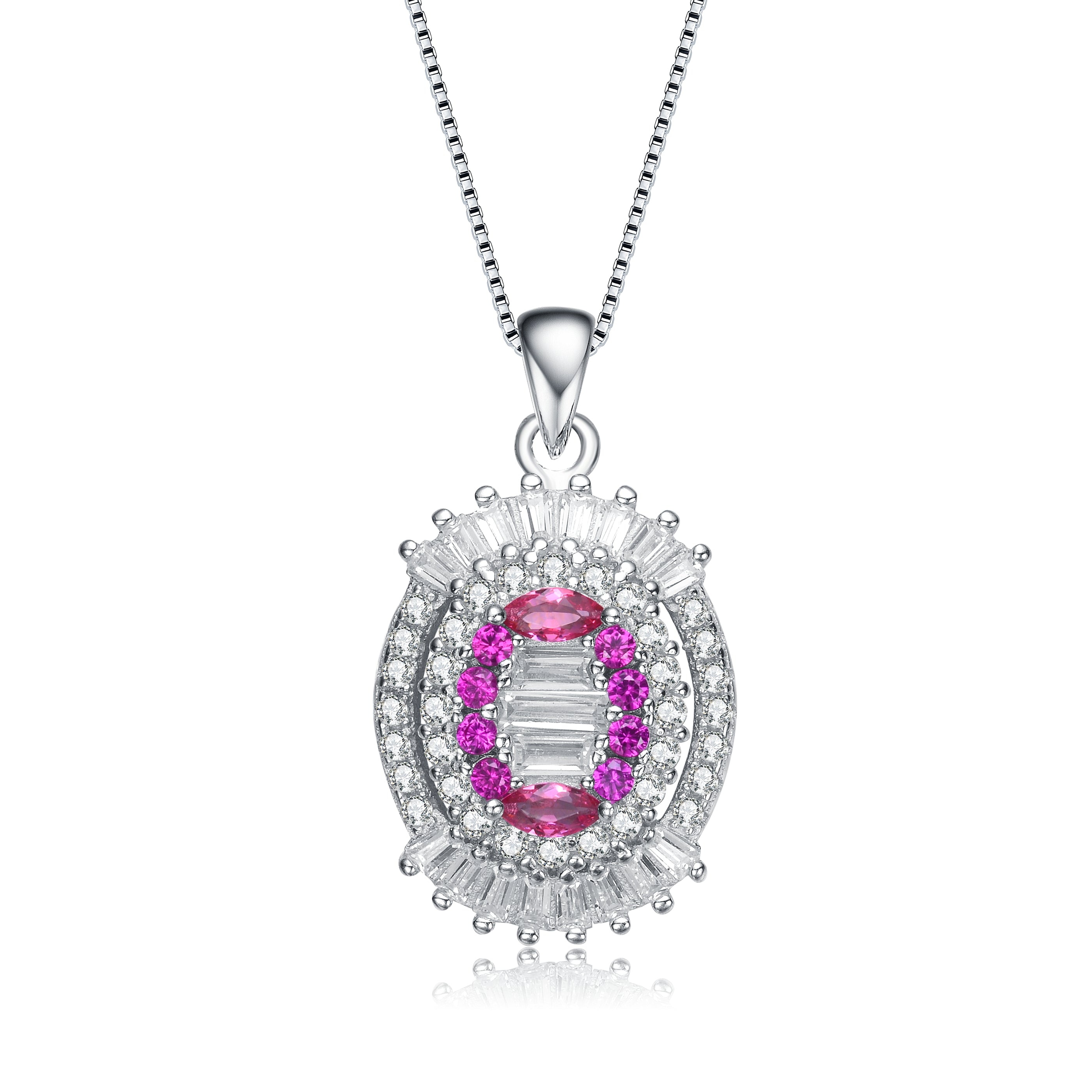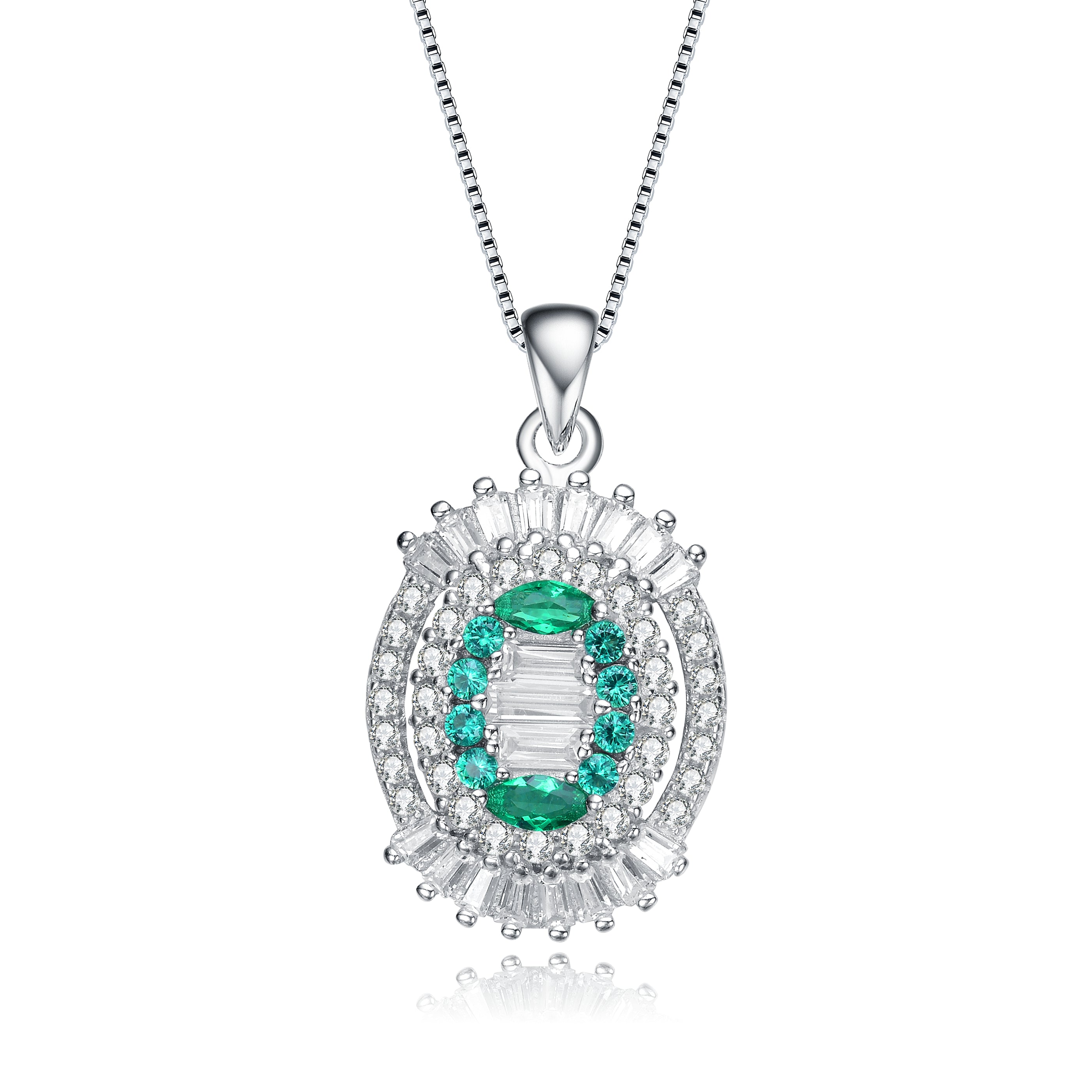 This sophisticated pendant features a central emerald-cut cubic zirconia, exuding a rich green hue, encased in sterling silver. Surrounding the centerpiece are two halos; the inner halo consists of smaller round green cubic zirconia stones, while the outer halo is adorned with sparkling clear cubic zirconia stones, enhancing the pendant’s luxurious appeal. The piece is suspended from a delicate sterling silver chain with a classic clasp, making it an exquisite accessory for formal occasions or as a statement piece for everyday elegance. Add a touch of luxury to your jewelry collection with this stunning pendant.