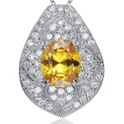 This is a delicate sterling silver pendant that is composed of numerous white cubic zirconia stones surrounding a large golden cubic zirconia stone. This is a dazzling piece that will surely captivate you; finally the piece has no clasp but instead the top part is attached to a fine silver chain necklace.