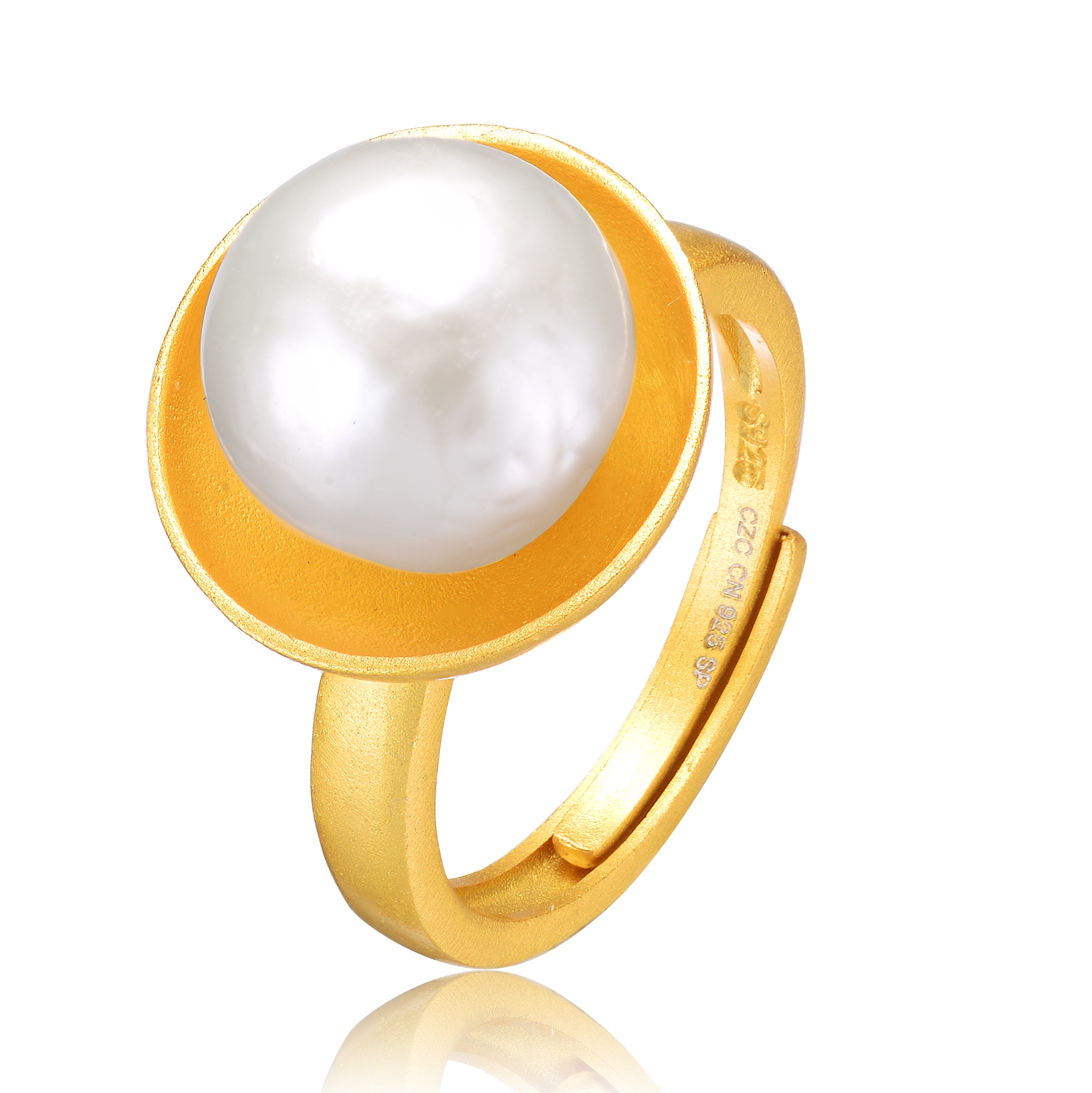Classy Sterling Silver Gold Plated with Freshwater Pearl Ajustable Ring. The ring features round Freshwater pearl set on round gold metal frame. Crafted in Sterling Silver with Gold Plating and it is ajustable. This item is great adition to any outfit. Makes a great gift as well.