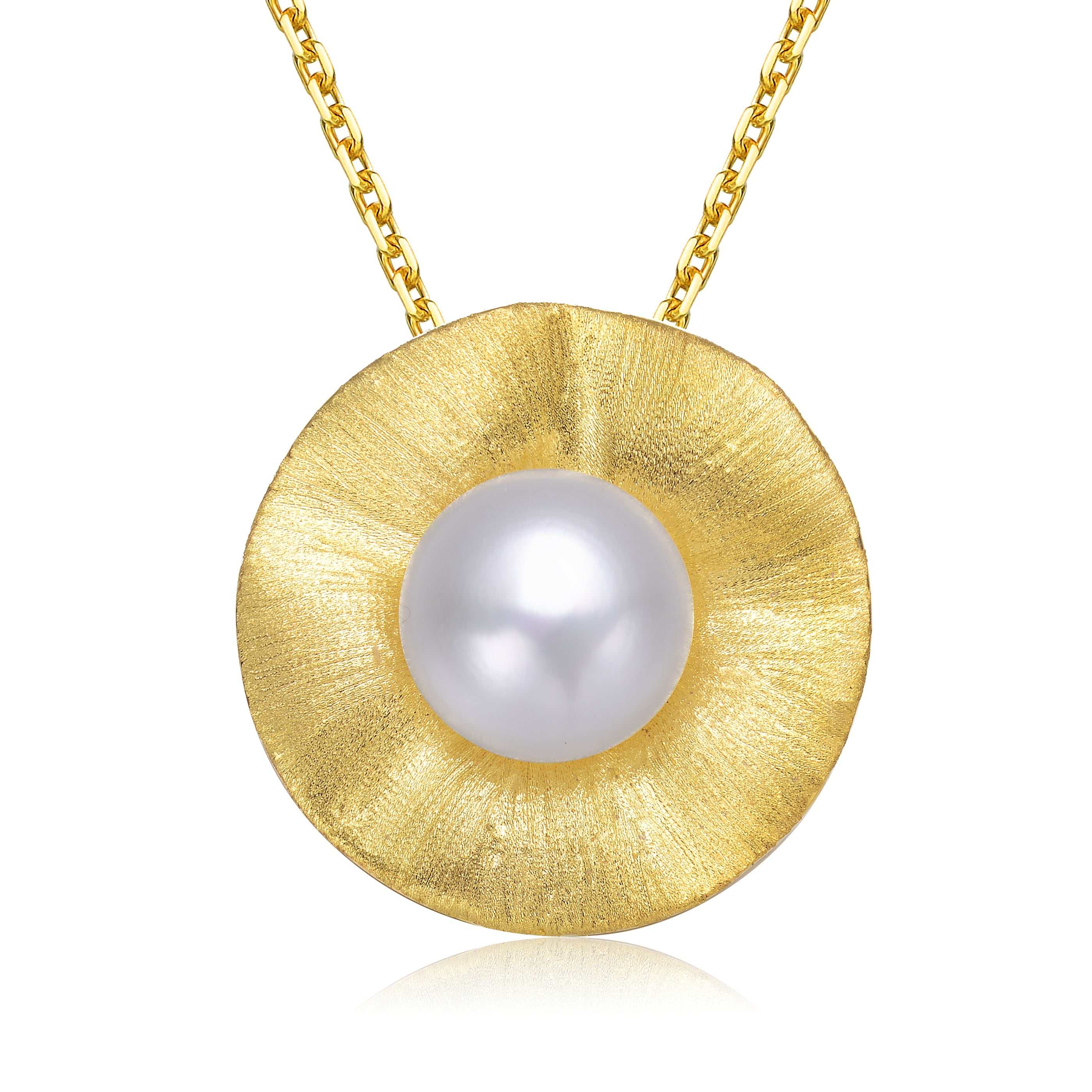 Very Elegant Sterling Silver Gold Plated with Freshwater Pearl Curvy Pendant Necklace. The pendant features design made out of round Freshwater pearl set in the center of the curvy gold metal frame. Crafted in Sterling Silver with Gold Plating and it is secured with a spring ring closure. This item is great adition to any outfit. Makes a great gift as well.