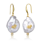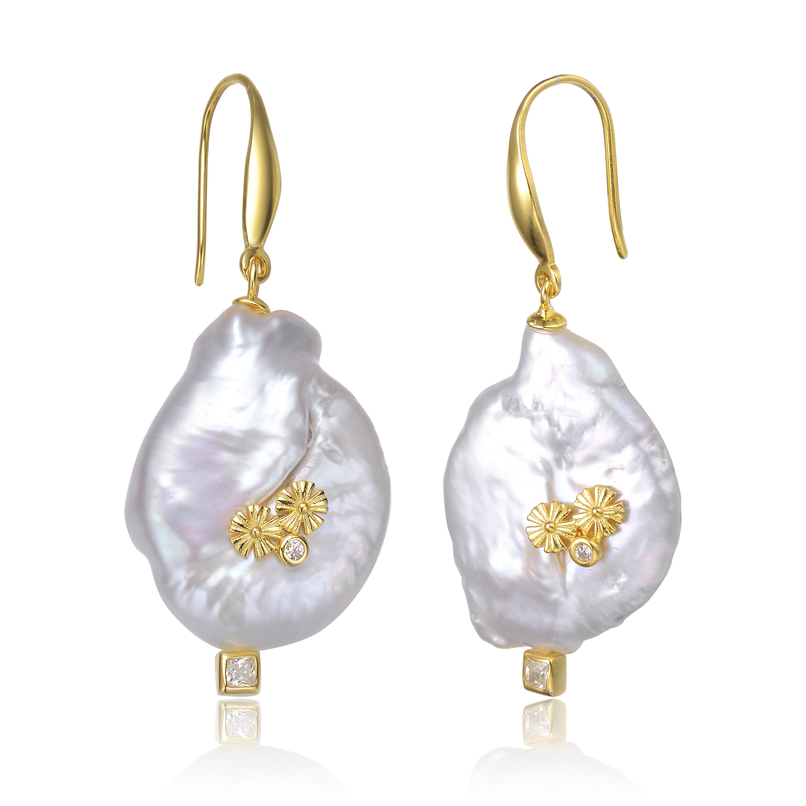 Classy Sterling Silver Gold Plated with Freshwater Pearl Hook Earrings. These earrings feature drop irregular Freshwater pearl decorated with gold accents. Crafted in Sterling Silver with Gold Plating and it is secured with hook. This item is great adition to any outfit. Makes a great gift as well.