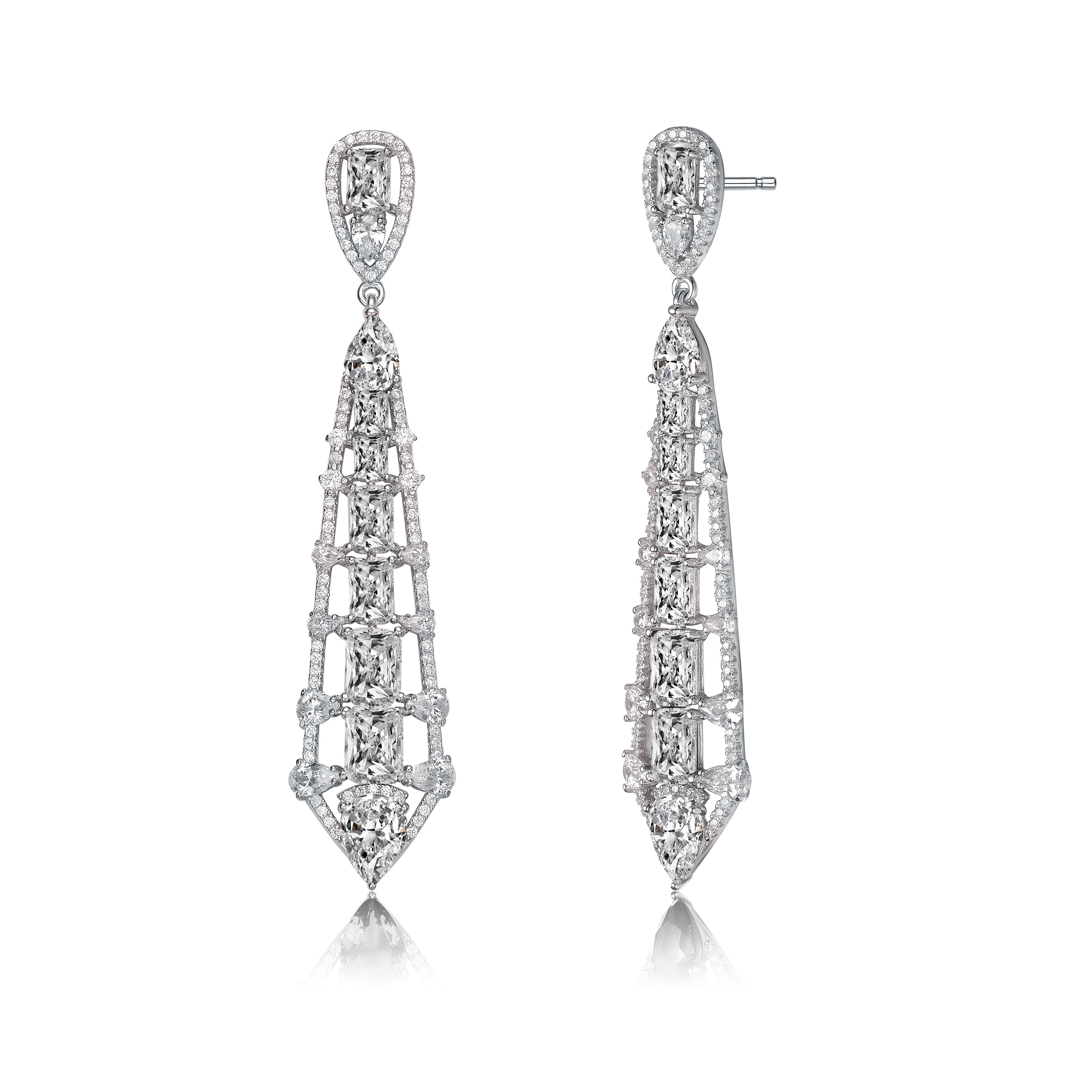 Features a ladder style paved with white cubic zirconia gemstones with green gemstones in the middle of every level. These dangle earrings are made from .925 sterling silver secured with butterfly clasp.