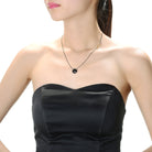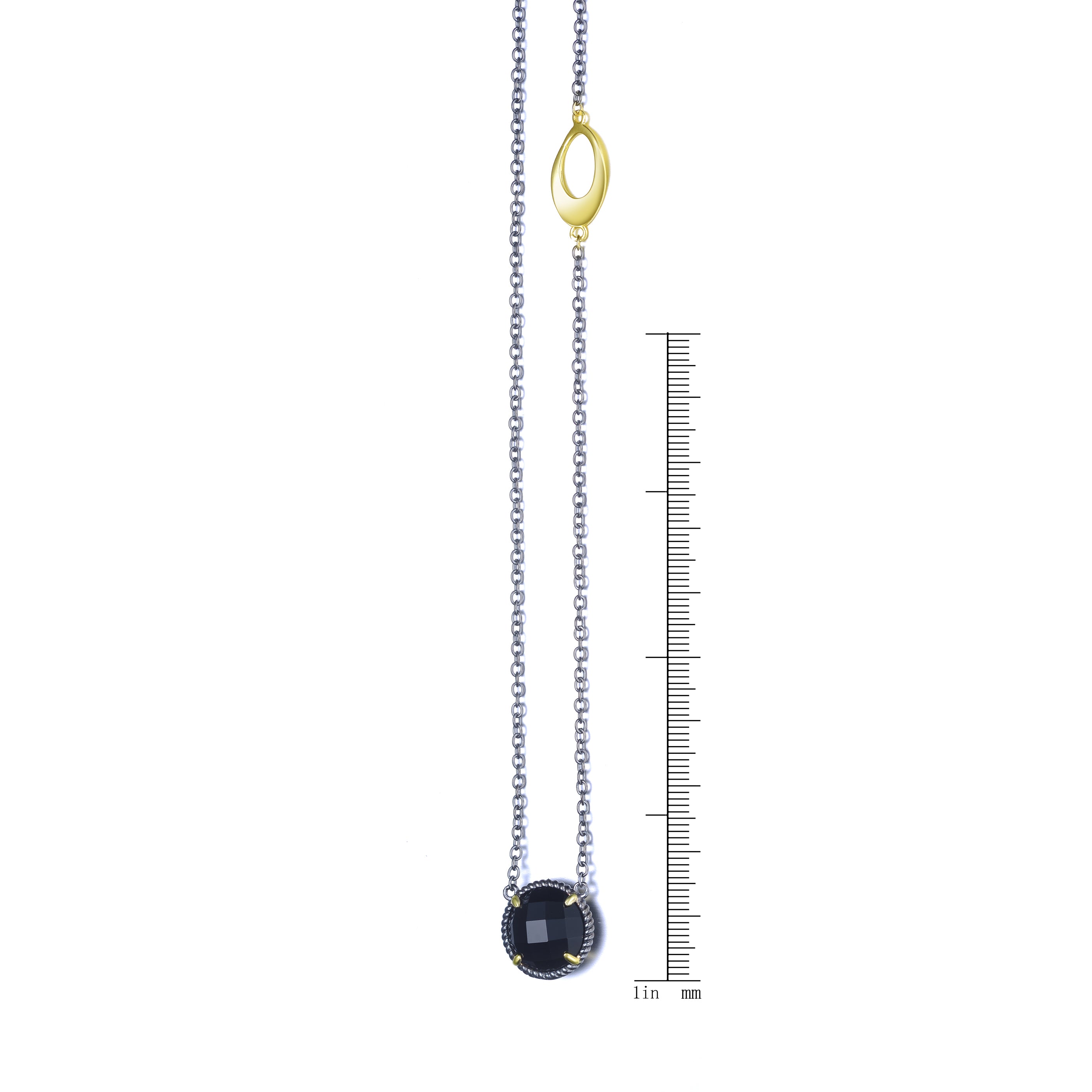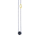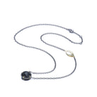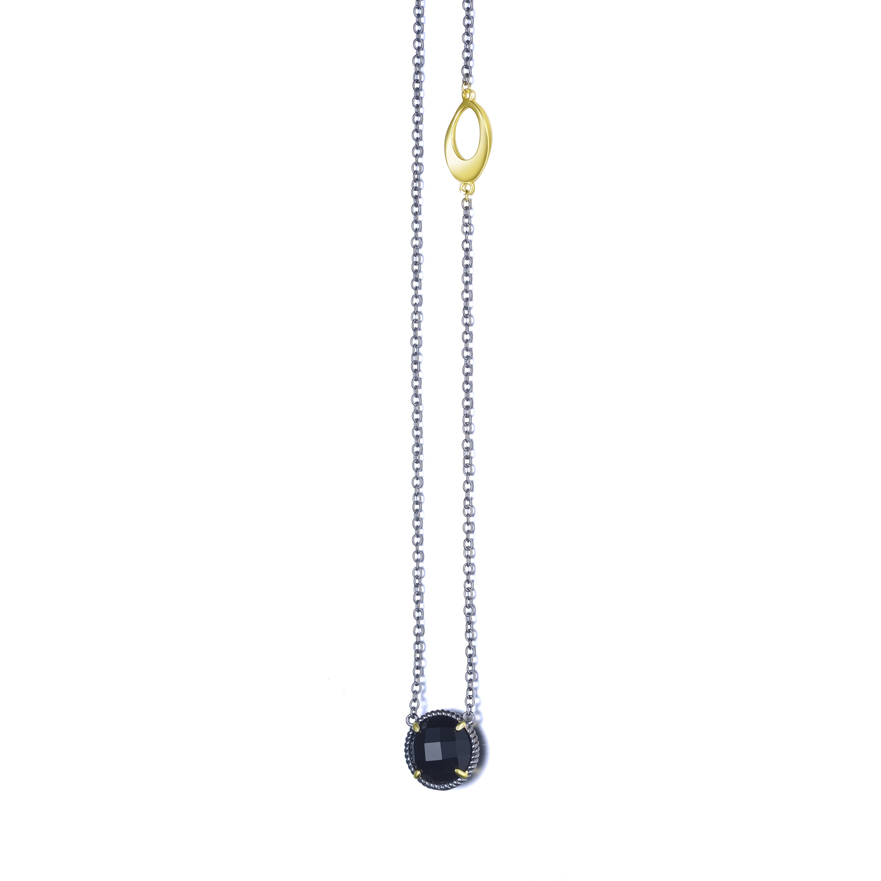 Feast your eyes on this tantalizing round black cubic zirconia stone chained in black sterling silver chains. The large black stone has a flutted edge that accents its size and shape; a small gold plated accent sits on one side of the necklace chain creating an assymmetrical yet modern effect.