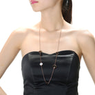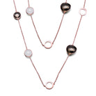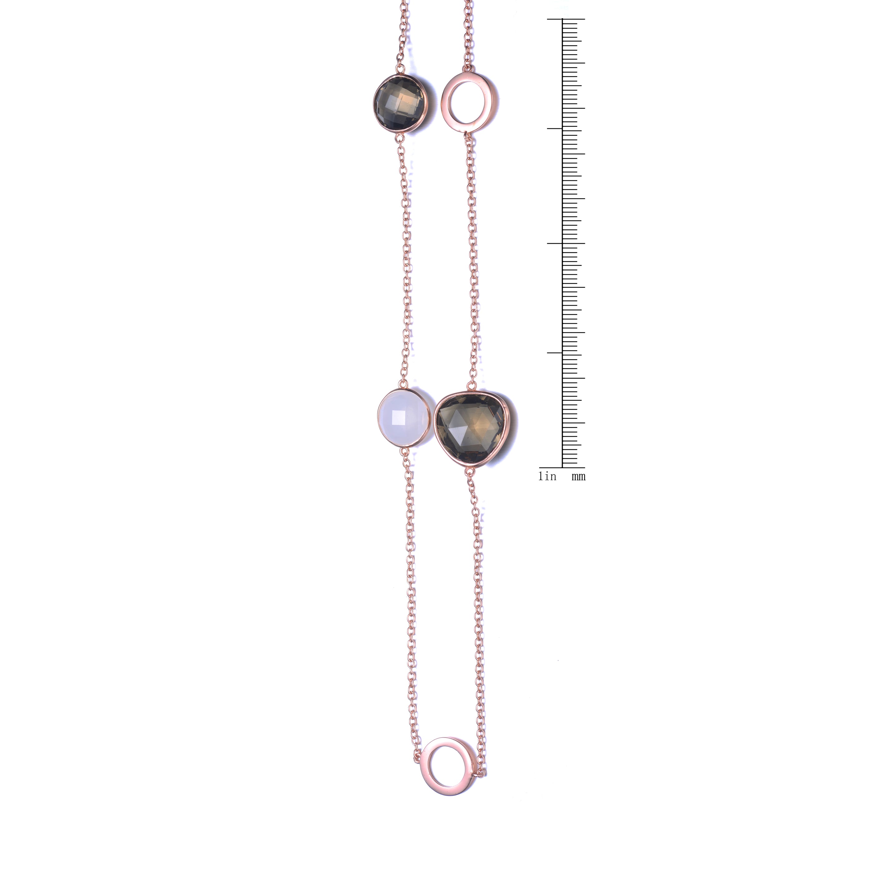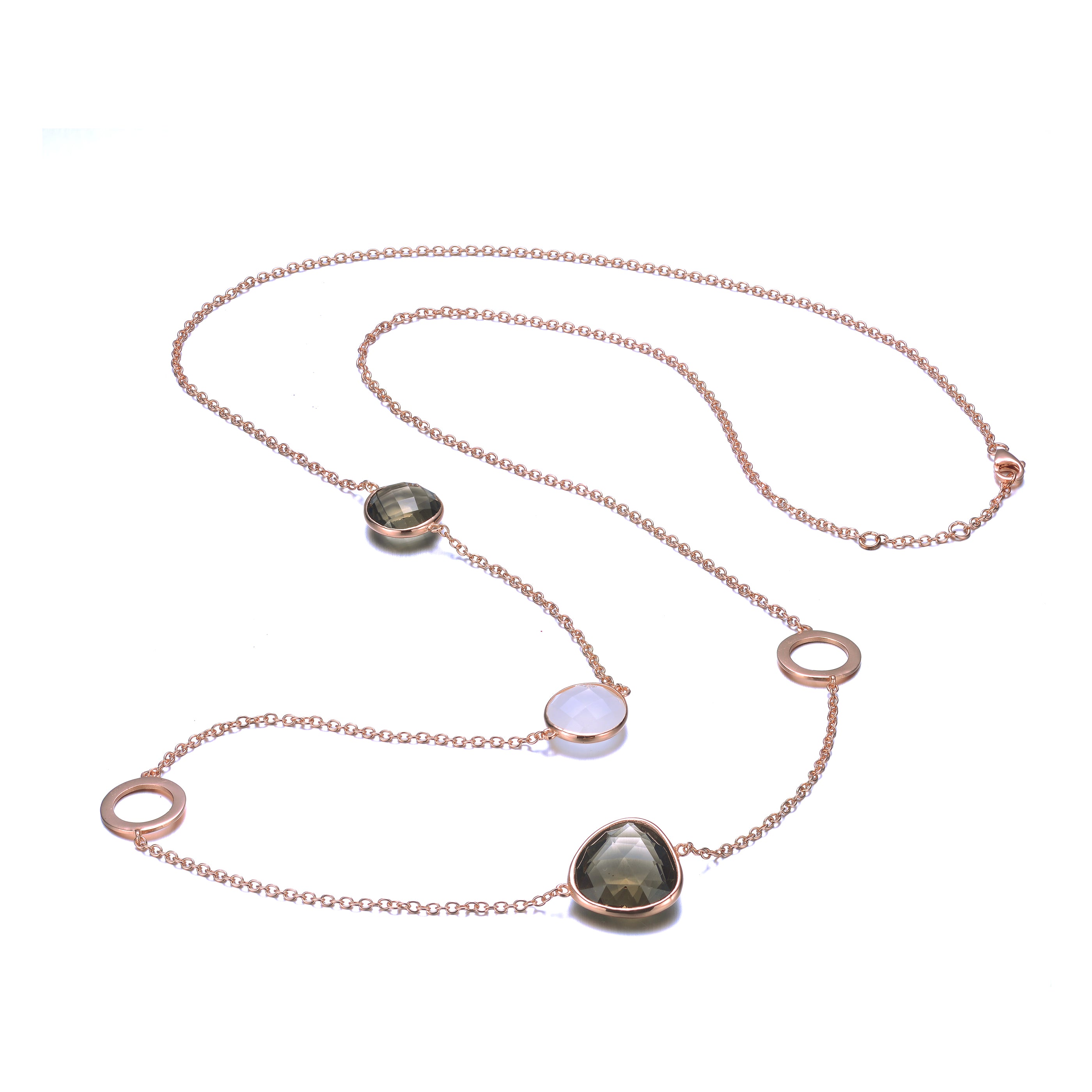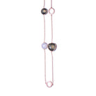 This lovely, long and lavander sterling silver necklace has medium-sized brown round-shaped cubic zirconia stones and three circular bands. The design looks assymmetrical with two contrasting colors but somehow it works perfectly creating a stylish look that will match any kind of casual attire.