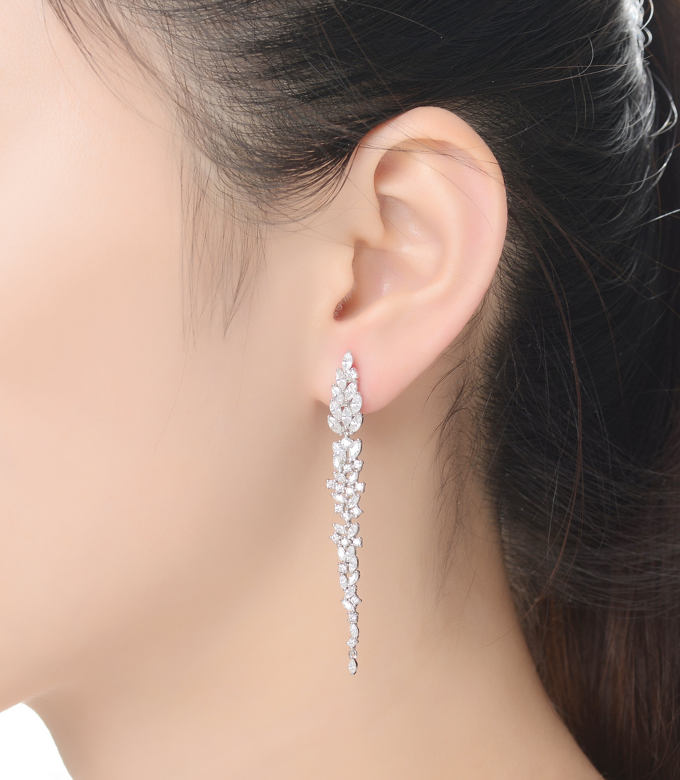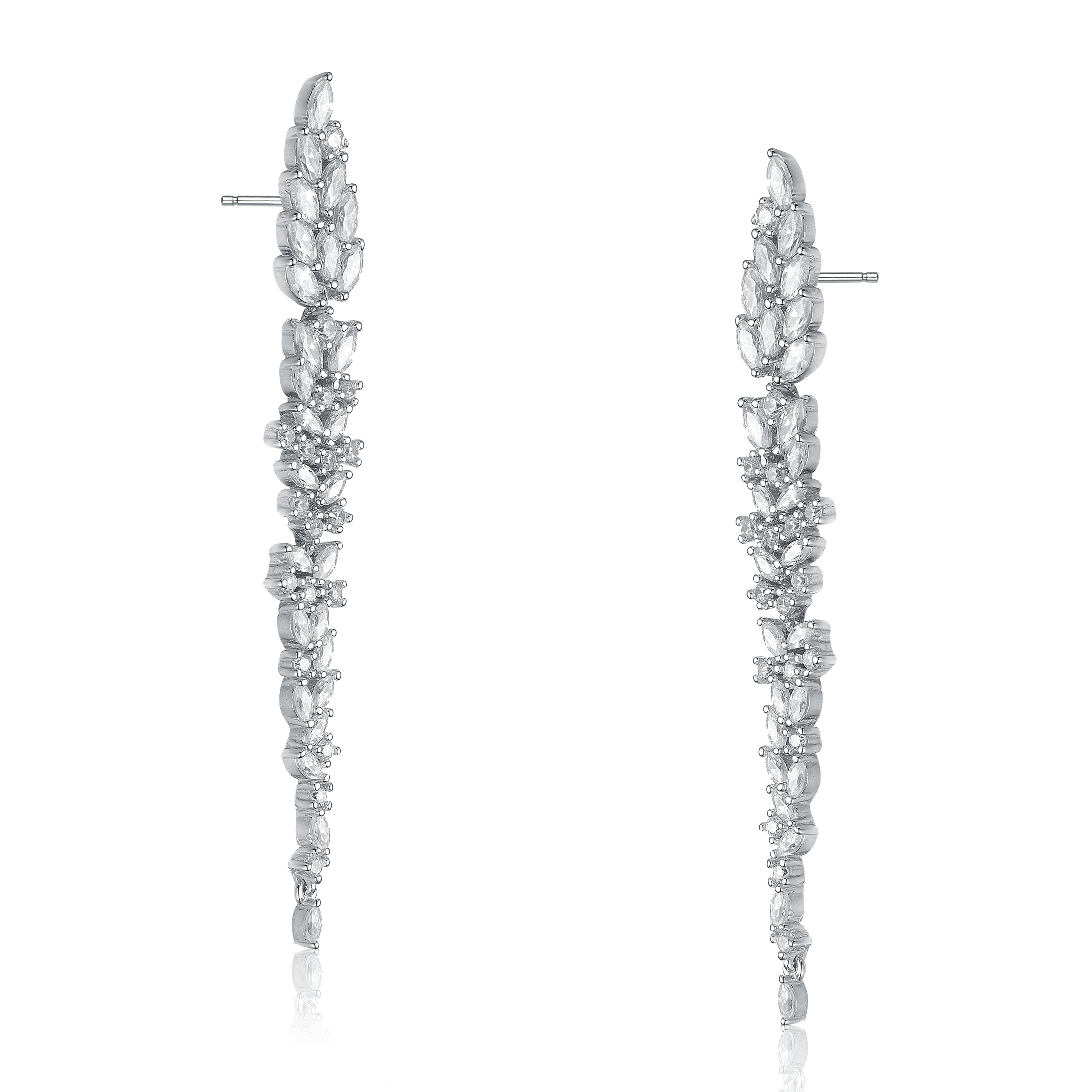 Features hanging connected small leaf shaped design paved with cubic zirconia accent. These dangle earrings are made from sterling silver secured with butterfly clasp.