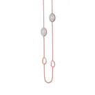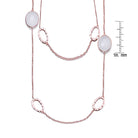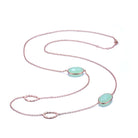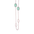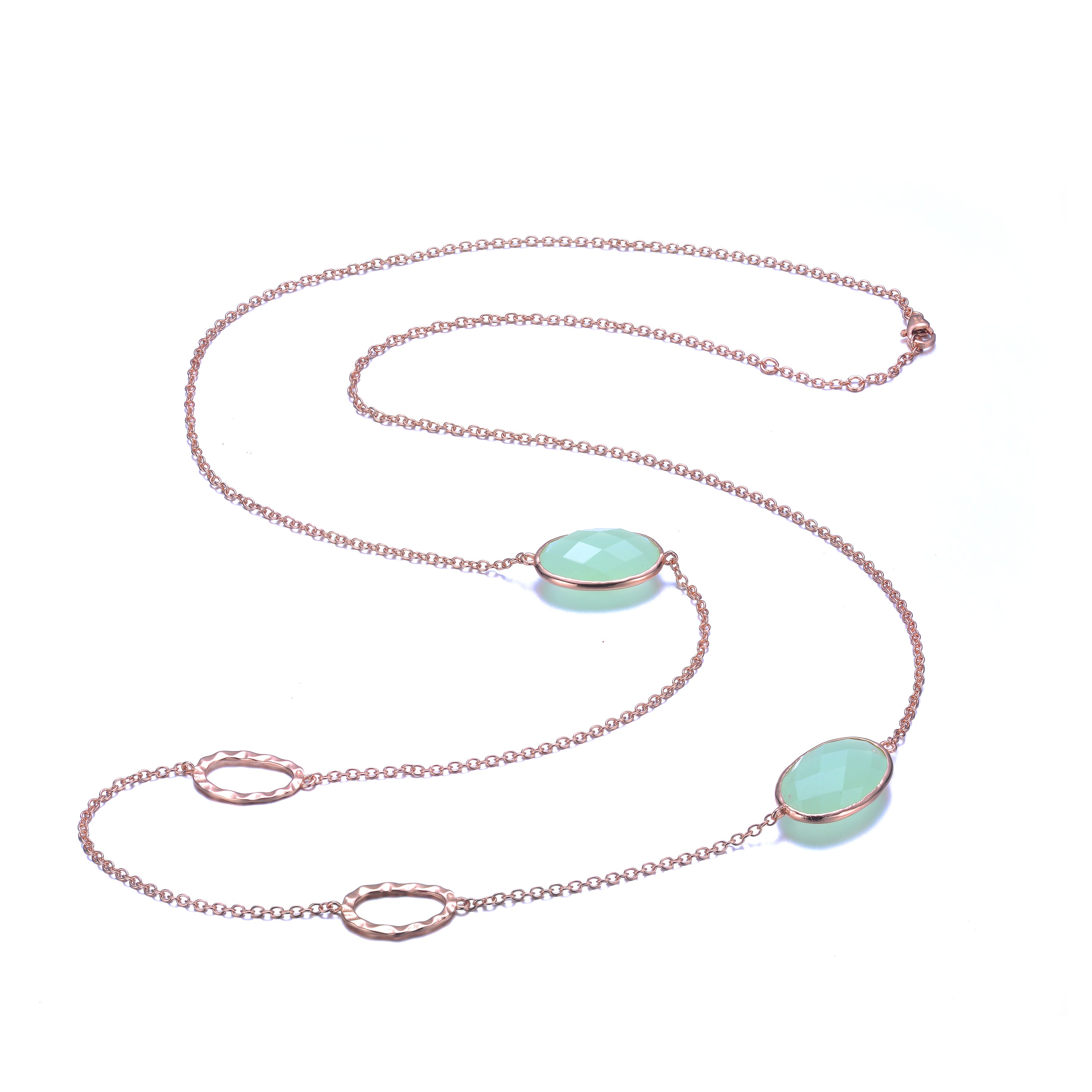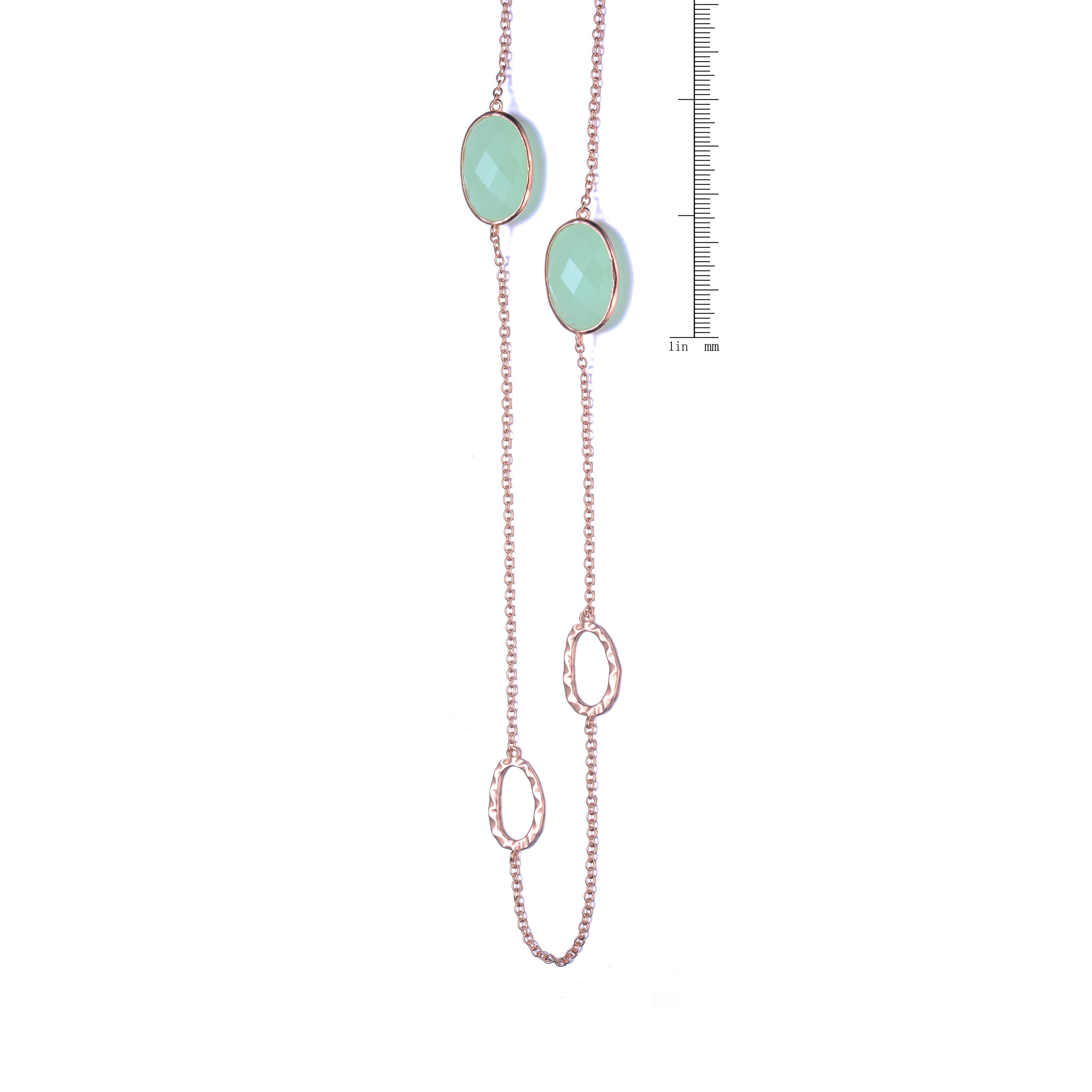 This assymmetrical light green sterling silver double necklace is an interesting piece to wear. It has two large light green stones and loops bedazzled on a fine link chain. The slender chain of the necklace is rose gold plated creating a candy-like appearance.