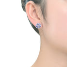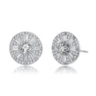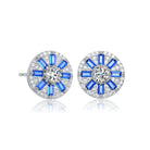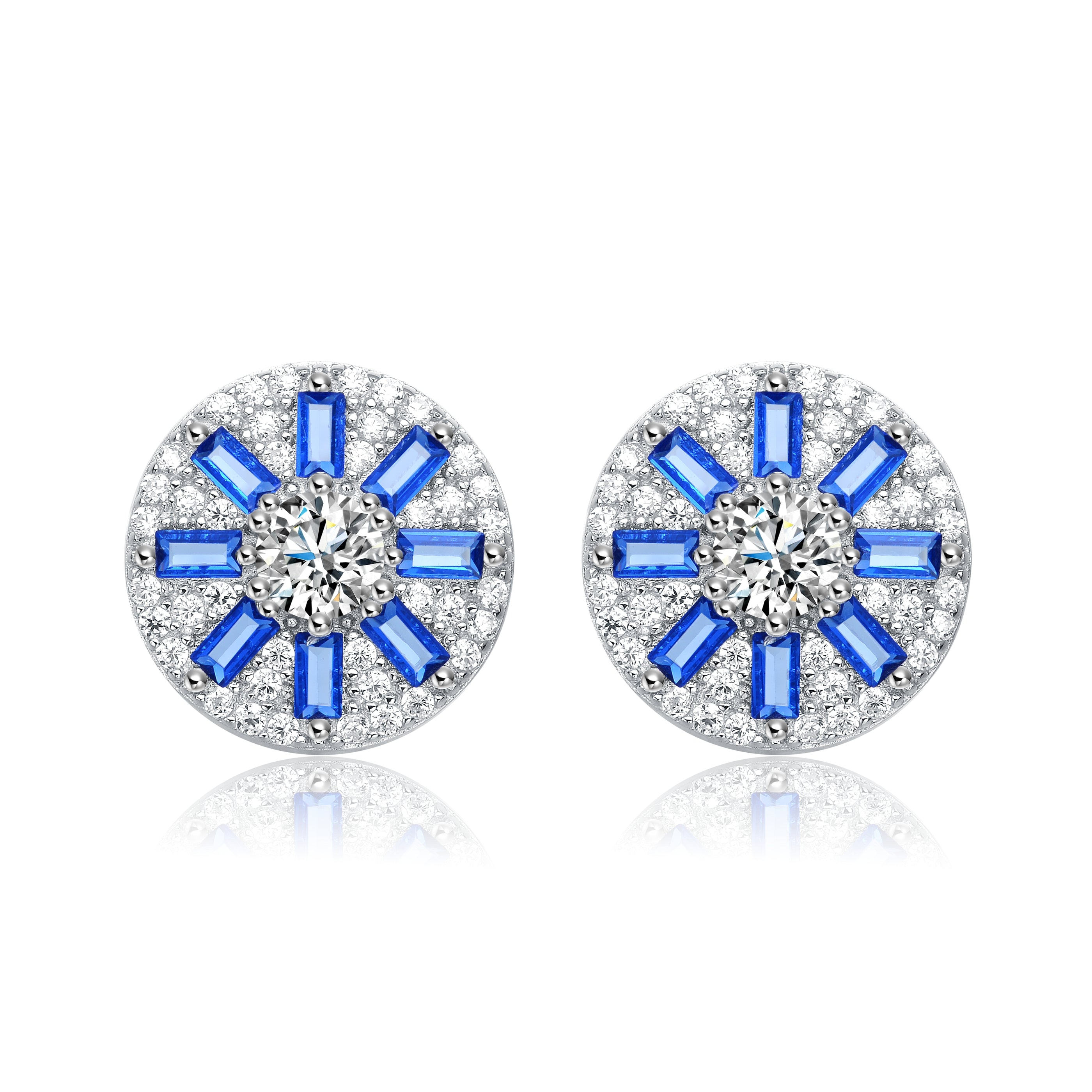 These modern stud earrings are perfect addition to any outfit. This simple design is formed with center of clear round Cubic Zirconia, clear baguette stones surrounding the center and small round stones between each baguette. These earrings are available in White Gold plating. The item is secured with butterfly closure. Also available in sapphire cubic zirconia.