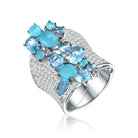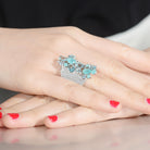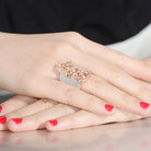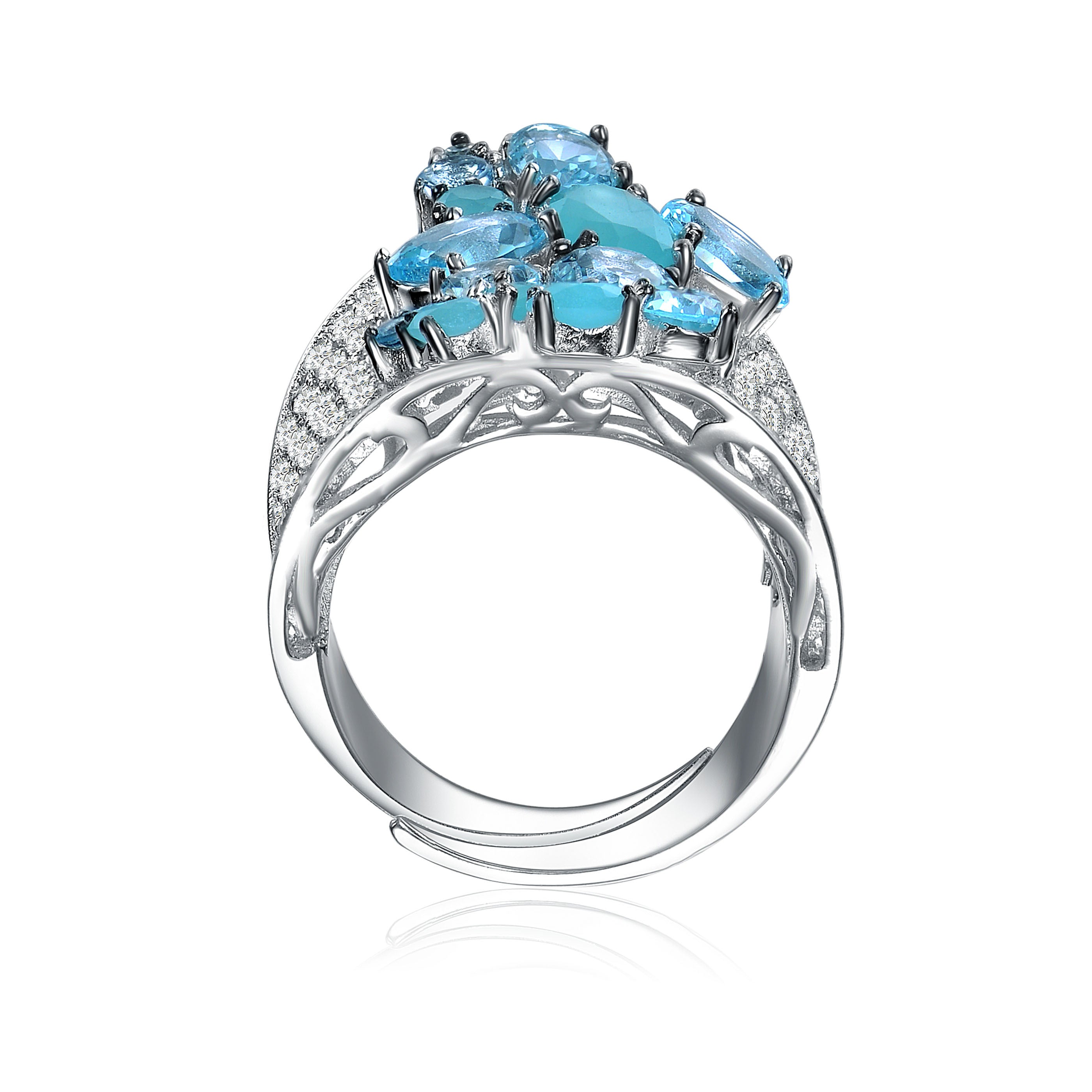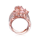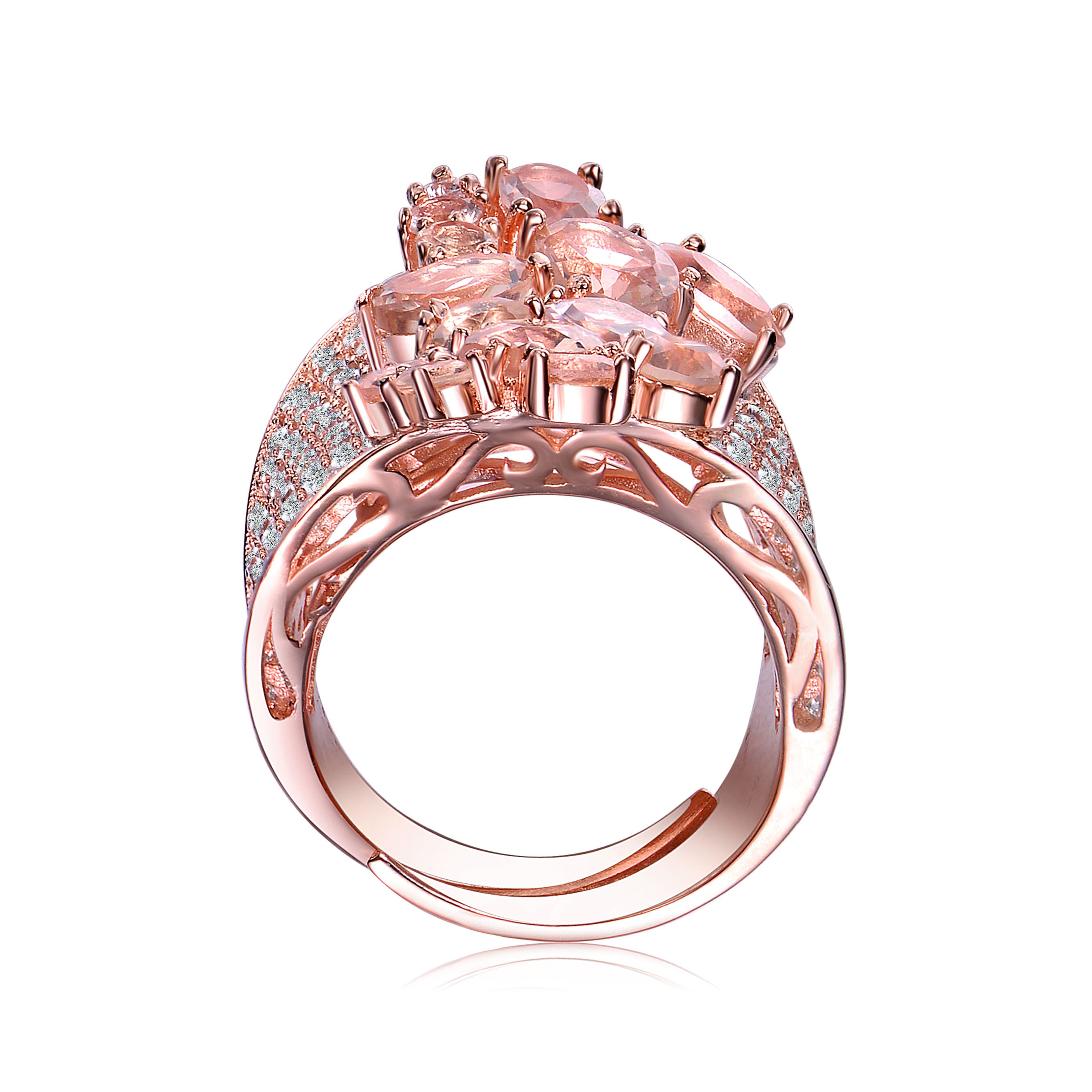 Classic paved design features oval shaped morganite or blue turquoise cubic zirconia placed in the middle of the setting with accents of small round cut clear gems in the band. This paved ring is made from .925 sterling silver plated with rose gold. Size available in 6, 7, and 8 and Morganite or Blue Turquoise