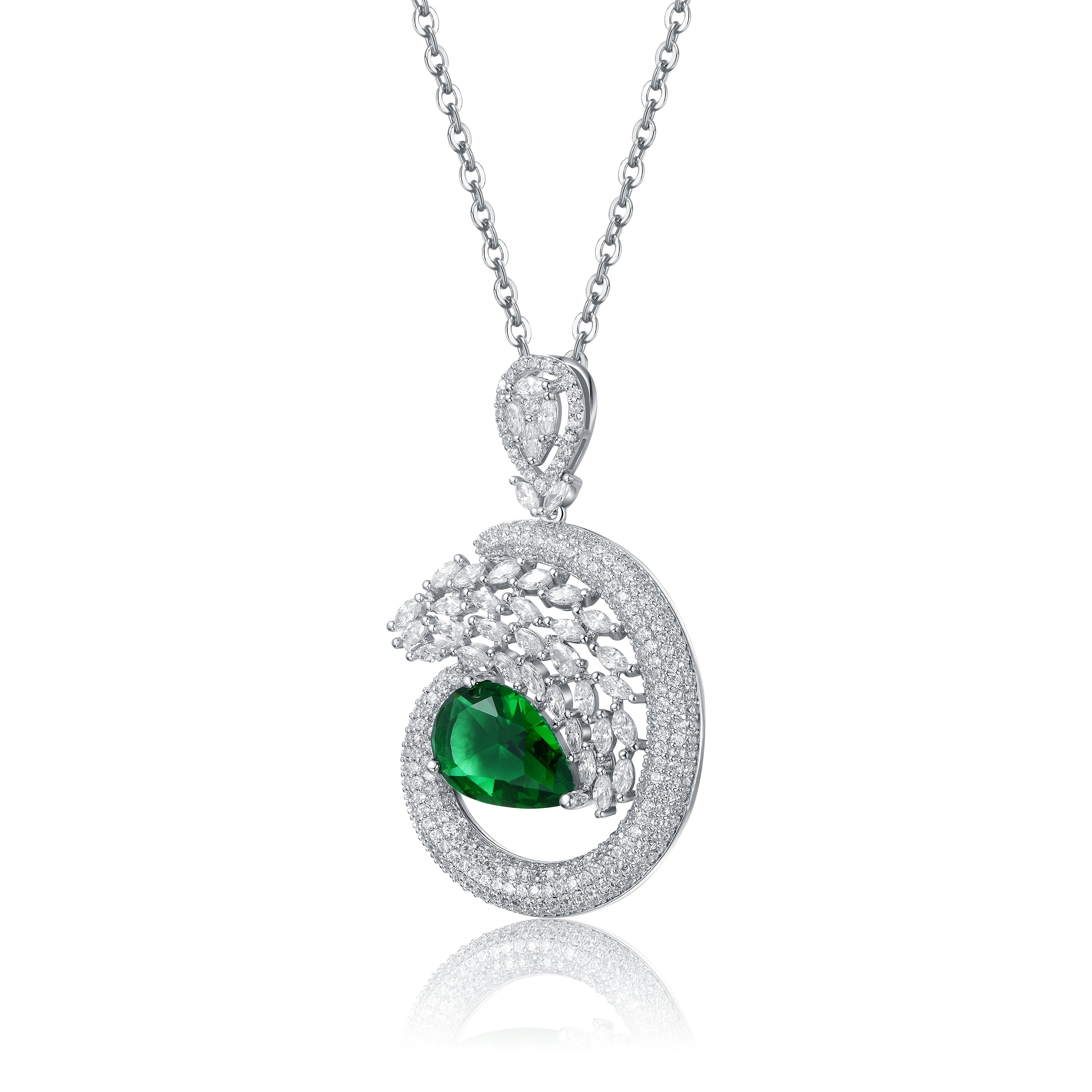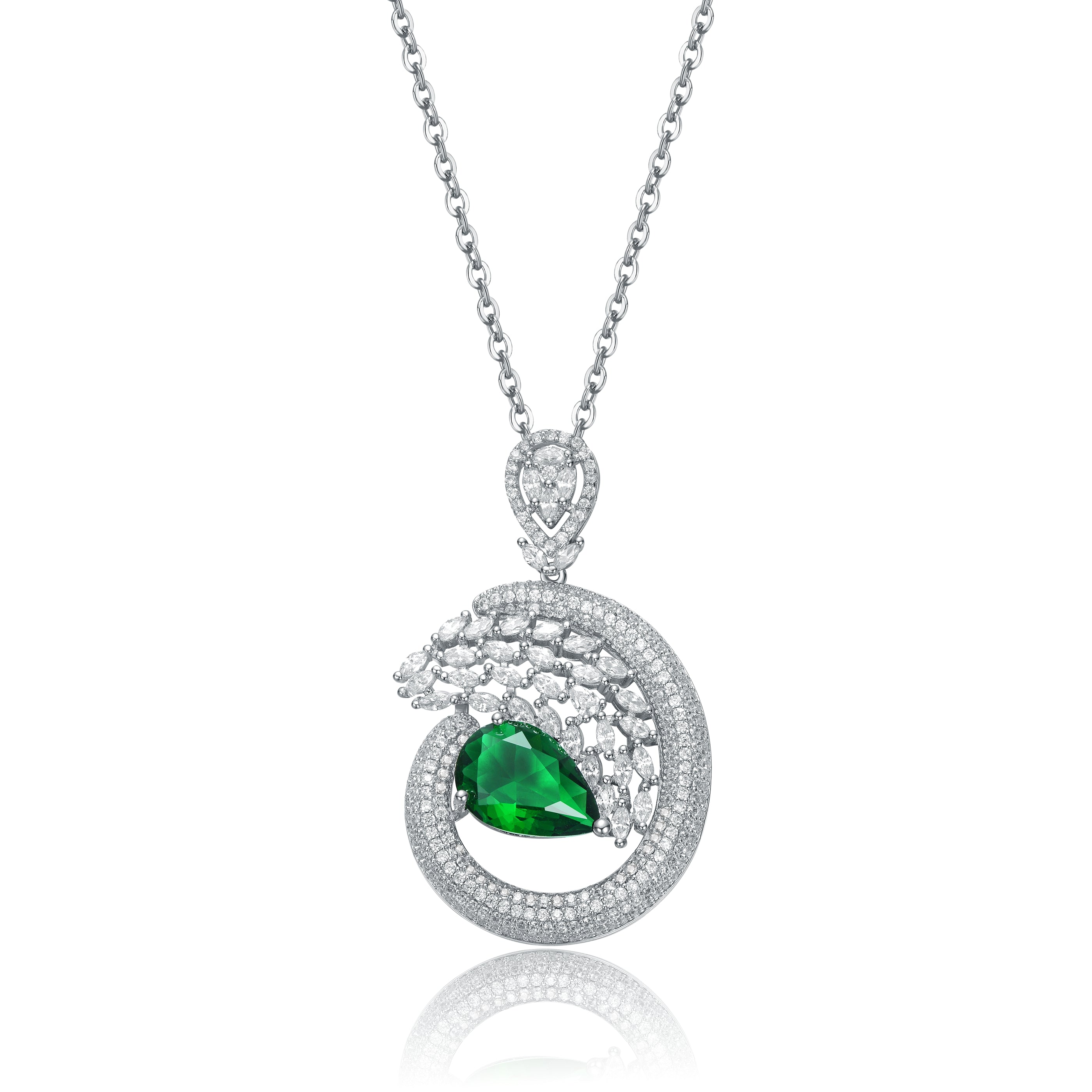 Elevate your collection with this dazzling sterling silver necklace, designed to capture attention with its intricate and luxurious charm. The necklace begins with a small pear-shaped charm adorned with sparkling round cubic zirconia, exuding elegance and sophistication. Hanging gracefully from this is a unique 3/4 irregular open circle, featuring marquise-cut cubic zirconia in prong settings on the first half. At its center, a larger emerald green pear-shaped cubic zirconia, representing the birthstone for the month of May, radiates opulence and allure. This stunning design is completed with a secure lobster clasp, ensuring both beauty and functionality. Perfect for adding a touch of glamour to any outfit, this necklace is an exquisite piece for those who appreciate fine craftsmanship and timeless style.