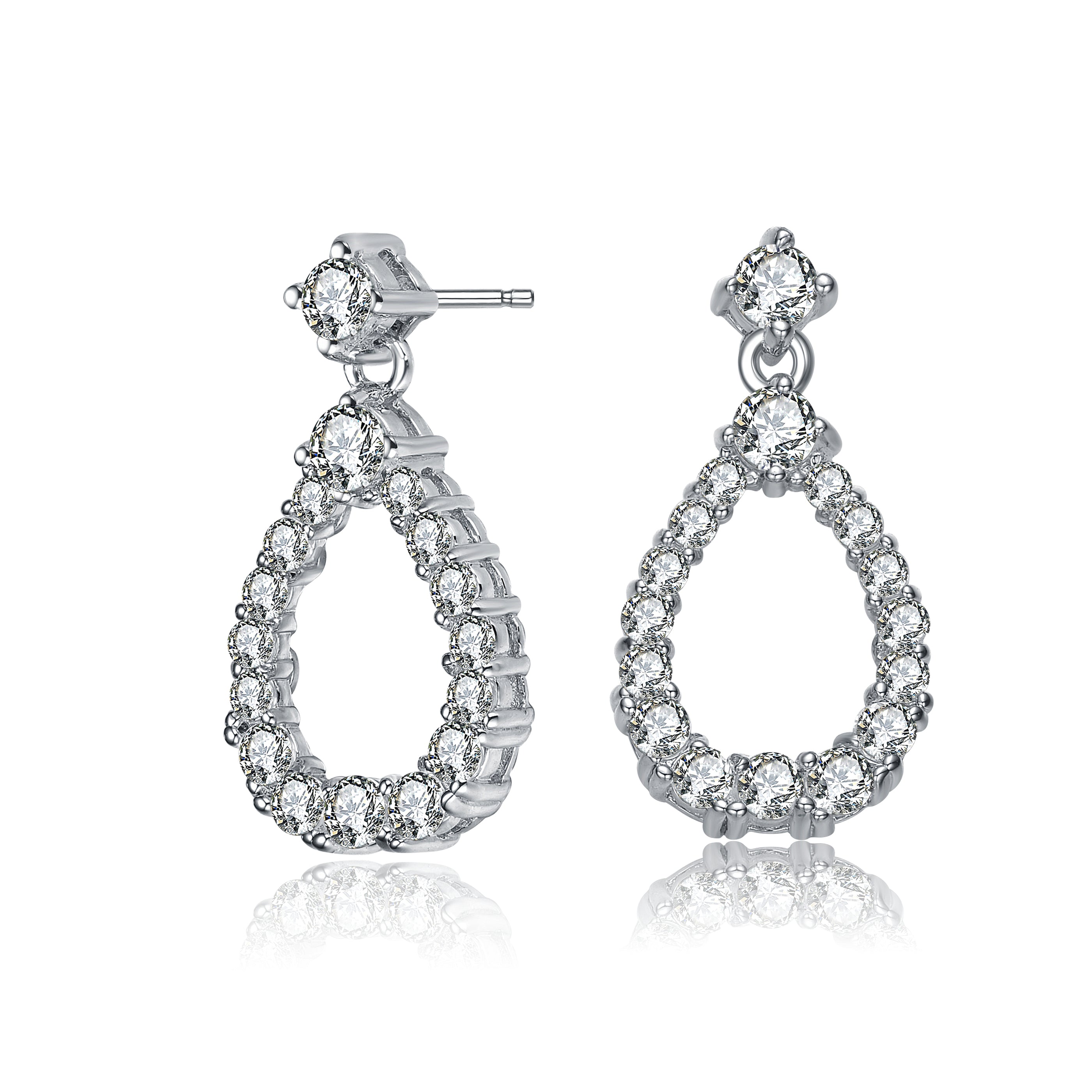 Simple yet gorgeous earrings feature an open pear shape studded with clear round Cubic Zirconia. Each piece is set in Sterling silver with Rhodium plated and secures with butterfly clasp.