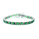 Classy Sterling Silver White Gold tennis bracelet. This stunning bracelet features an oval Emrald green cubic zirconia stones and clear round cubic zirconia stones set in basket two stones on each side of the oval stone. Crafted with fine Sterling silver Rhodium plated and secures with a box clasp. makes a great gift as well.