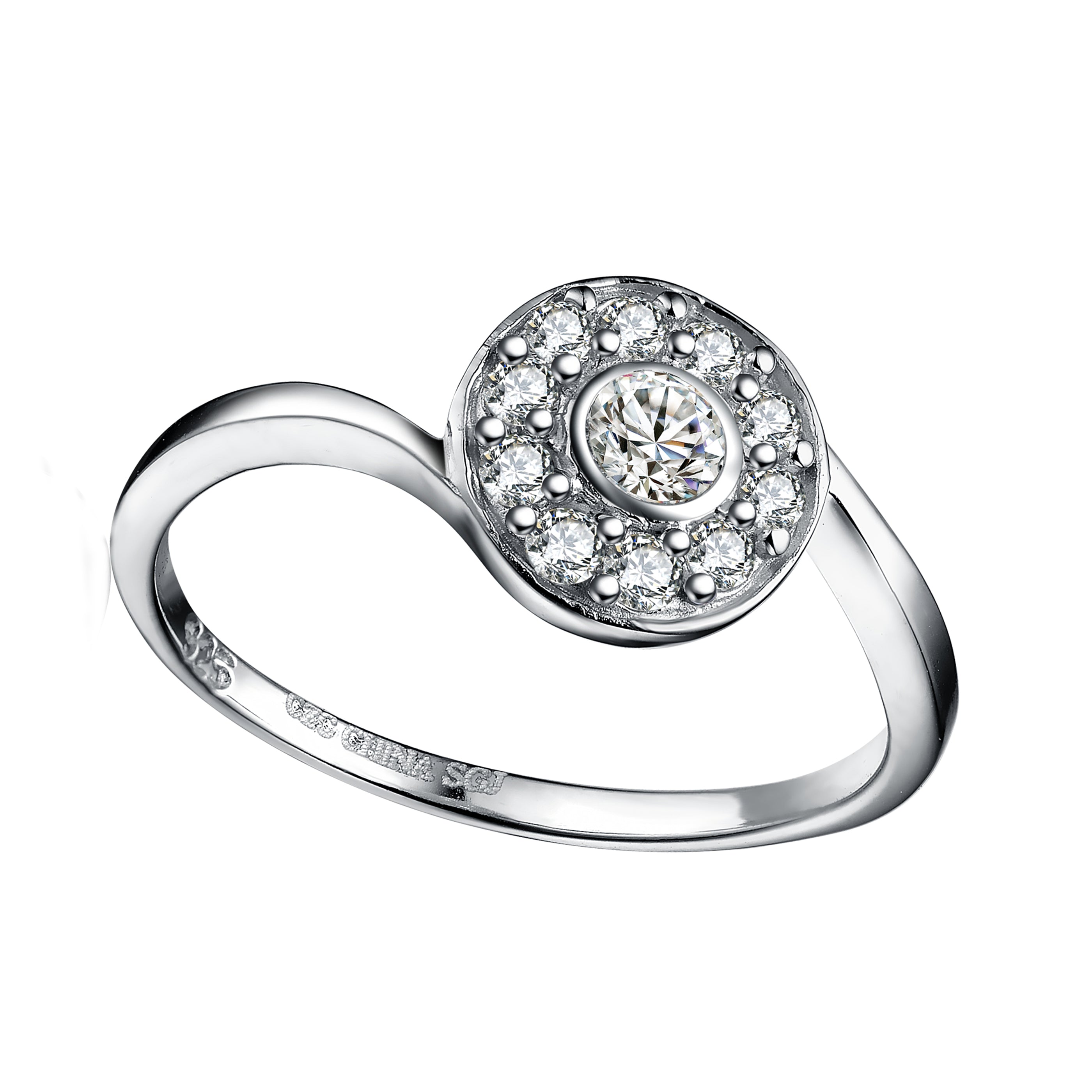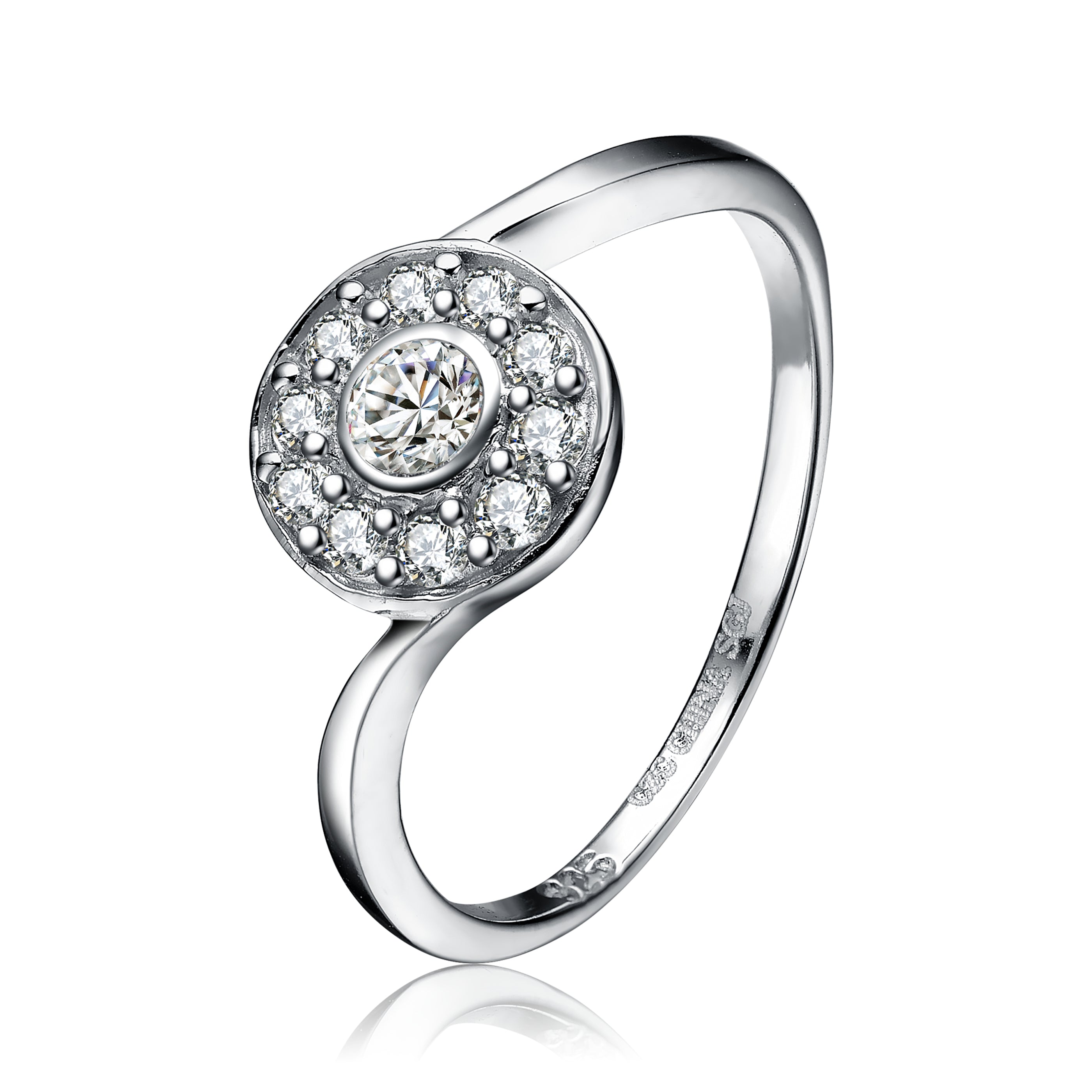 A unique approach is taken with the band of this sterling silver ring. It also displays beautiful clear pave cubic zirconia stones in a circular pattern.