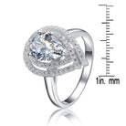 Feel like a million bucks when wearing this sterling silver ring. It uses a pear shaped cubic zirconia solitaire surrounded by two halos of smaller clear cubic zirconias as a focal point.