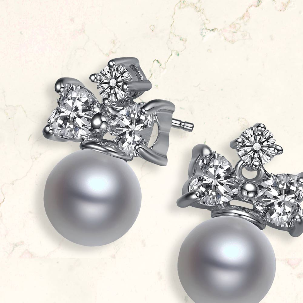 Simple and classic these white round Freshwater Pearl earrings are perfect for day or evening. These earrings are also accentuated with two clear heart and a round Cubic Zirconia to create the earrings post. Crafted of Sterling silver with Rhodium plated these earrings secure with butterfly clasp.