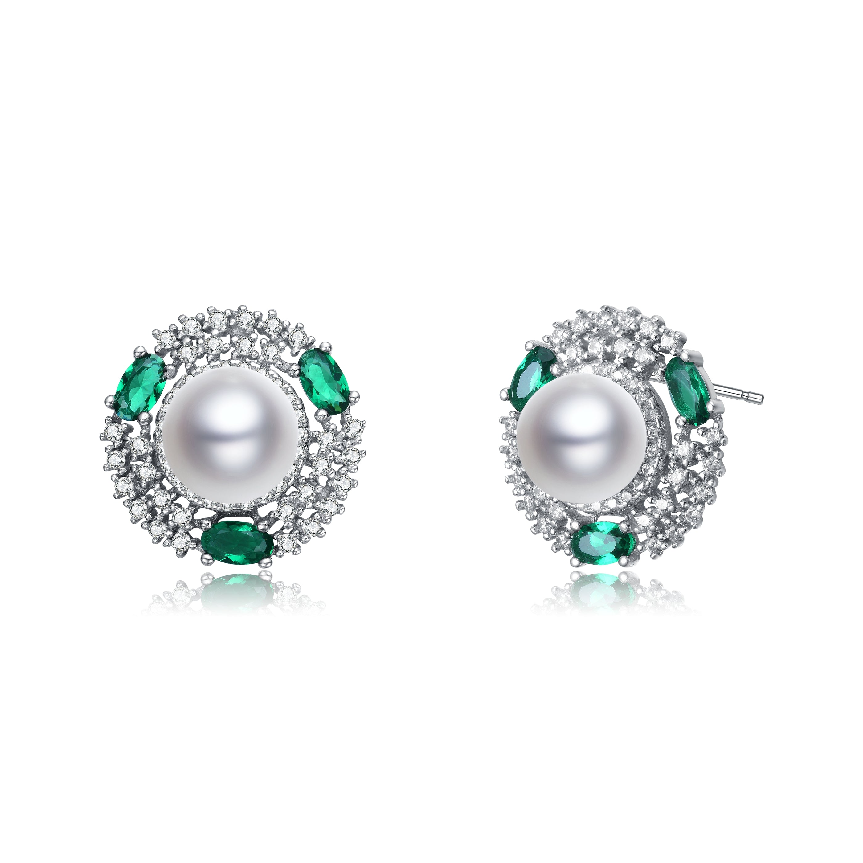 These exquisite stud earrings feature a lustrous pearl at the center, encircled by sparkling emerald cubic zirconia stones. The sterling silver setting is enhanced with rhodium plating for added durability and shine, creating a timeless piece of jewelry perfect for adding a touch of elegance to any outfit. Ideal for both everyday wear and special occasions, these earrings are a must-have addition to any jewelry collection.