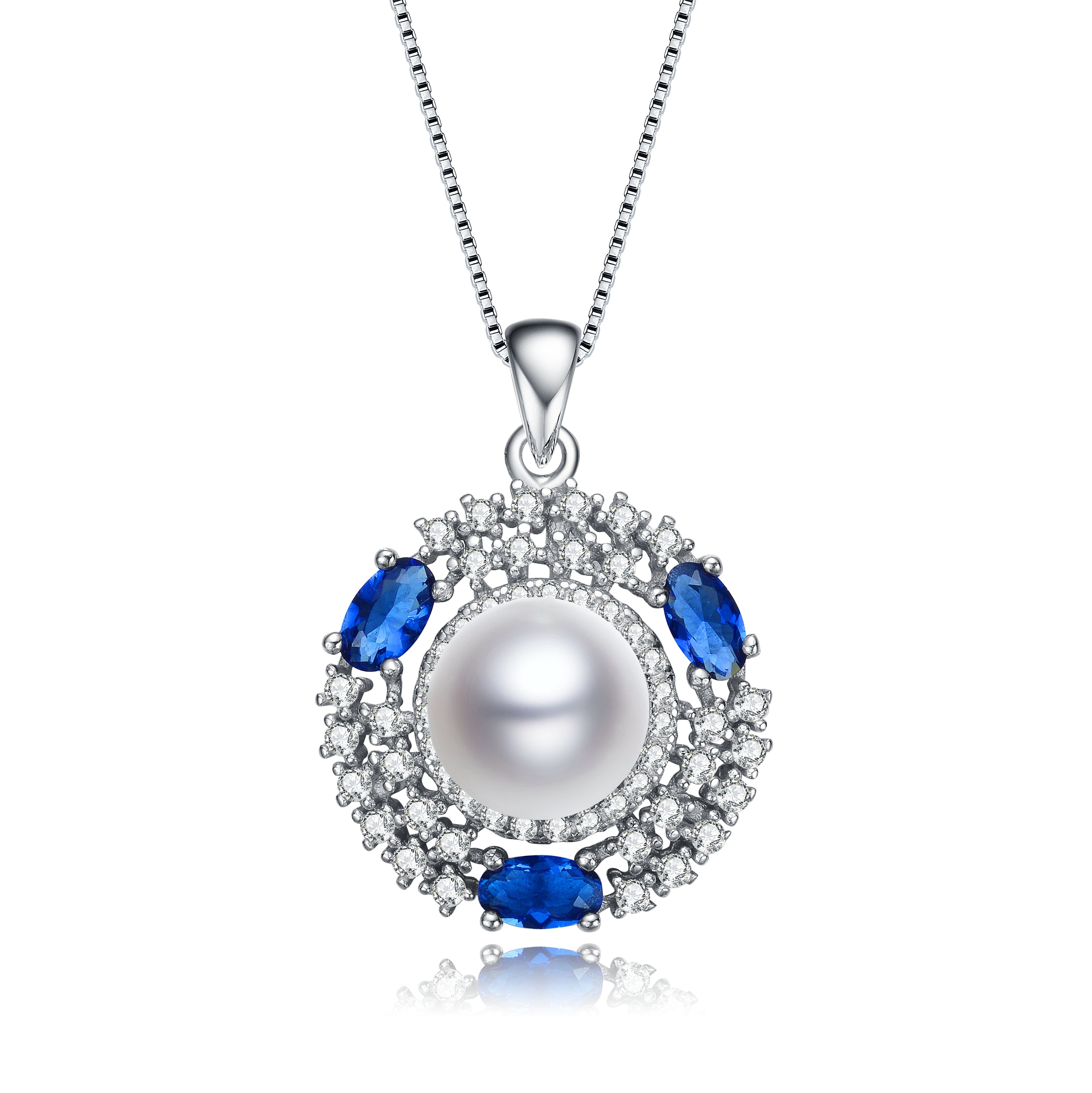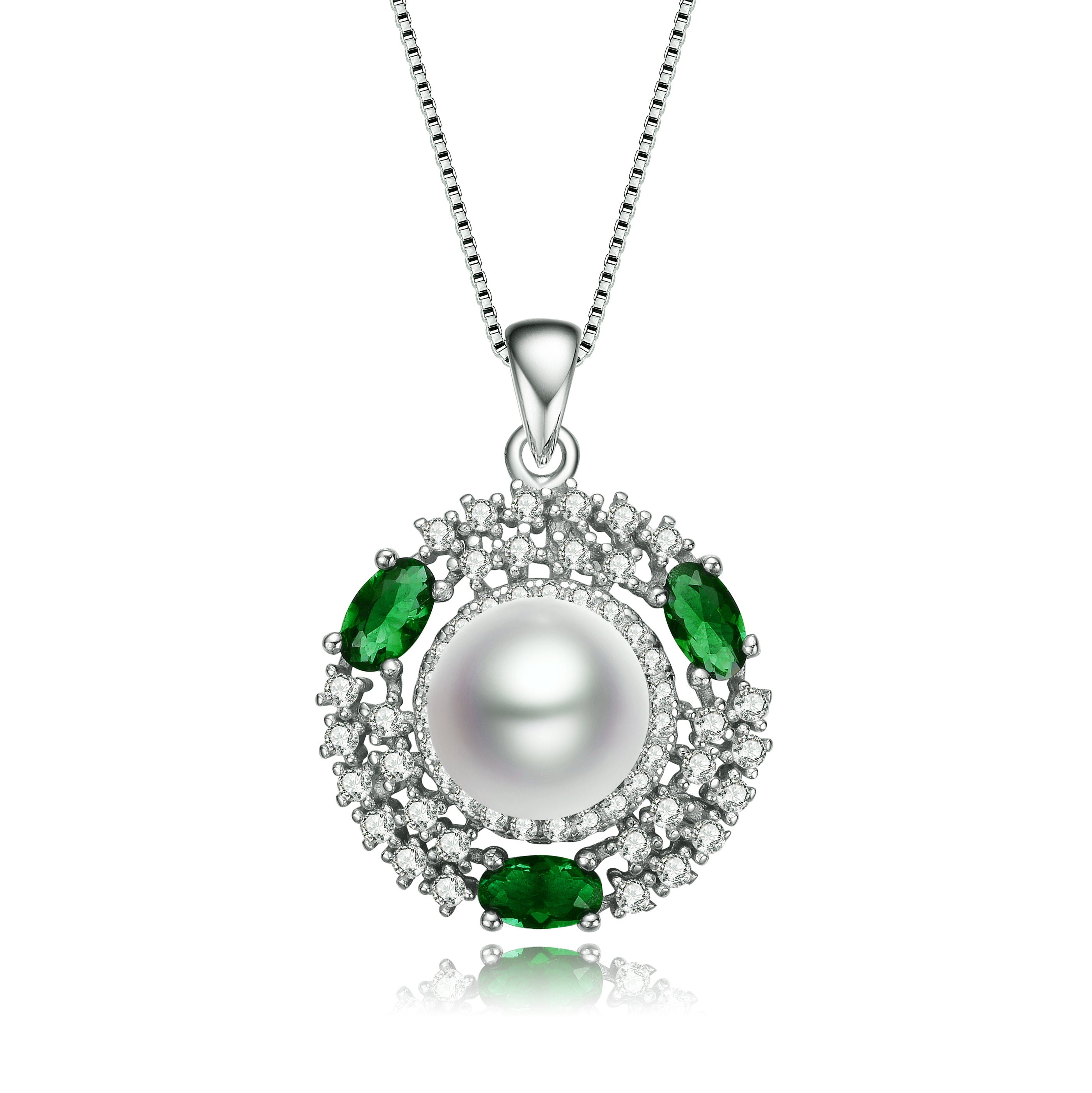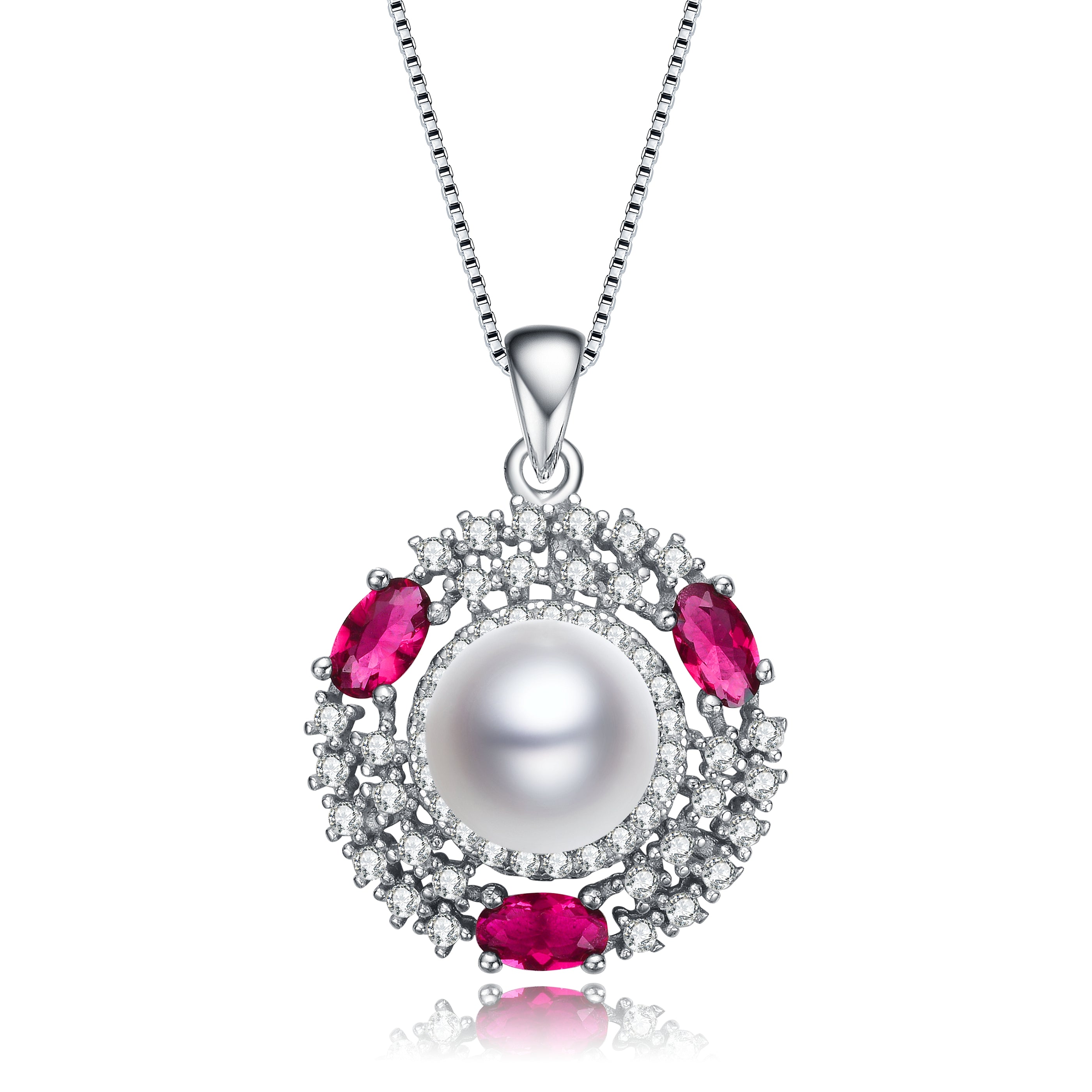 These exquisite pendant feature a lustrous pearl at the center, encircled by sparkling ruby cubic zirconia stones. The sterling silver setting is enhanced with rhodium plating for added durability and shine, creating a timeless piece of jewelry perfect for adding a touch of elegance to any outfit. Ideal for both everyday wear and special occasions.
