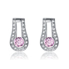 This lovely set of earrings has a knack for presenting an unconventional look. Clear cubic zirconia stones are arranged in a horseshoe pattern and accented by a small pink cubic zirconia.