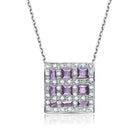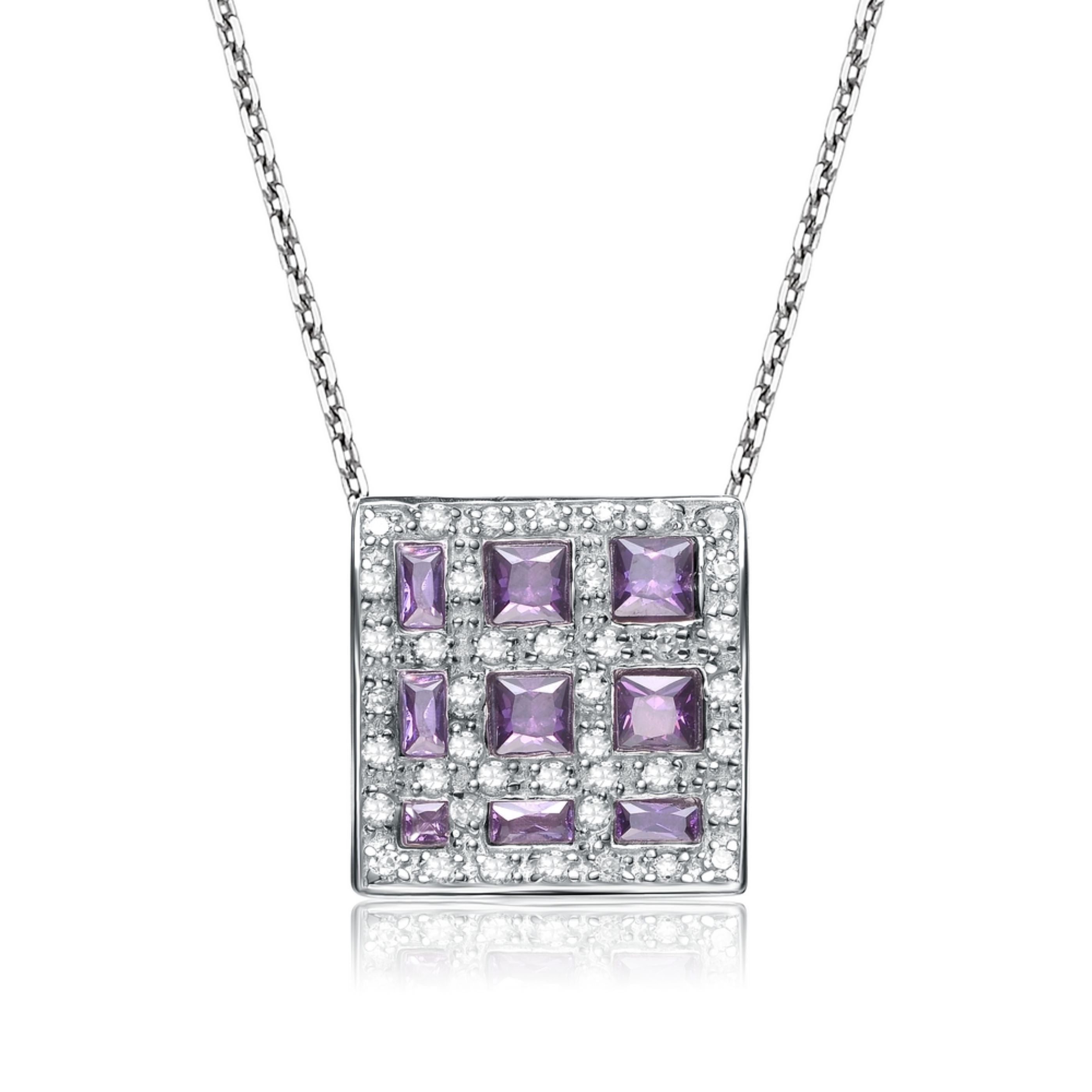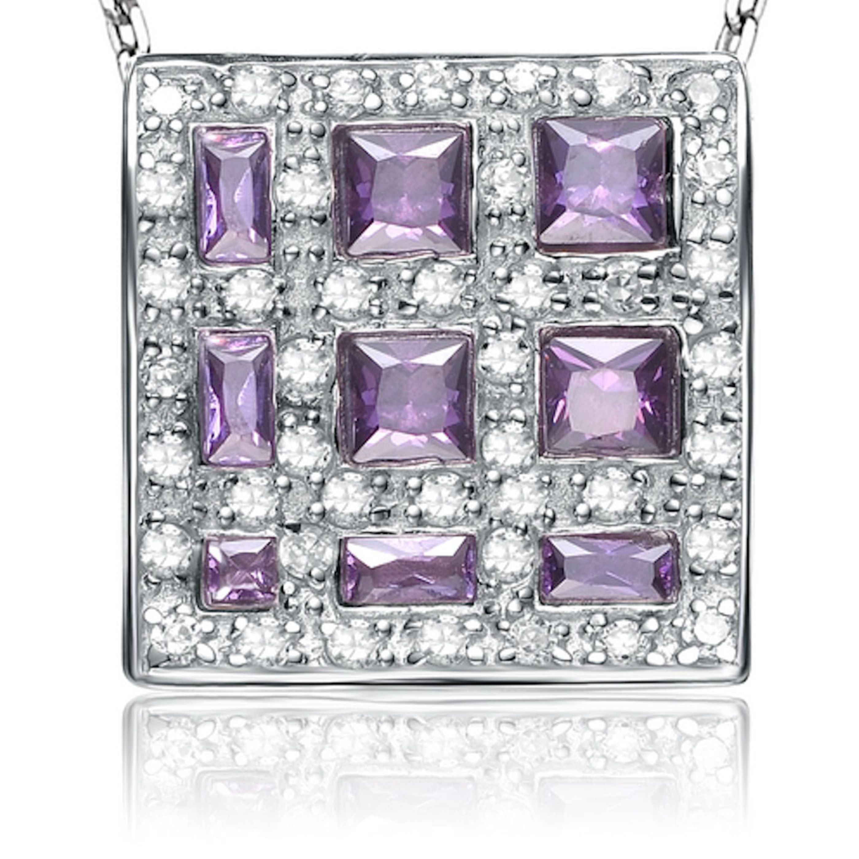 Don’t be afraid to make a bold fashion statement by wearing this sterling silver necklace. It highlights purple and clear cubic zirconia stones in the overall shape of a square.