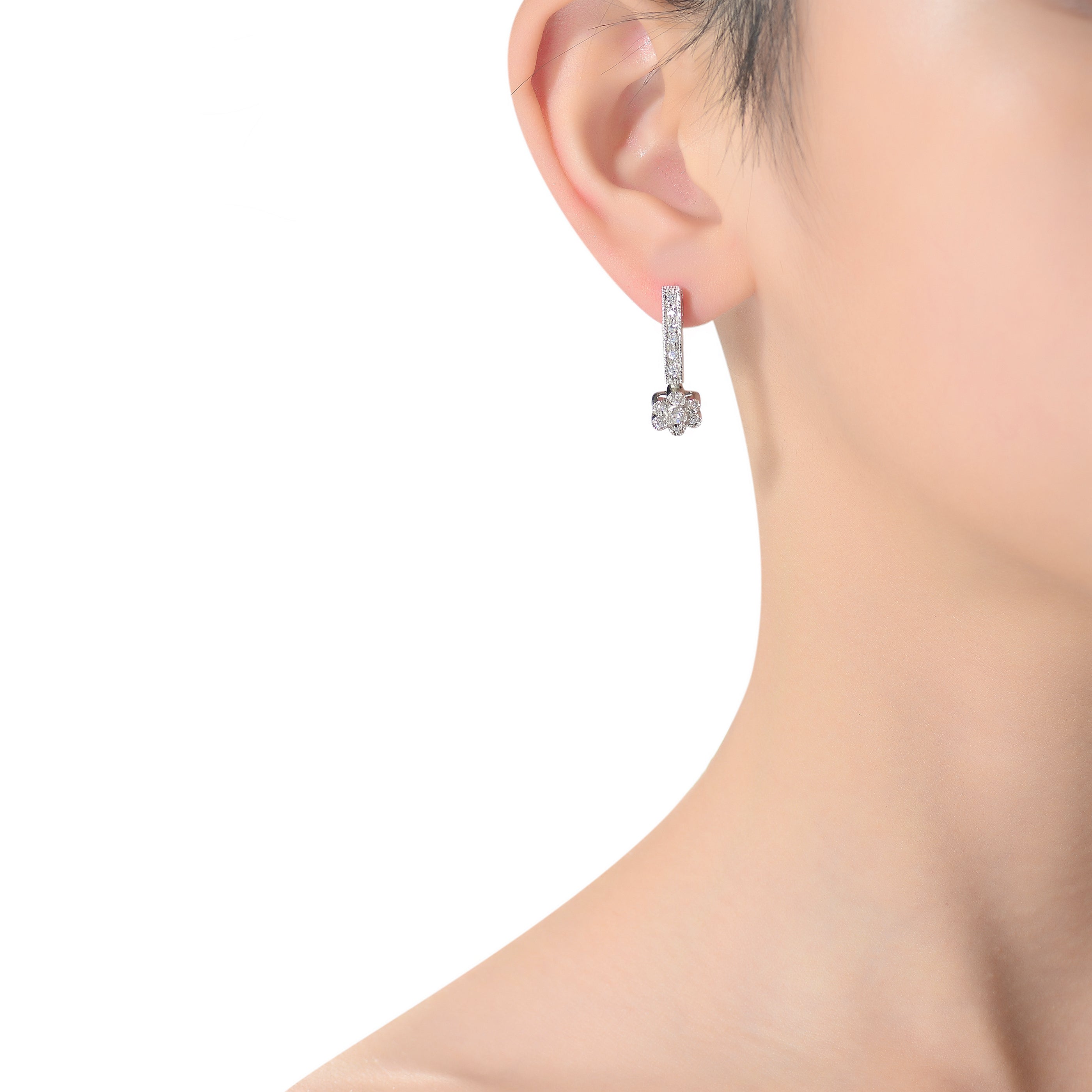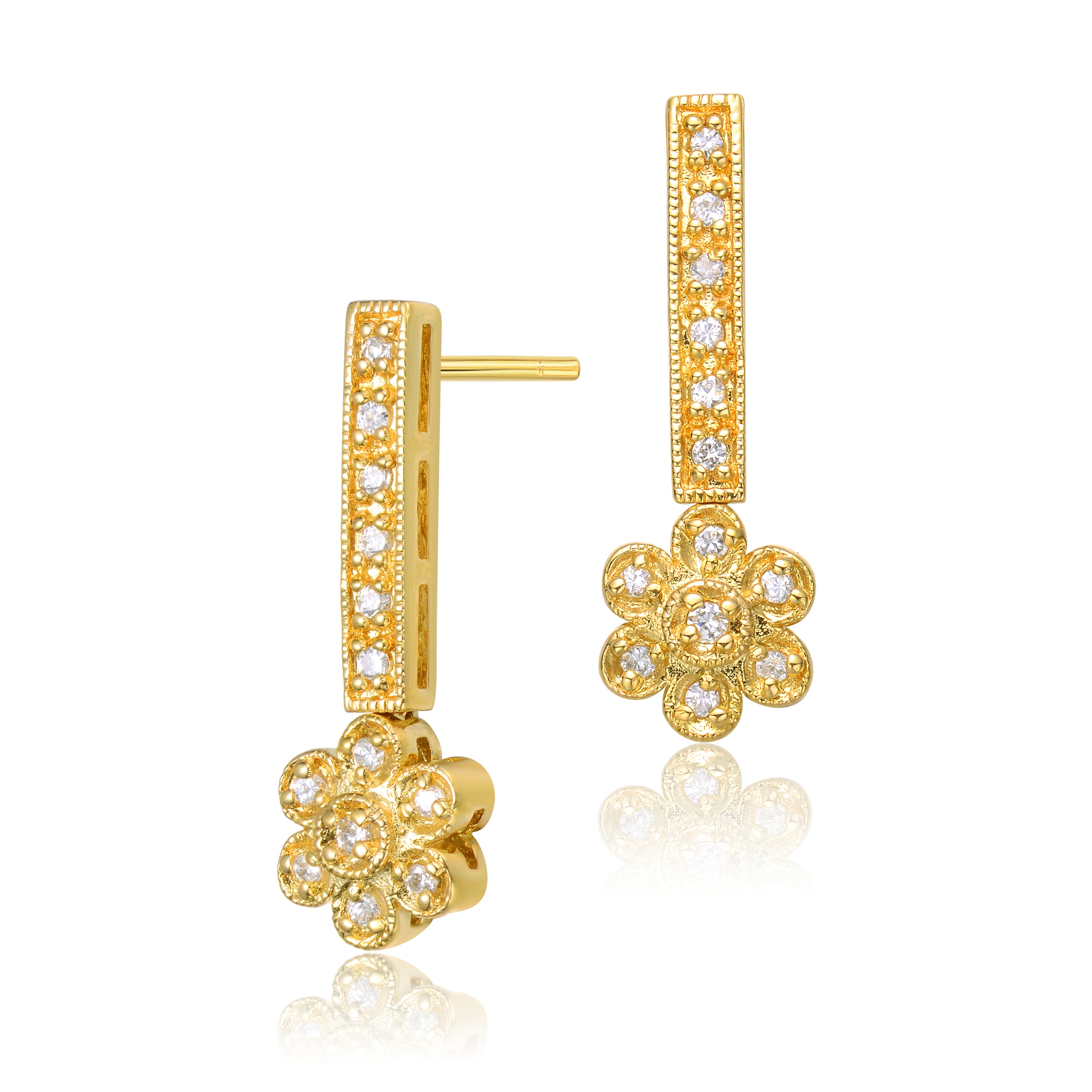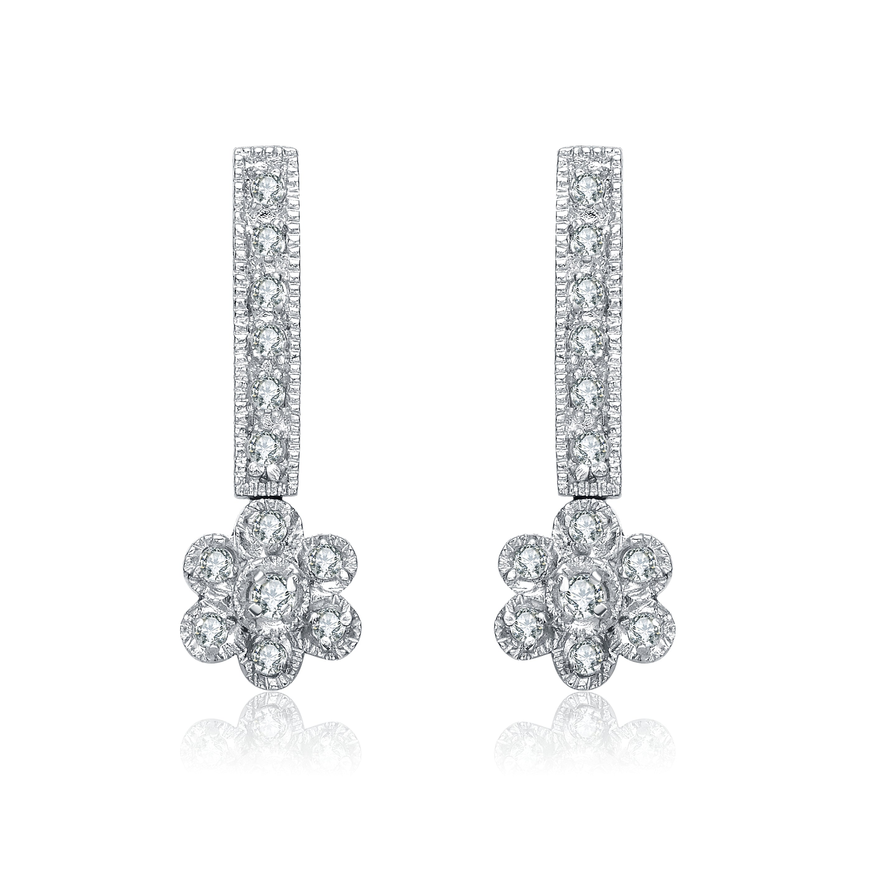Add a touch of timeless elegance with these sterling silver drop earrings, expertly plated in rhodium for a lasting, lustrous finish. The design features a delicate flower motif encrusted with sparkling cubic zirconia stones that catch the light beautifully. The elongated bar detail is also adorned with brilliant CZ accents, enhancing the overall sophistication of the piece.