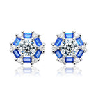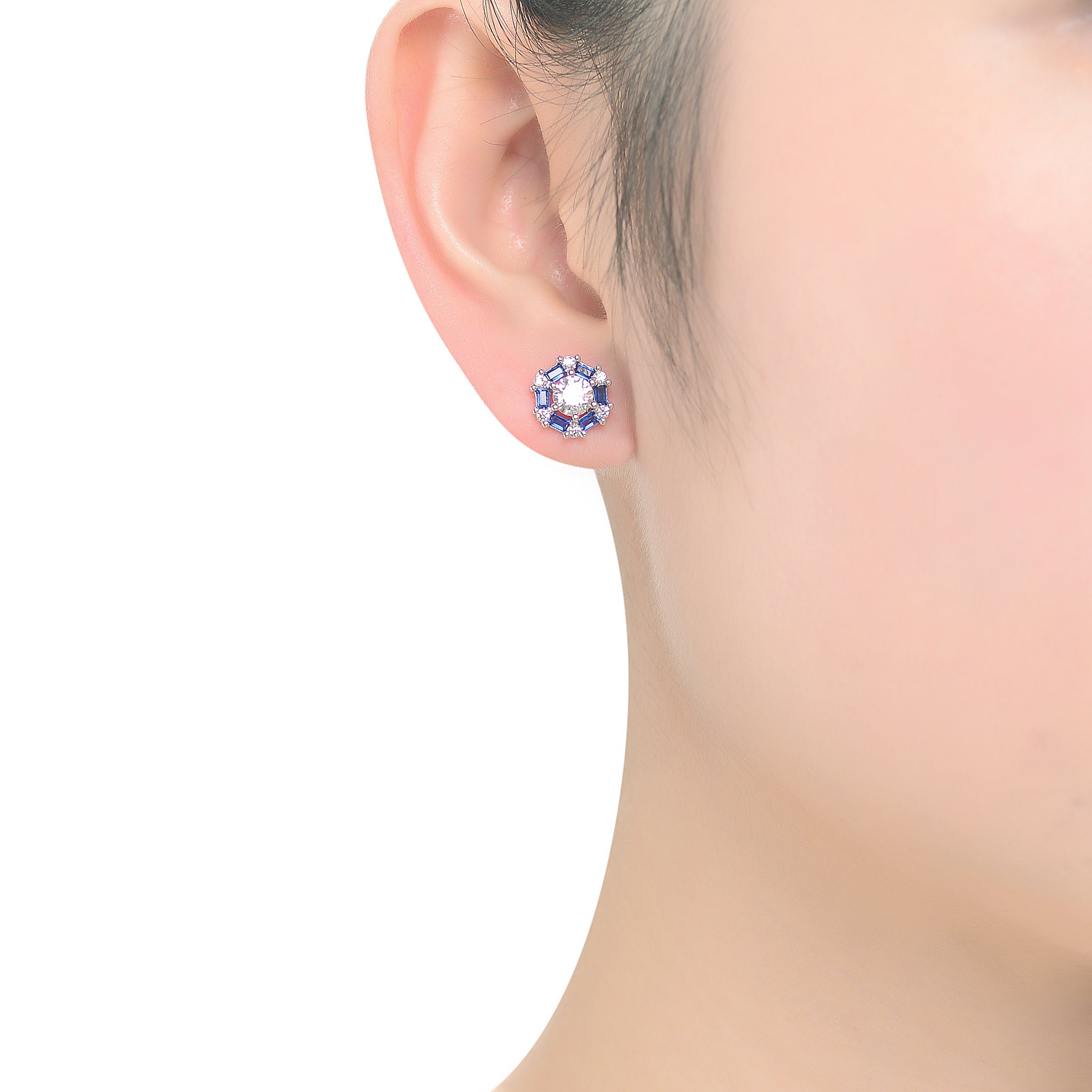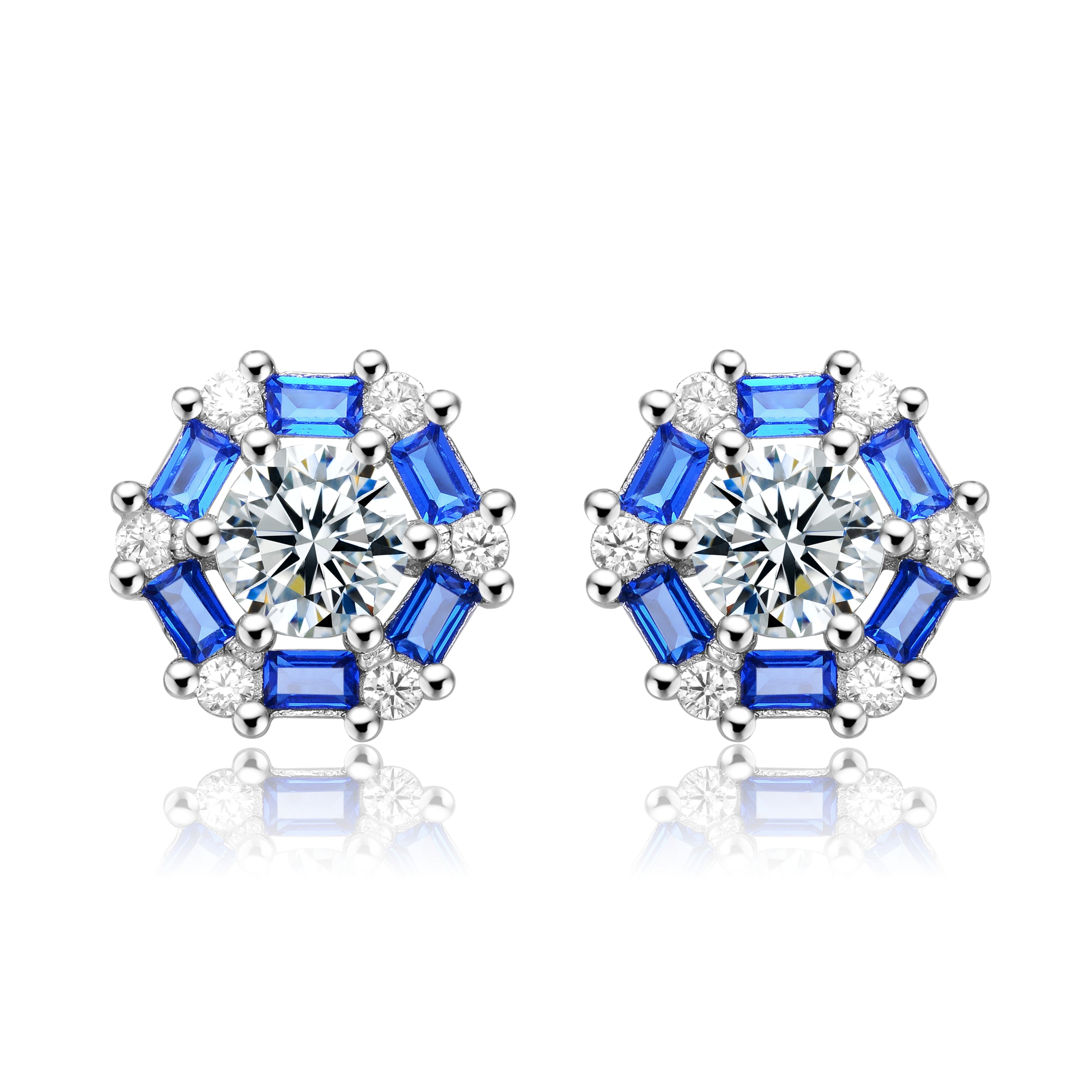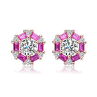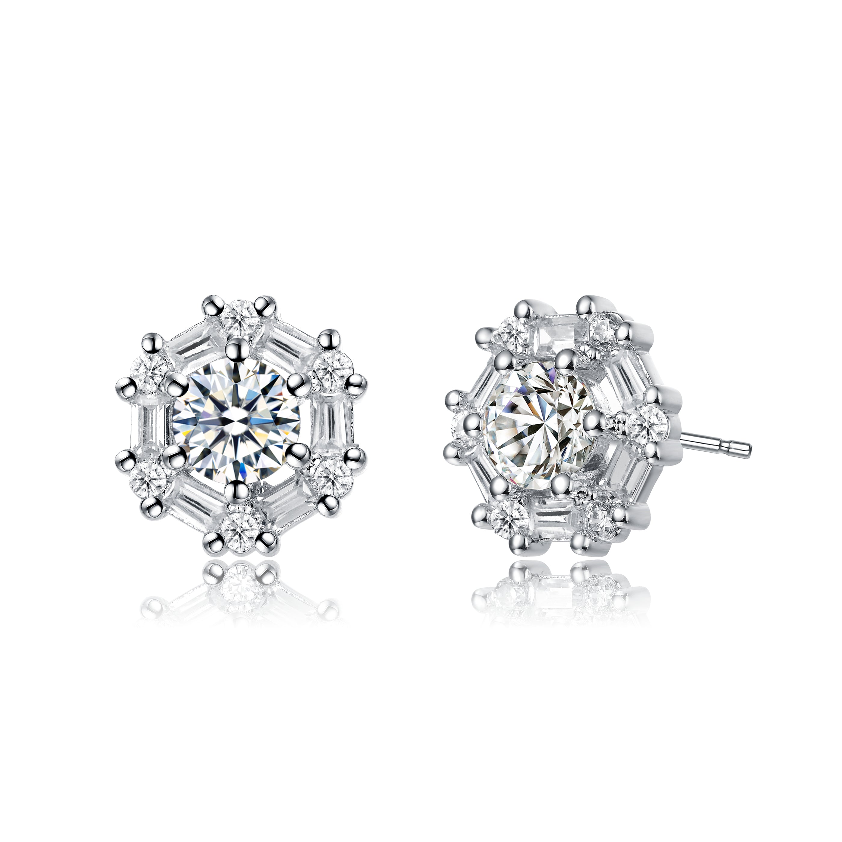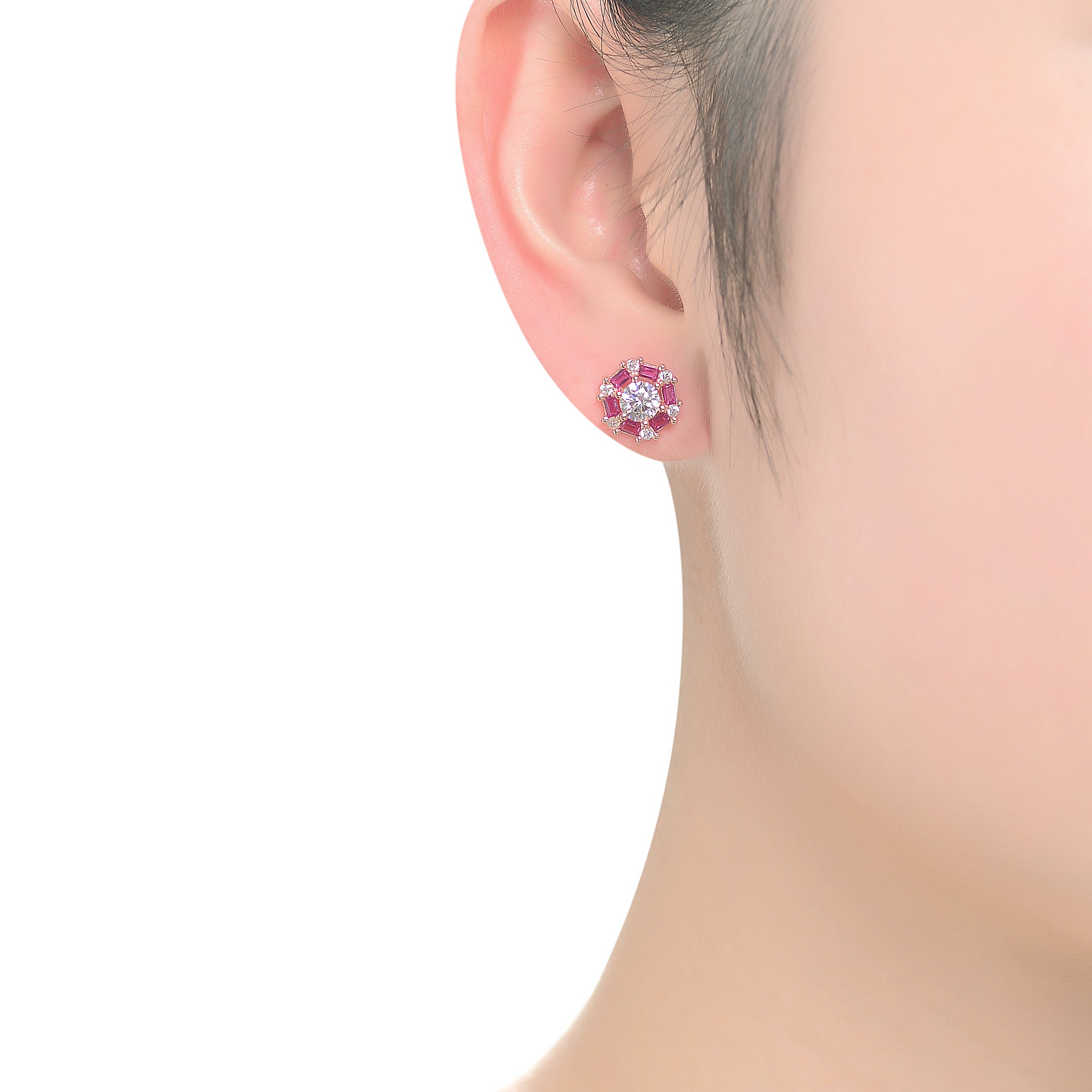 These fashionable stud earrings are perfect addition to your outfit. This simple design is formed with center of clear round Cubic Zirconia baguette stones surrounding the center and small clear round stone between each baguette. These Sterling Silver earrings with Rhodium plating are secured with butterfly closure. Also available in ruby cubic zirconia in rose gold and sapphire cubic zirconia.