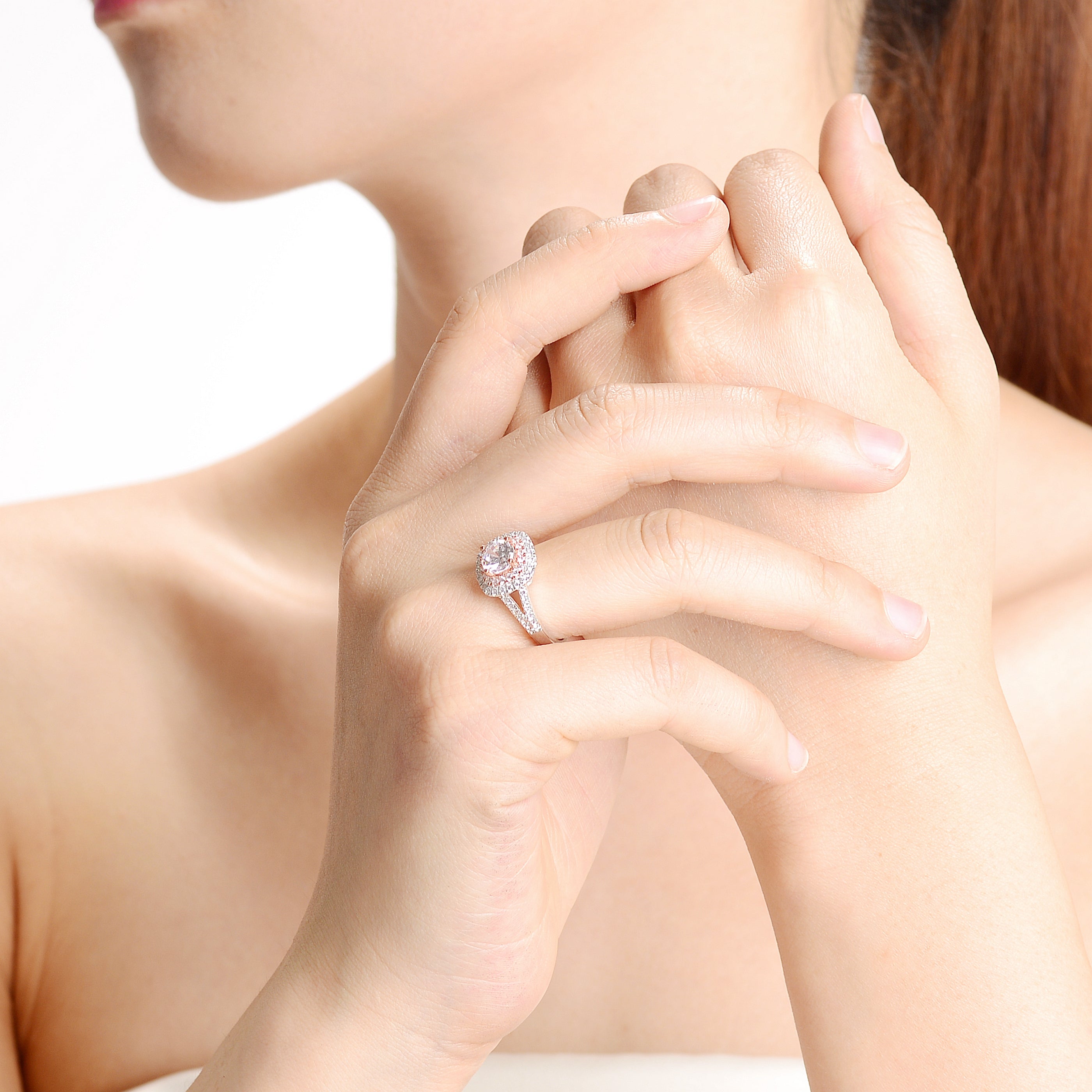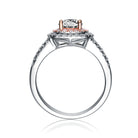 This exquisite ring is a masterpiece of craftsmanship and elegance. It features a dazzling cubic zirconia stone as the centerpiece, surrounded by a halo of smaller stones that extend along the band. The sterling silver base is enhanced with a touch of rose gold and rhodium plating, creating a stunning contrast of colors and textures. This ring is a perfect choice for anyone who loves to sparkle and shine.