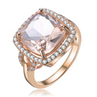 Elegant Sterling silver rose gold plated morganite cubic zirconia cocktail ring. This ring features large morganite radiant cubic zirconia stone accented by clear round cubic zirconia paved on the square frame. Crafted of .925 Sterling silver in rose gold plating and it is available in 6, 7, 8 size.