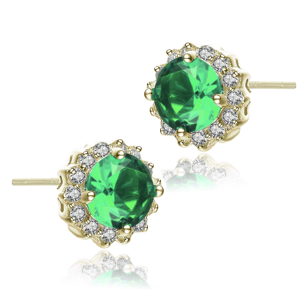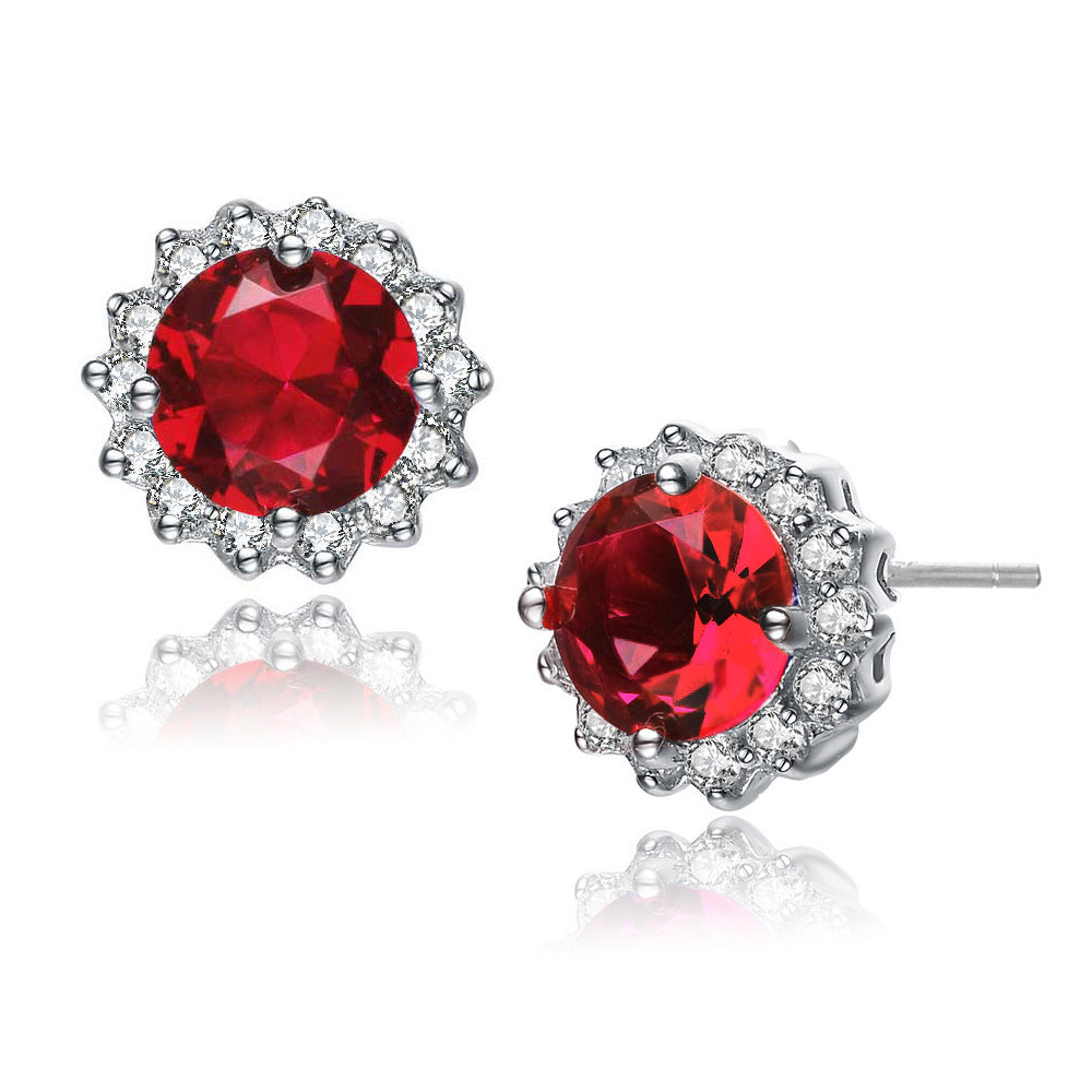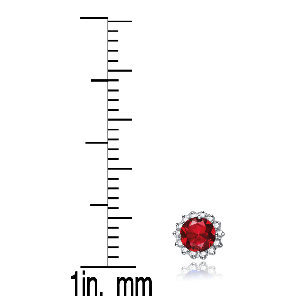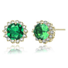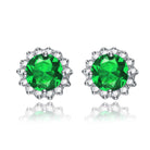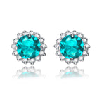 Stylish .925 Sterling silver cubic zirconia button earrings. A round sapphire cubic zirconia solitaire sits at the center and is surrounded by clear round cubic zirconia stones. Crafted of .925 Sterling silver these earrings secure with butterfly clasp. Available in colors, Emerald, Ruby, Sapphire, Torquise Blue, Morganite. To serve that extra choice of yours.