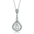 No one will be able to take their eyes off this sterling silver necklace. It features a suspended pear shaped cubic zirconia stone surrounded by smaller cubic zirconias.