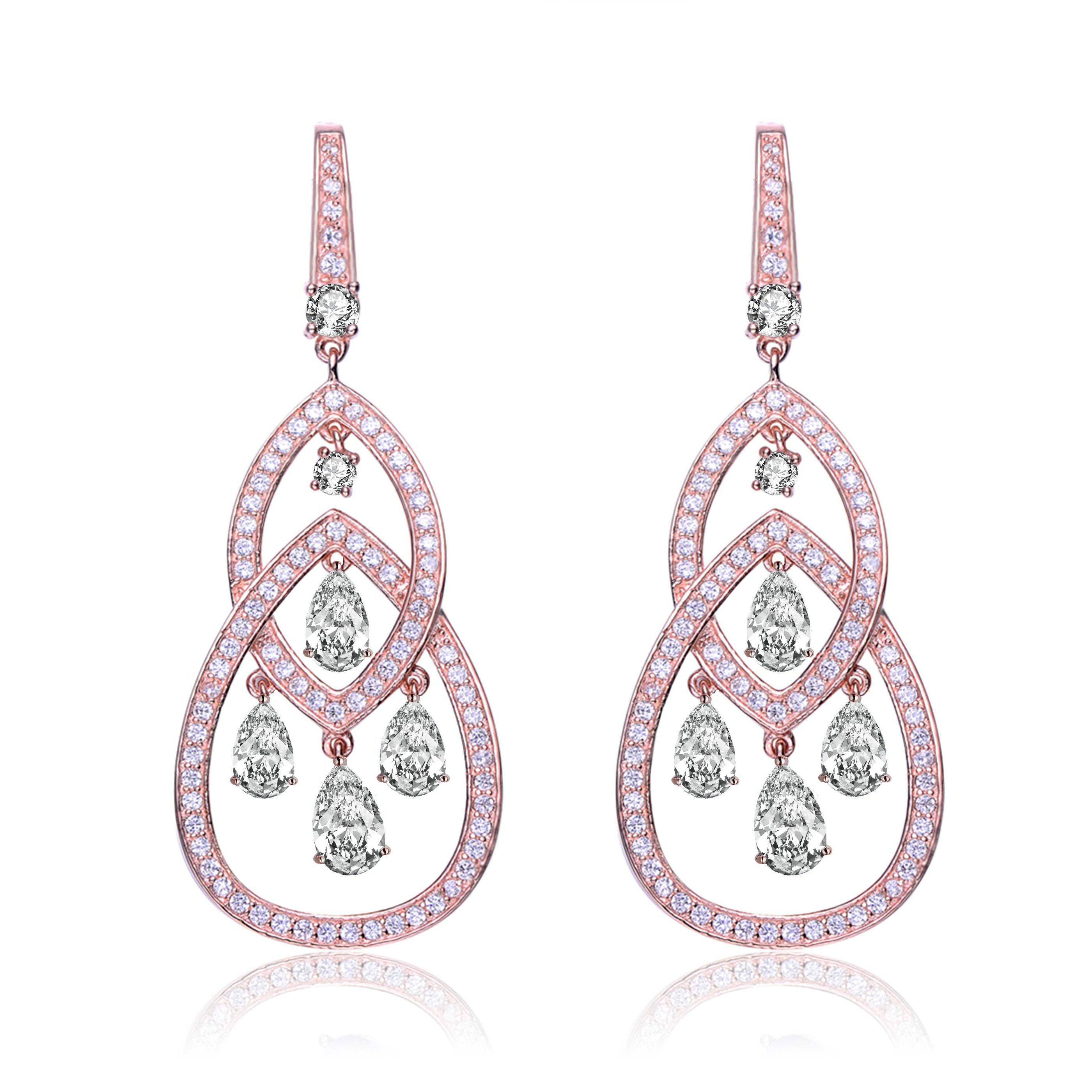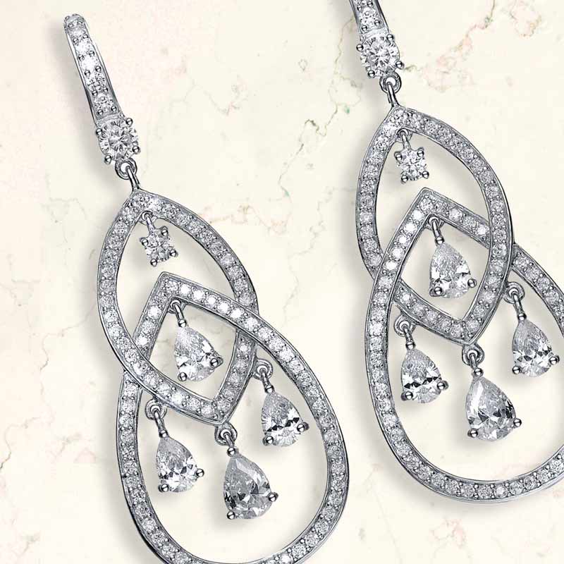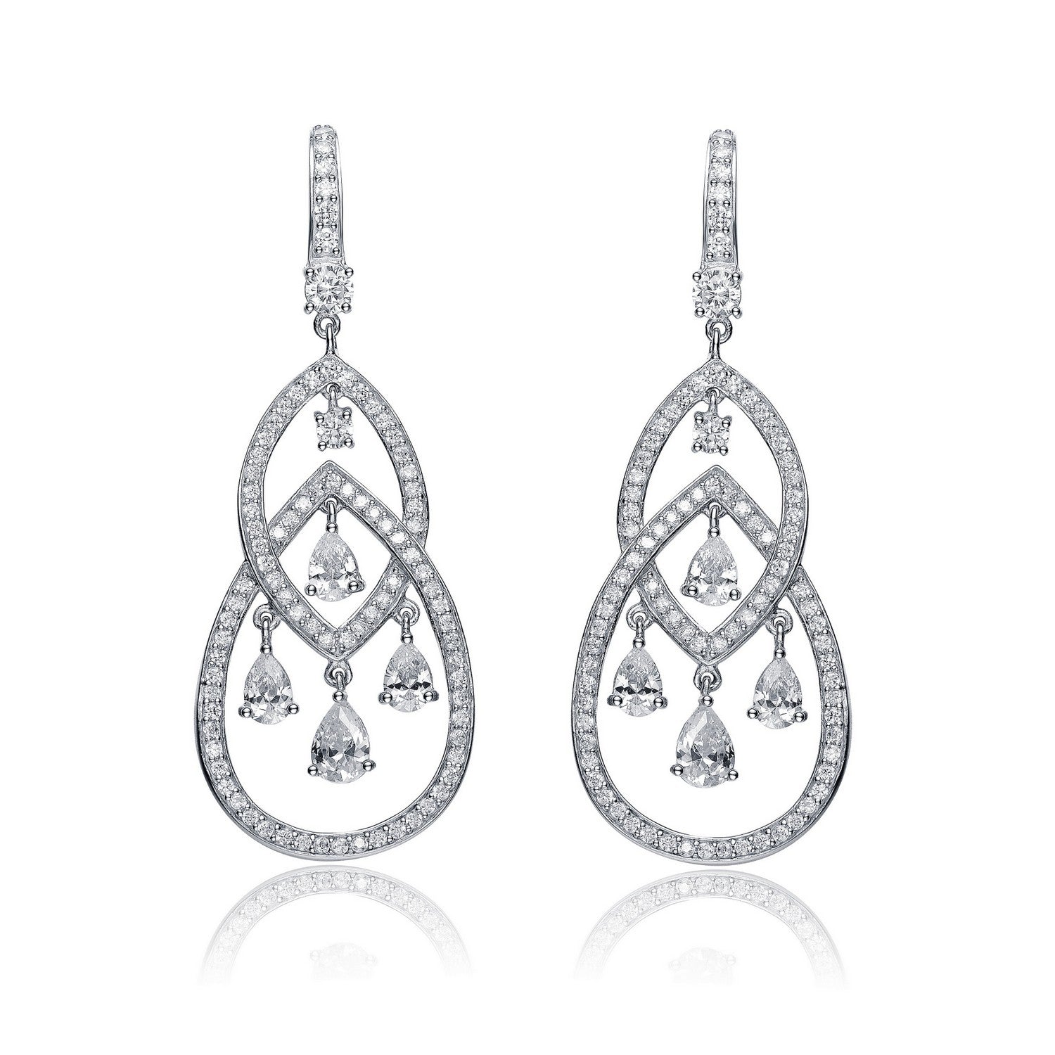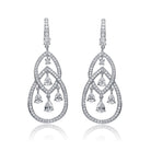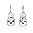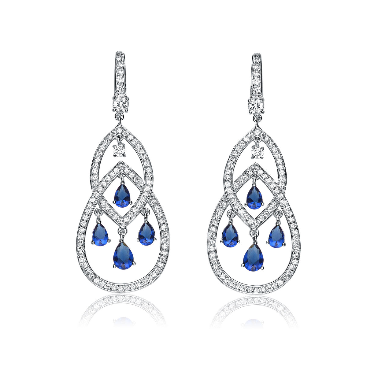 Classy .925 Sterling silver multi shaped cubic zirconia double teardrop chandelier earrings. These stunning earrings feature clear pear and round cut cubic zirconia stones dangling between marquise and pear shapes set with clear cubic zirconia stones as well. Crafted of .925 Sterling silver White Gold plating and secure with butterfly closure. This earring is available in White, Sapphire.
