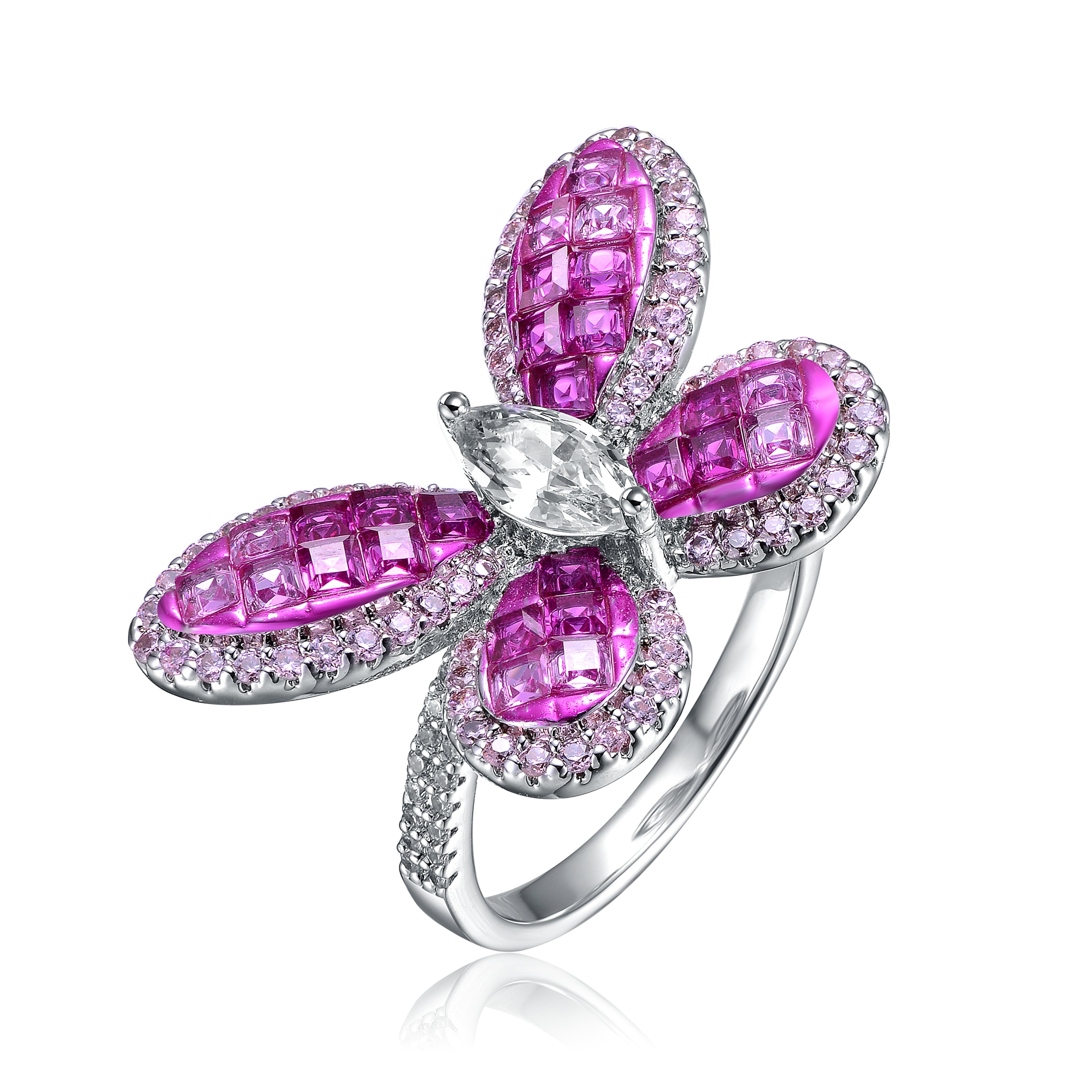 Stylish Sterling Silver with Rhodium Plated and Ruby Red Cubic Zirconia Butterfly Ring. This beautiful ring features butterfly shape made out of silver and wings made out of ruby princess cut cubic zirconia stones and marquise clear round cubic zirconia stones in the center, accented with small clear round cubic zirconia stones paved on the frame. Crafted of Sterling Silver with Rhodium Plating and it is available in ruby or sapphire, sizes 6, 7 or 8. This item also makes a sensational gift for a special birthday or occasion.