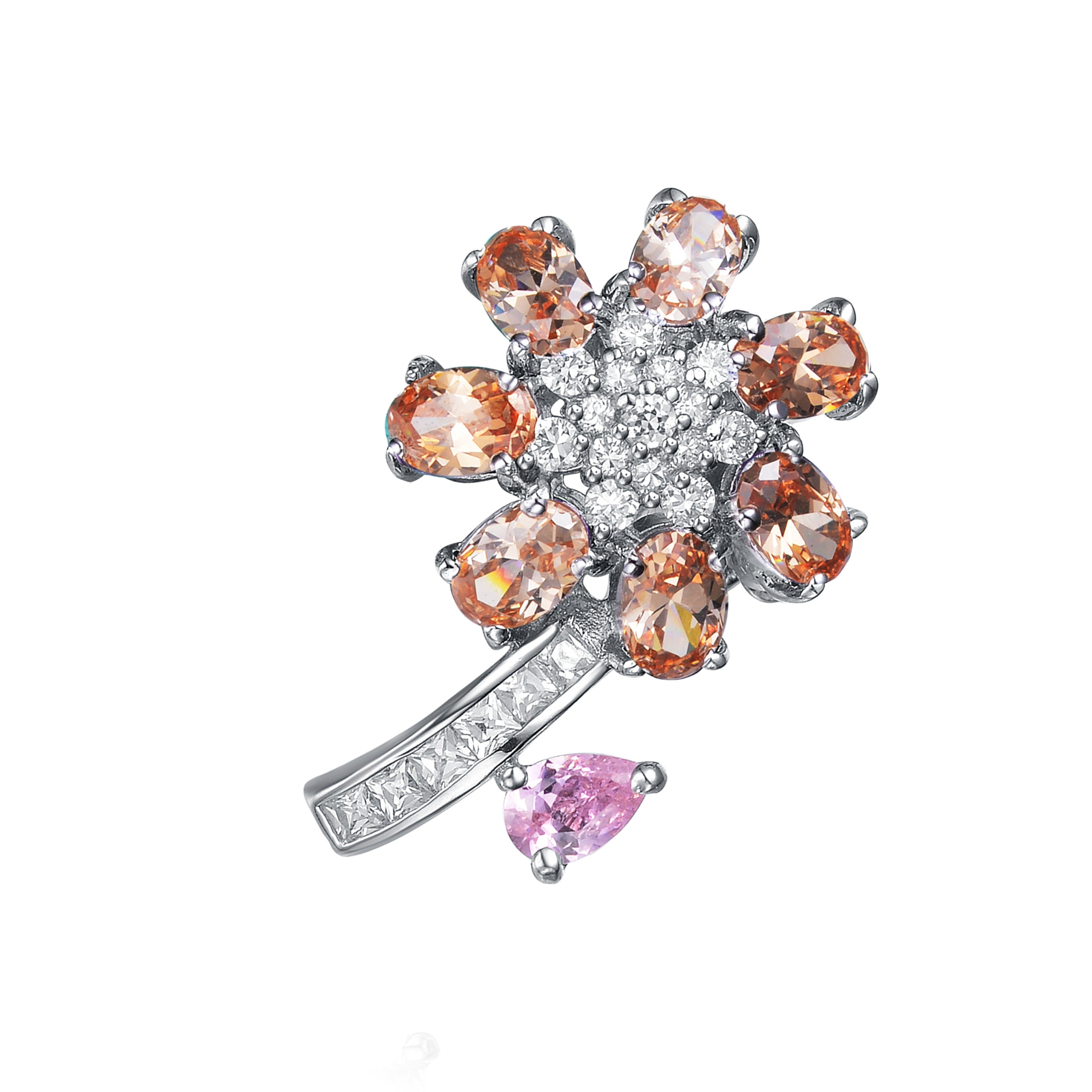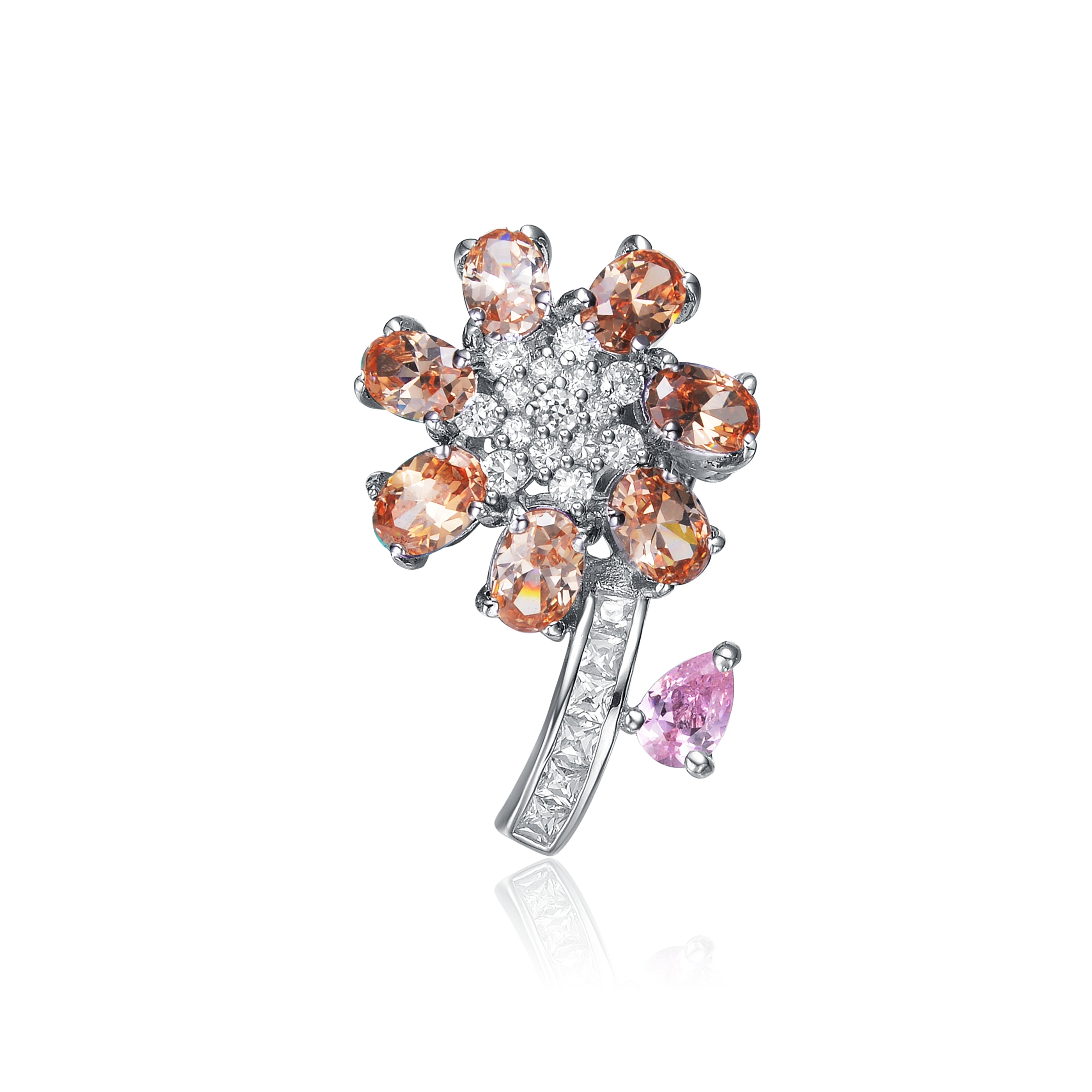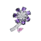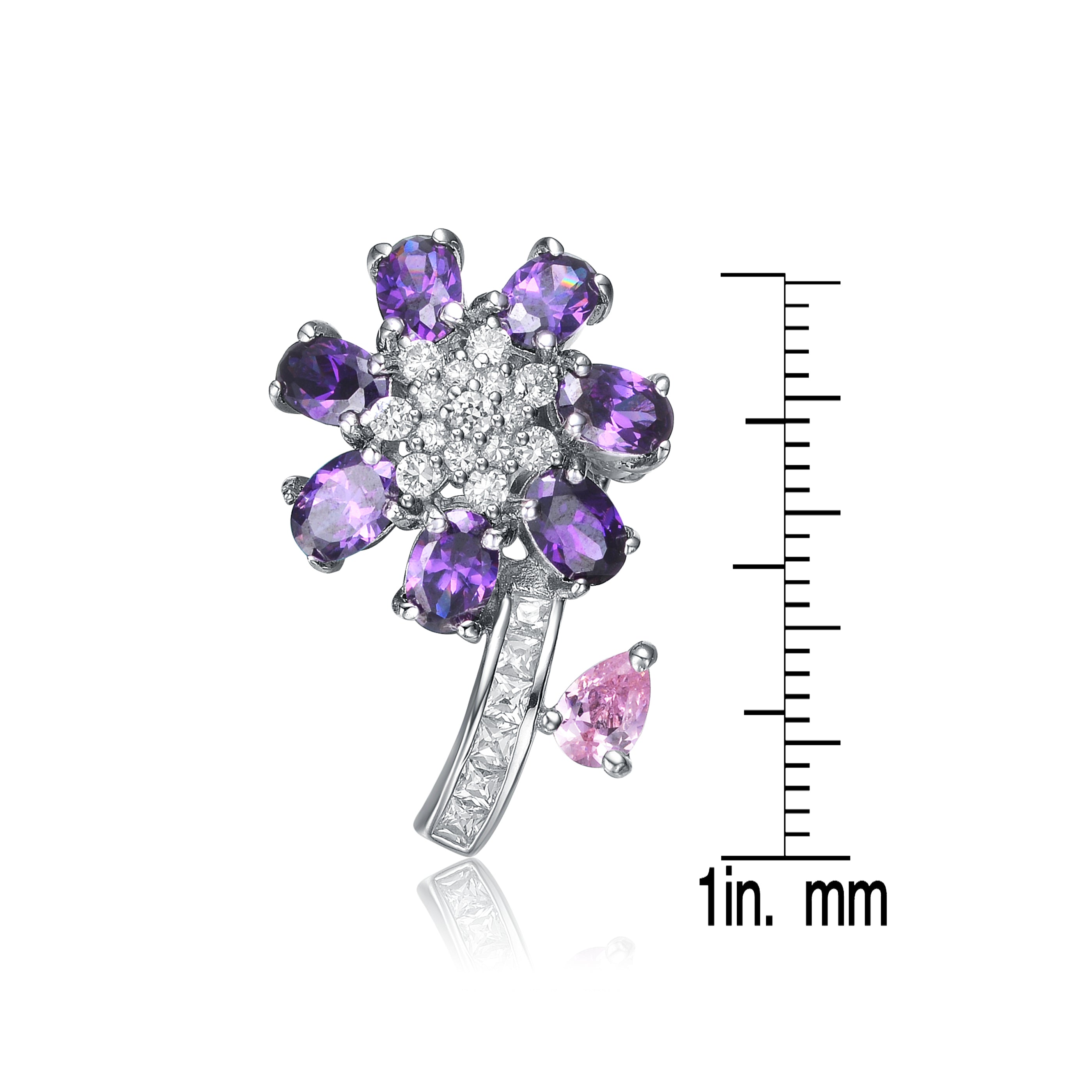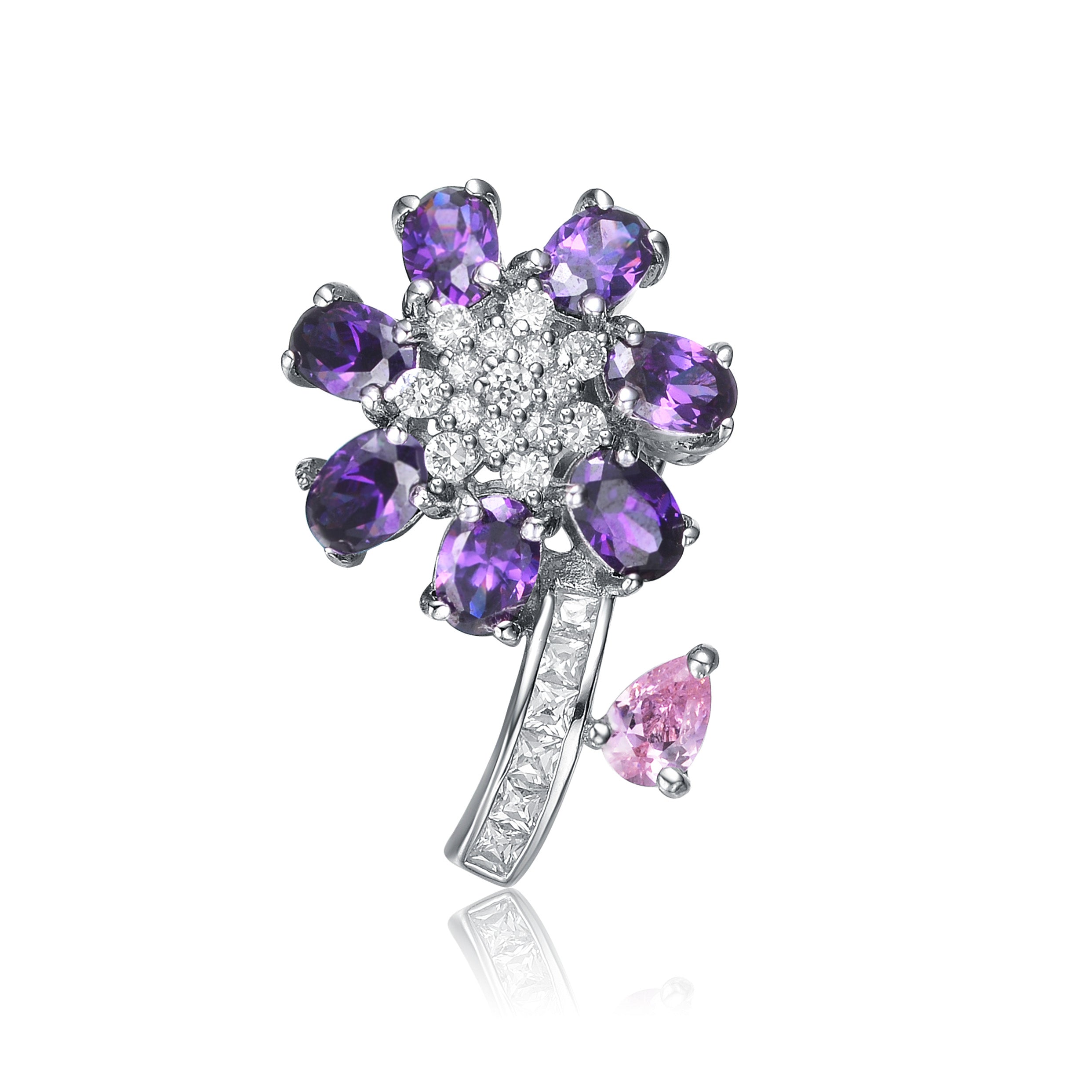 This is a lovely sterling silver pin with a flower design. The design features a very detailed delicate flower with small pink cubic zirconia stone in the middle of violet colored petals; the stem and the leaf is made of dazzling zirconium stones. Also available in orange color.